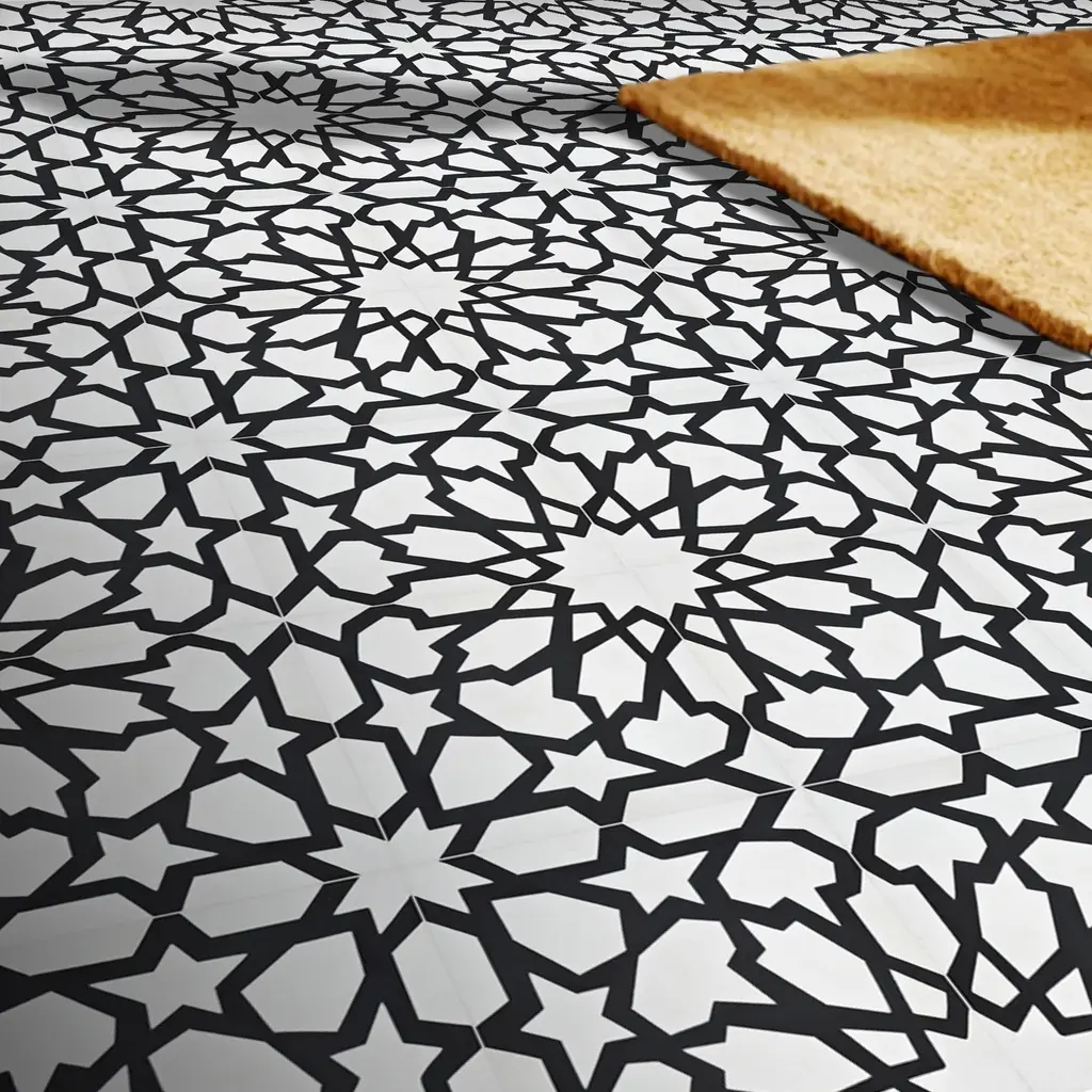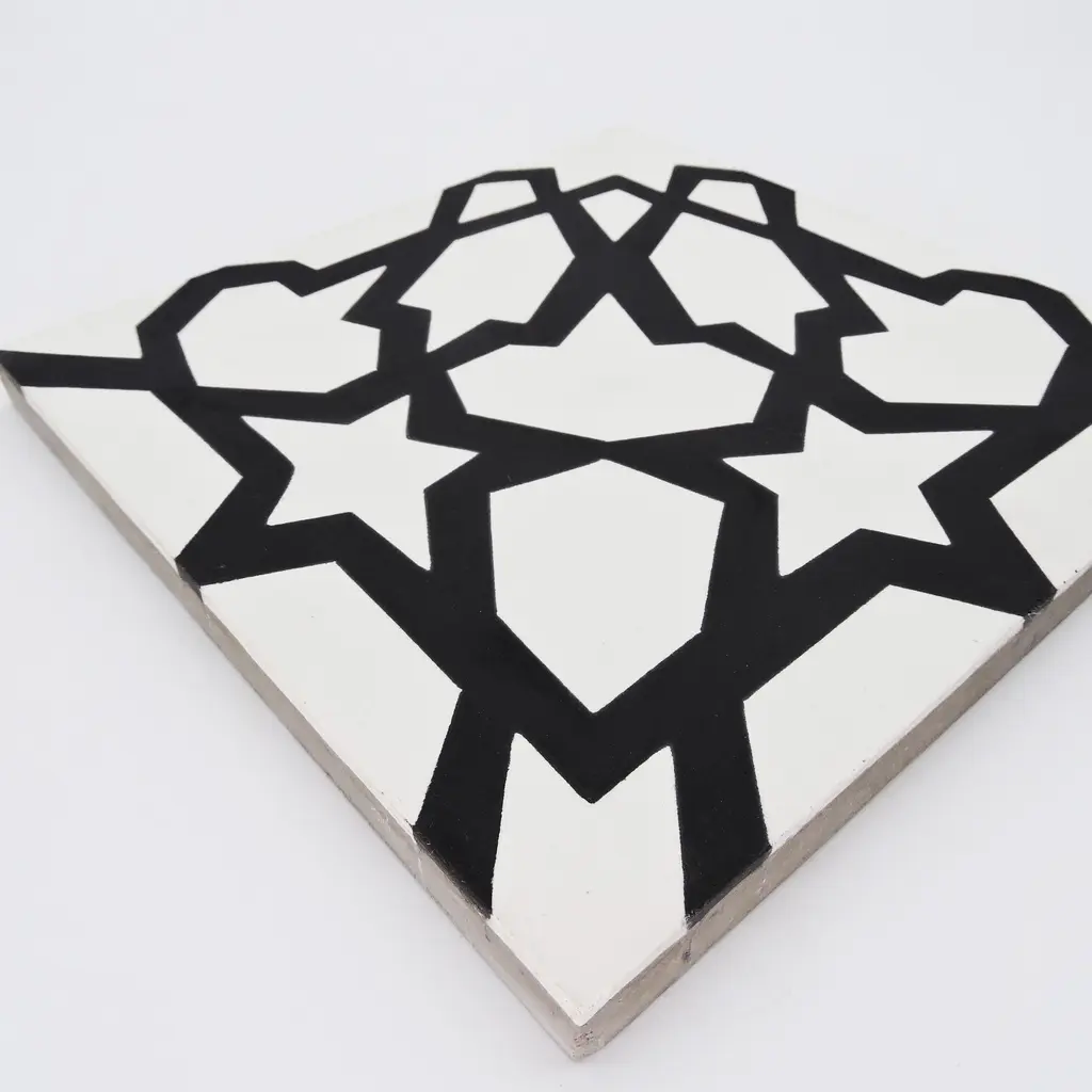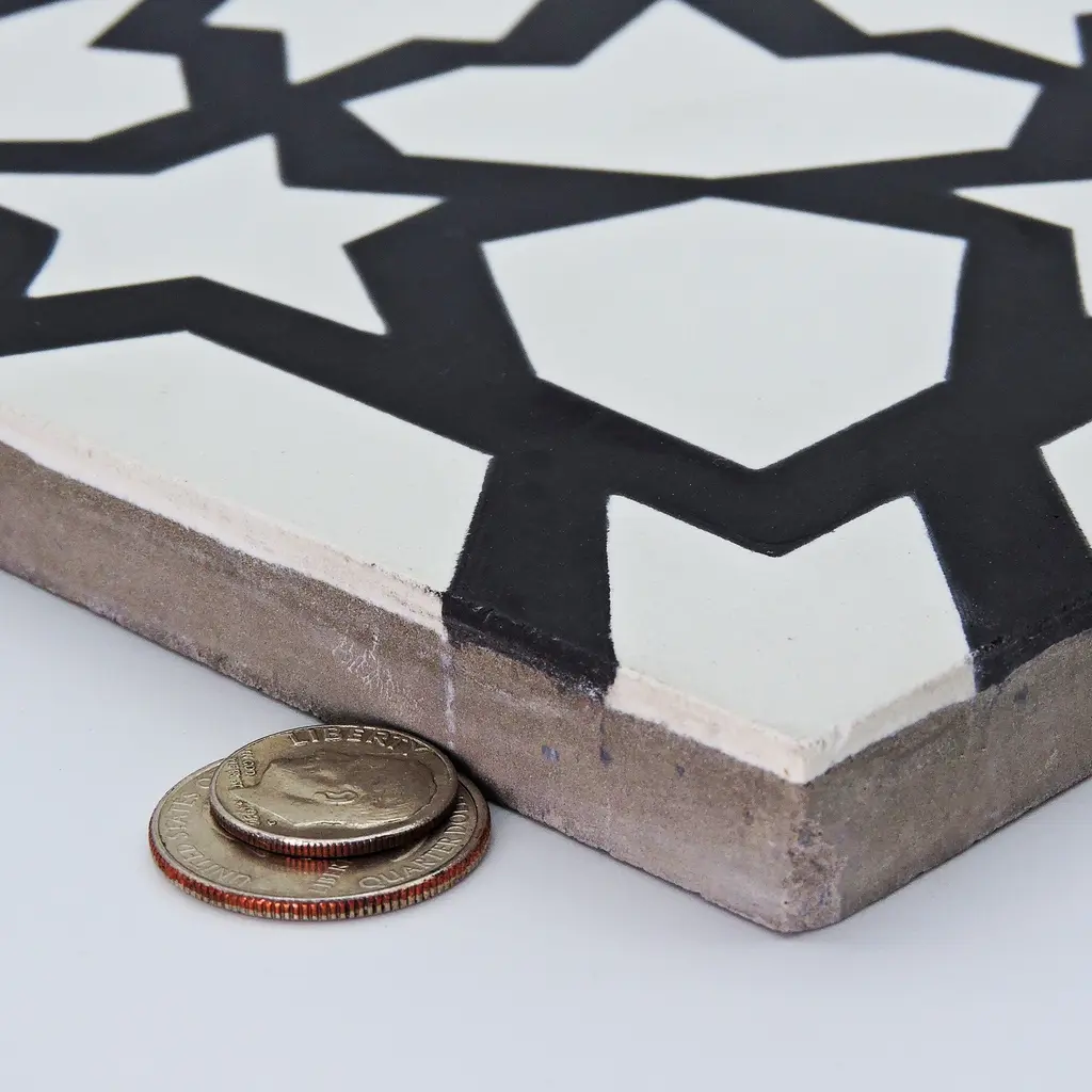 Transform any indoor or outdoor space with these stunning Bahja tiles, handmade from cement and granite to create a durable and low maintenance flooring solution. The black and white geometric pattern offers a pleasing aesthetic that is both stylish and environmentally responsible. With 2.3 tiles per square foot, each box contains 12 tiles perfect for adding a touch of Moroccan artistry to your home. Professional installation is recommended.Features:Story Behind the Art: "It's more than tile, it's art." That simple statement is what sets the craftsmanship of Moroccan Mosaic apart from the rest. Based in the small city of Sale, Moroccan Mosaic is a family business going back 4 generations. When Simo, the current head of the business graduated from university in New York, he had little interest in the family business. But on a return trip home, he saw that the business was not doing well and set about reviving it. One important change he made was introducing black, grey, and white designs to appeal to American and European customers. It worked. When he started, they employed 2 workers and now they have nearly 80 on staff. The workshop itself is fairly simple, and the techniques used to create the tiles are steeped in tradition. Some modern equipment is available, though the workers prefer to use the more rustic tools. The creative process is time intensive and done by hand, as Simo insists on no corners be cut or production be rushed. Environmentally responsible and resource efficient, no chemicals are used at any step. For example, colors used come from nature literally. Green comes from mint leaves, orange from orange peel, and black from charcoal. The tiles themselves are a simple mixture of cement, sand, and granite powder. Moroccan Mosaic hires only local workers, teaching them a valued skill as well as paying them fair wages. Simo's goals for his business are to share the tradition of gorgeous Moroccan tile, grow the business, and employ more and more workers.
