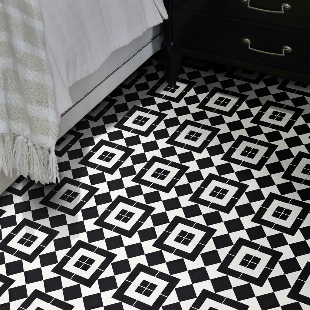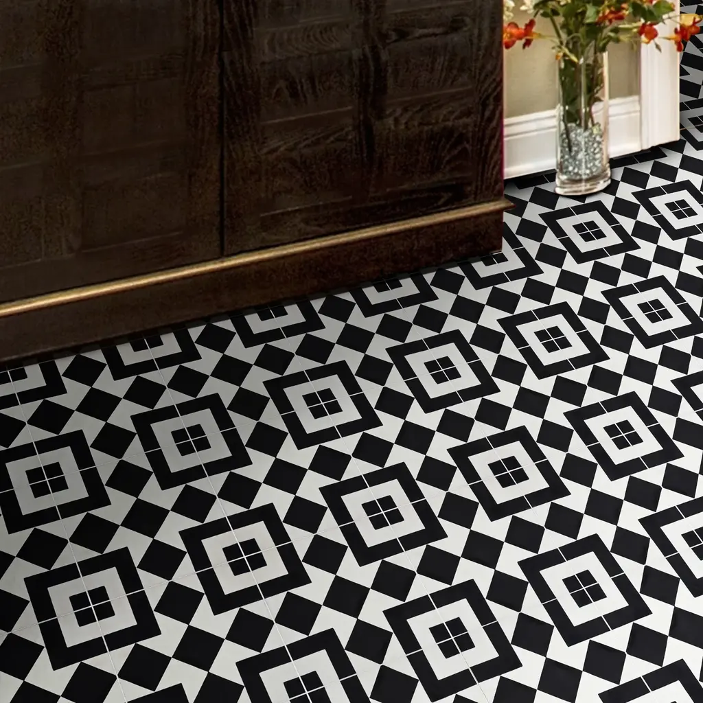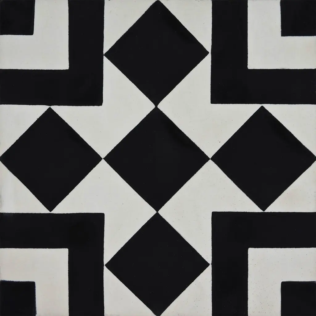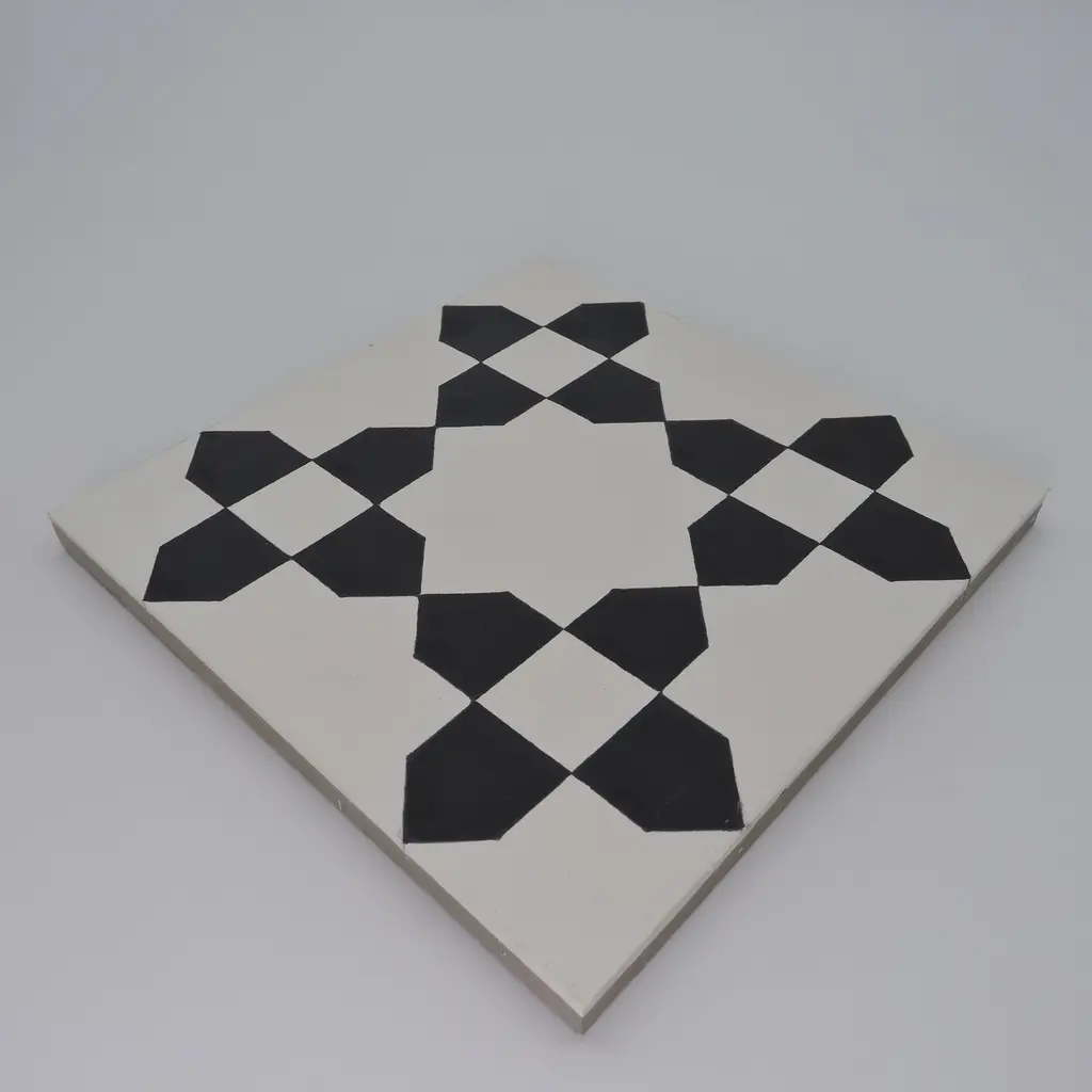 Replace your old, floor or wall tile with this pack of twelve cement tiles. Handmade in Morocco with a unique geometric design in a combination of white and black colors, these tiles are sure to liven up any living space. Product Features:Story Behind the Art:"It's more than tile, it's art." That simple statement is what sets the craftsmanship of Moroccan Mosaic apart from the rest. Based in the small city of Sale, Moroccan Mosaic is a family business going back 4 generations. When Simo, the current head of the business graduated from university in New York, he had little interest in the family business. But on a return trip home, he saw that the business was not doing well and set about reviving it. One important change he made was introducing black, grey, and white designs to appeal to American and European customers. It worked. When he started, they employed 2 workers and now they have nearly 80 on staff. The workshop itself is fairly simple, and the techniques used to create the tiles are steeped in tradition. Some modern equipment is available, though the workers prefer to use the more rustic tools. The creative process is time intensive and done by hand, as Simo insists on no corners be cut or production be rushed. Environmentally responsible and resource efficient, no chemicals are used at any step. For example, colors used come from nature literally. Green comes from mint leaves, orange from orange peel, and black from charcoal. The tiles themselves are a simple mixture of cement, sand, and granite powder. Moroccan Mosaic hires only local workers, teaching them a valued skill as well as paying them fair wages. Simo's goals for his business are to share the tradition of gorgeous Moroccan tile, grow the business, and employ more and more workers.