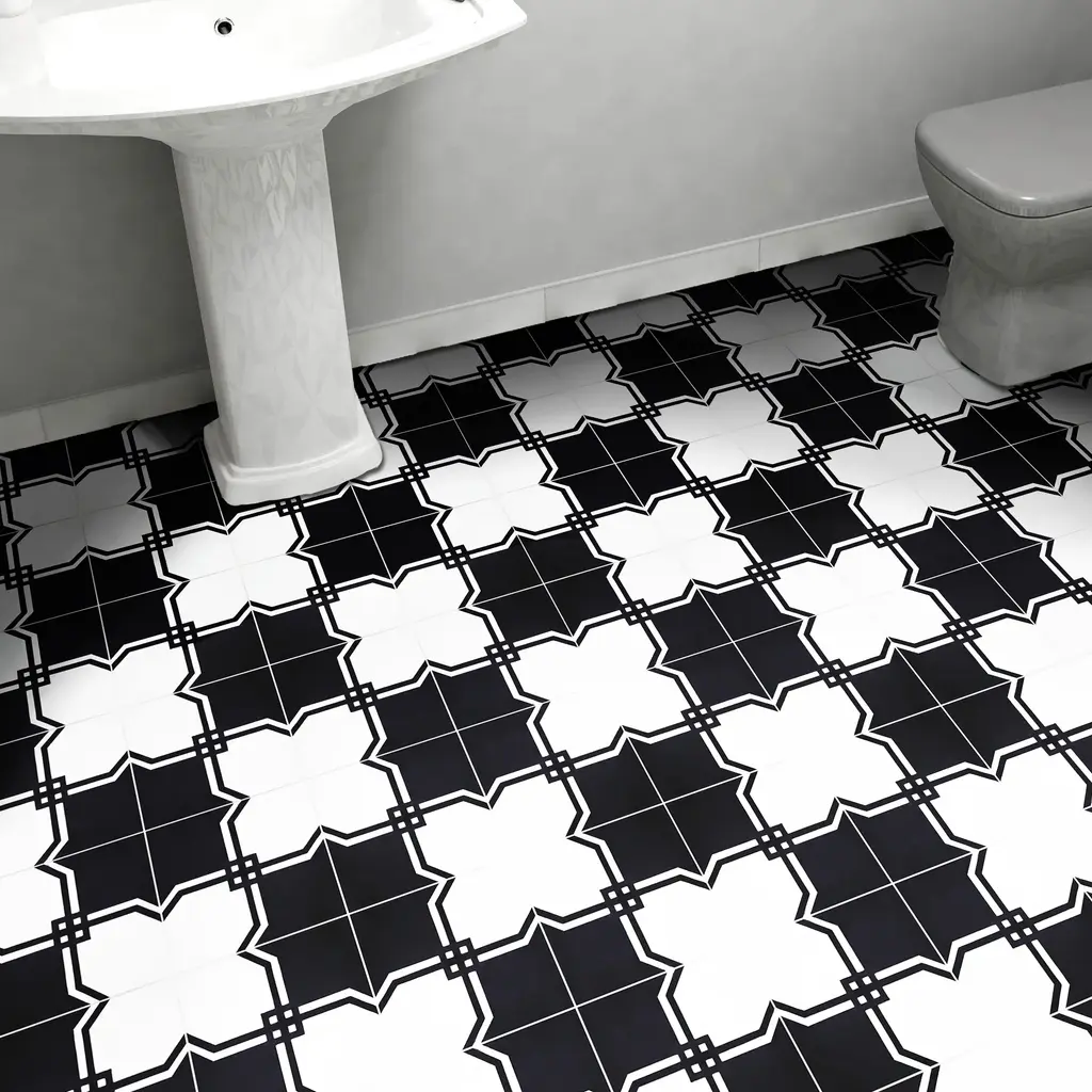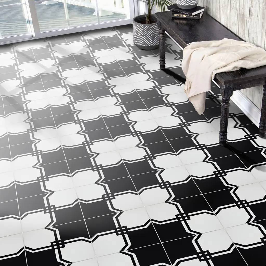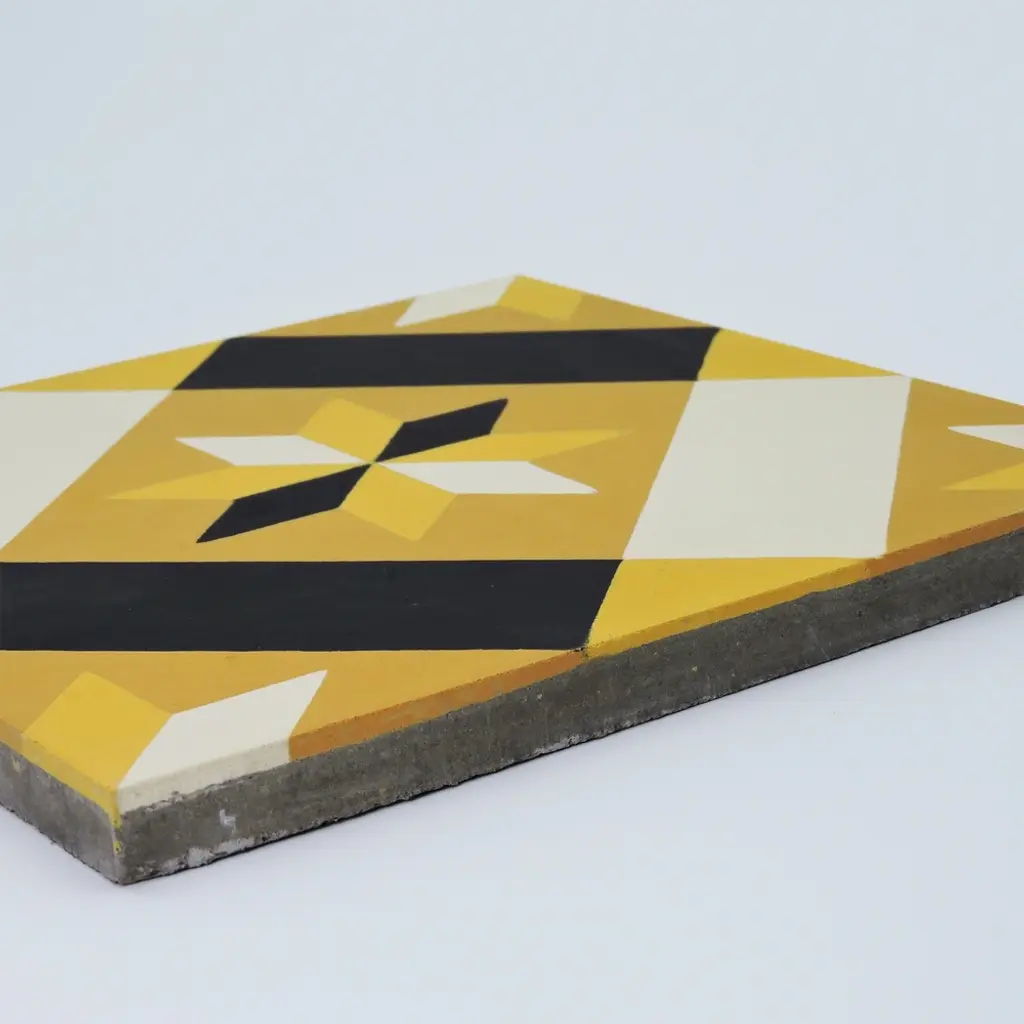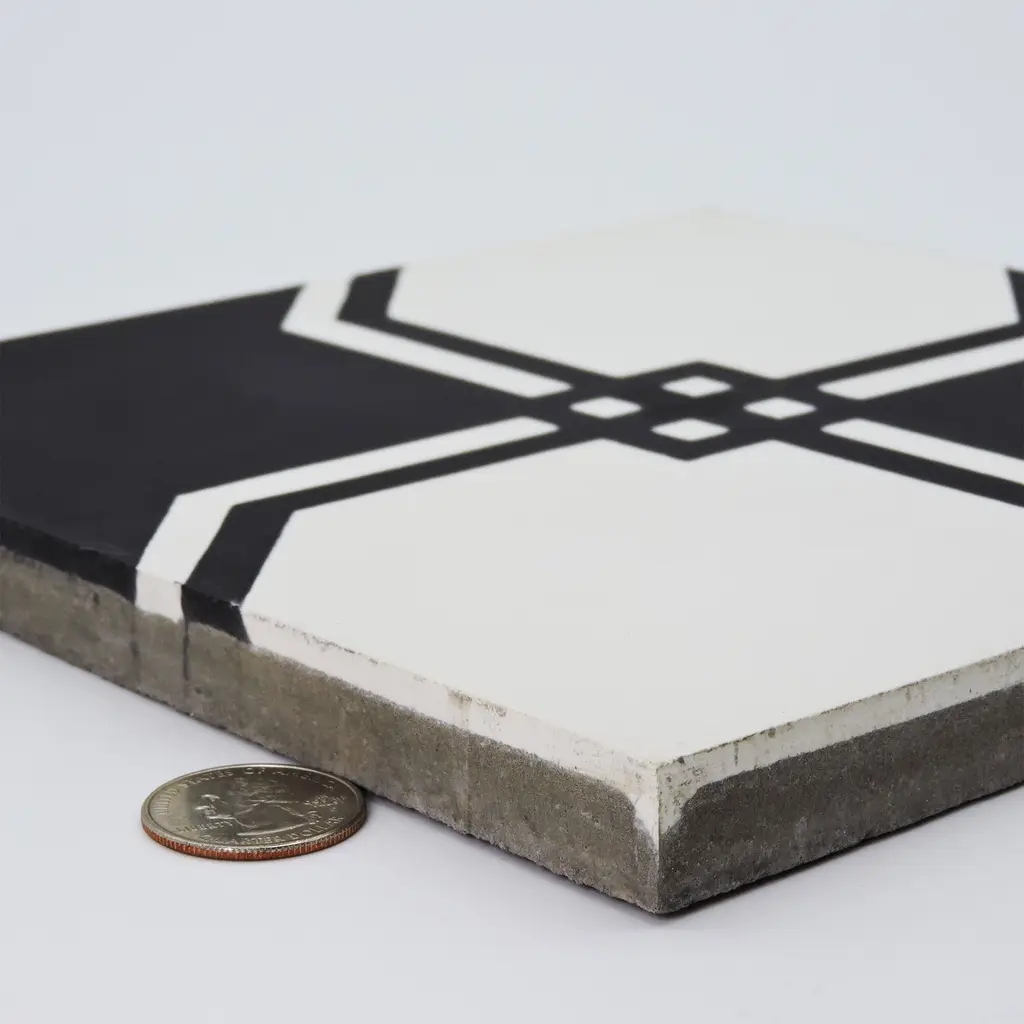 Add style to your bathroom or kitchen with these cement tiles. Featuring a black and white geometric pattern that suits both contemporary and traditional home decors, these tiles are handmade for superior quality. The cement tiles are durable and weather resistant, making them suitable for both indoor or outdoor spaces.Features:Story Behind the Art: "It's more than tile, it's art." That simple statement is what sets the craftsmanship of Moroccan Mosaic apart from the rest. Based in the small city of Sale, Moroccan Mosaic is a family business going back 4 generations. When Simo, the current head of the business graduated from university in New York, he had little interest in the family business. But on a return trip home, he saw that the business was not doing well and set about reviving it. One important change he made was introducing black, grey, and white designs to appeal to American and European customers. It worked. When he started, they employed 2 workers and now they have nearly 80 on staff. The workshop itself is fairly simple, and the techniques used to create the tiles are steeped in tradition. Some modern equipment is available, though the workers prefer to use the more rustic tools. The creative process is time intensive and done by hand, as Simo insists on no corners be cut or production be rushed. Environmentally responsible and resource efficient, no chemicals are used at any step. For example, colors used come from nature literally. Green comes from mint leaves, orange from orange peel, and black from charcoal. The tiles themselves are a simple mixture of cement, sand, and granite powder. Moroccan Mosaic hires only local workers, teaching them a valued skill as well as paying them fair wages. Simo's goals for his business are to share the tradition of gorgeous Moroccan tile, grow the business, and employ more and more workers .