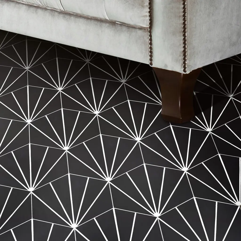 Replace your old, drab bathroom tile with this pack of twelve cement tiles. Handmade in Morocco with a unique geometric design in a combination of Black and White colors, these tiles are sure to liven up any living space. Features:When ordering a box(8x9), 12 tiles come included. Sample is just 1 tile, max of 4 samples allowedThe handcrafted touch of artisan skill will create variations in color, size, and design. Color differences may occur between the actual product and your computer screen. If buying two of the same item, slight differences will occur from piece to piece. Story Behind the Art:"It's more than tile, it's art." That simple statement is what sets the craftsmanship of Moroccan Mosaic apart from the rest. Based in the small city of Sale, Moroccan Mosaic is a family business going back 4 generations. When Samad, the current head of the business graduated from university in New York, he had little interest in the family business. But on a return trip home, he saw that the business was not doing well and set about reviving it. One important change he made was introducing black, grey, and white designs to appeal to American and European customers. It worked. When he started, they employed 2 workers and now they have nearly 80 on staff. The workshop itself is fairly simple, and the techniques used to create the tiles are steeped in tradition. Some modern equipment is available, though the workers prefer to use the more rustic tools. The creative process is time intensive and done by hand, as Samad insists on no corners be cut or production be rushed. Environmentally responsible and resource efficient, no chemicals are used at any step. For example, colors used come from nature -- literally. Green comes from mint leaves, orange from orange peel, and black from charcoal. The tiles themselves are a simple mixture of cement, sand, and granite powder. Moroccan Mosaic hires only local workers, teaching them a valued skill as well as paying them fair wages. Samad's goals for his business are to share the tradition of gorgeous Moroccan tile, grow the business, and employ more and more workers.The handcrafted touch of artisan skill will create variations in color, size and design. Color differences may occur between the actual product and your computer screen. If buying two of the same item, slight differences will occur from piece to piece.ImportedPlease be aware that if you order more than 151 pounds of tile or flooring, the order may need to be shipped Freight and our Oversized Item Delivery/Return policy will apply. Please click here for more information.