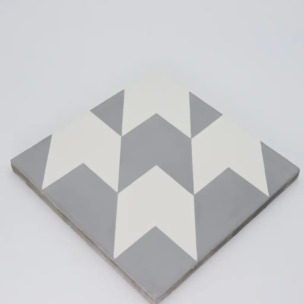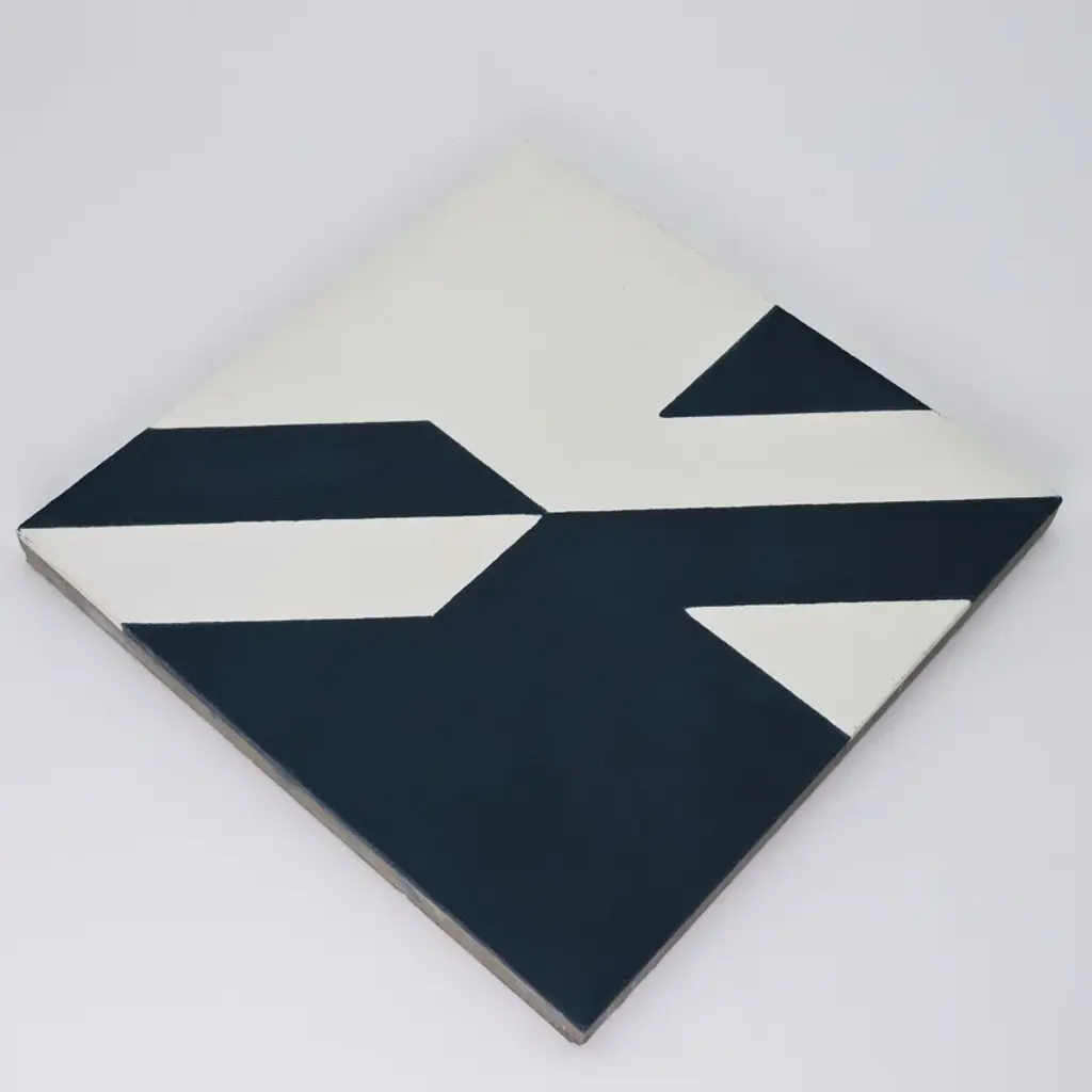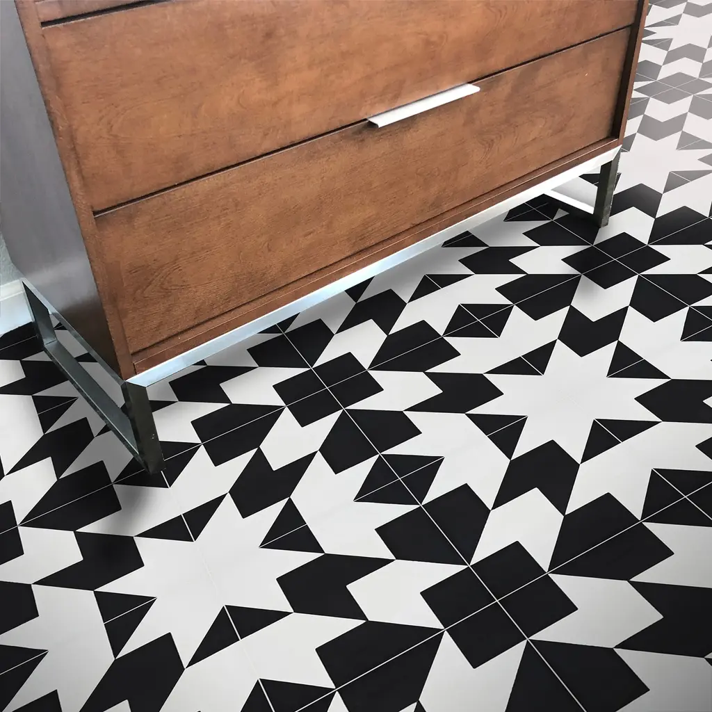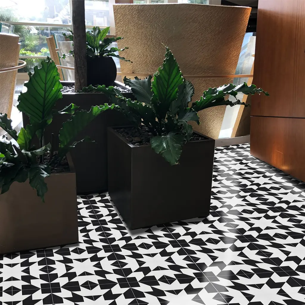 Oujda is a compelling and psychedelic cement tile. Its black and white colors design a captivating and refreshing effect. Its futuristic and kaleidoscopic pattern will add a distinct perspective to any room. Oujda is an alluring tile that will add an entertaining and lively feeling to your home. Features:Story Behind the Art: "It's more than tile, it's art." That simple statement is what sets the craftsmanship of Moroccan Mosaic apart from the rest. Based in the small city of Sale, Moroccan Mosaic is a family business going back 4 generations. When Simo, the current head of the business graduated from university in New York, he had little interest in the family business. But on a return trip home, he saw that the business was not doing well and set about reviving it. One important change he made was introducing black, grey, and white designs to appeal to American and European customers. It worked. When he started, they employed 2 workers and now they have nearly 80 on staff. The workshop itself is fairly simple, and the techniques used to create the tiles are steeped in tradition. Some modern equipment is available, though the workers prefer to use the more rustic tools. The creative process is time intensive and done by hand, as Simo insists on no corners be cut or production be rushed. Environmentally responsible and resource efficient, no chemicals are used at any step. For example, colors used come from nature literally. Green comes from mint leaves, orange from orange peel, and black from charcoal. The tiles themselves are a simple mixture of cement, sand, and granite powder. Moroccan Mosaic hires only local workers, teaching them a valued skill as well as paying them fair wages. Simo's goals for his business are to share the tradition of gorgeous Moroccan tile, grow the business, and employ more and more workers.