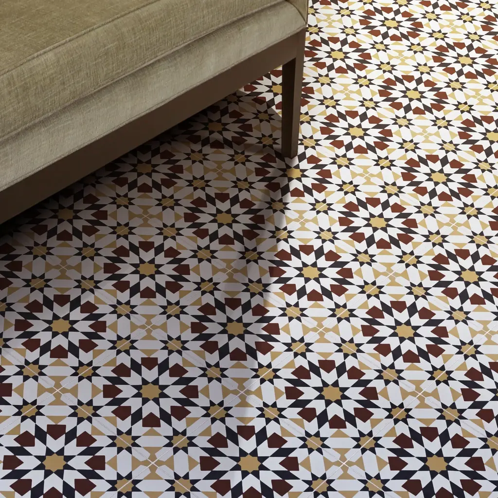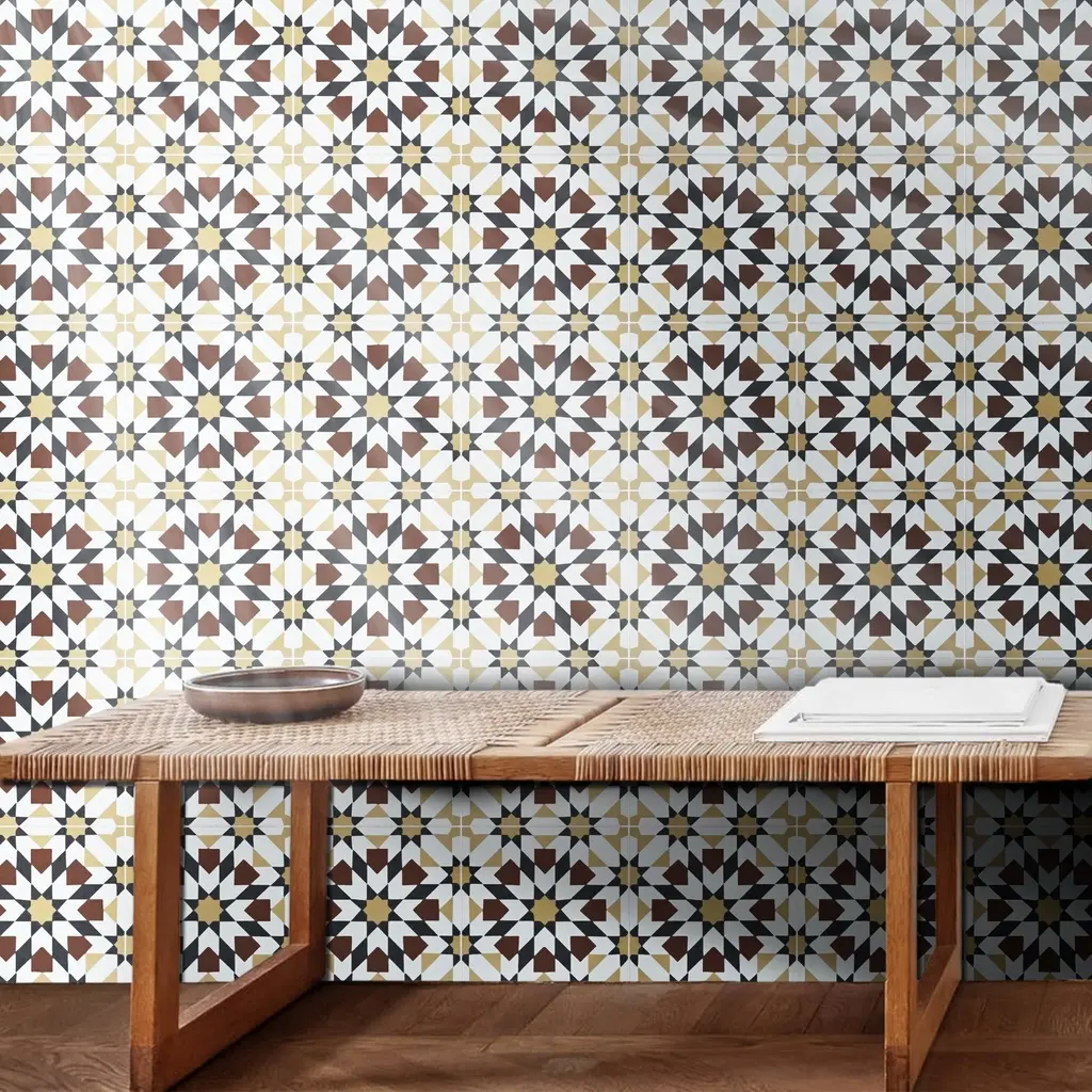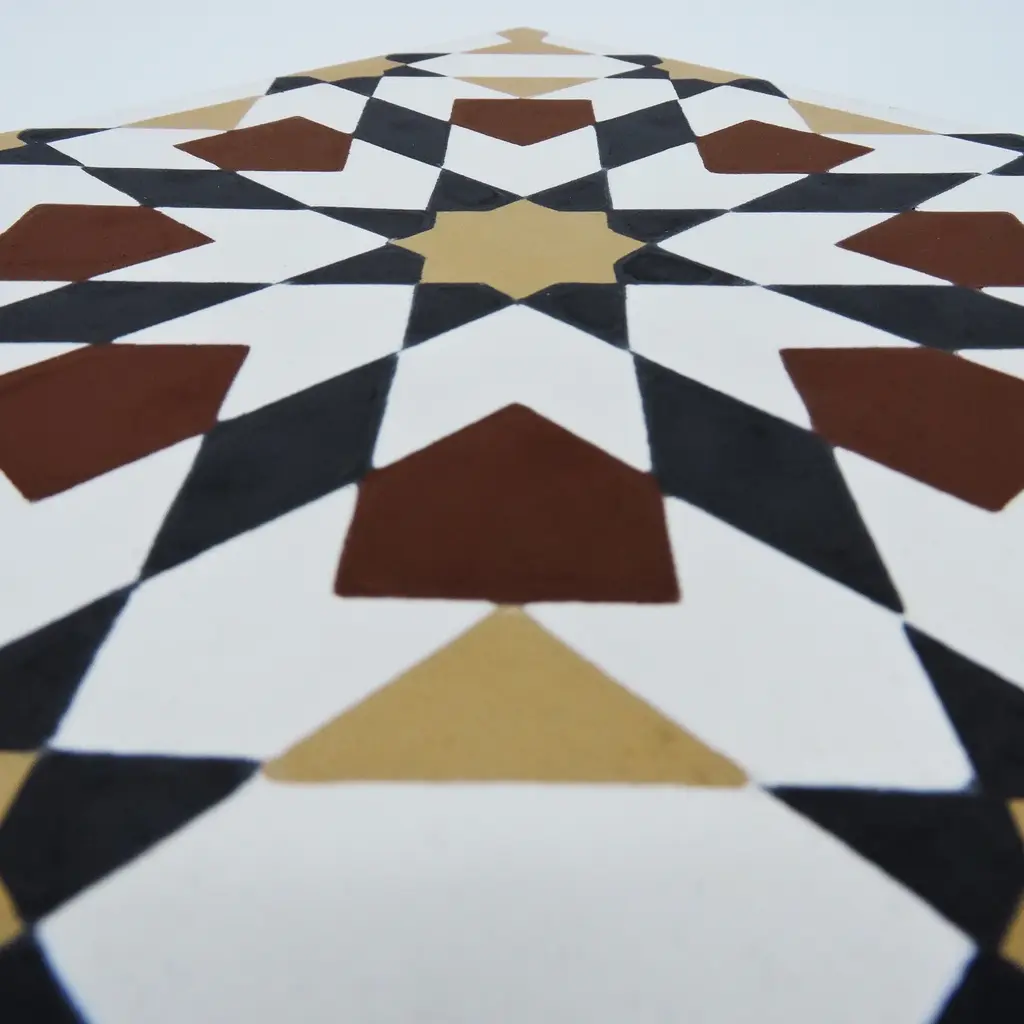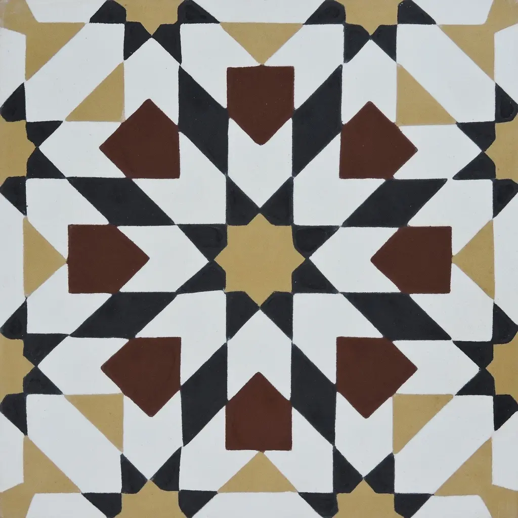 Tamaris is an authentic cement tile that includes both traditional Moroccan culture and modernity. Its design and pattern will go well with any style trying to be achieved. Its white, black, and brown colors will offer a rustic ambience. Tamaris is suitable for walls and floors in your home.Features:- Crafted in Morocco- Moroccan Mosaic and Tile House Brand- Floor and Wall tiles- Eco-friendly- Handmade- Cement, Granite- Brown, Black, Off-White- Installation: Easy to install; It is recommended you purchase a minimum of 10% overage to account for design cuts and installation purposes.- Commercial and Residential use.- Outdoor or Indoor Use .- 2.3 tiles per square foot- Pack of 12 tiles when ordering a box (8x8), Sample is 1 tile only- 5.22 square feet per box- Tile measures 8 inches long x 8 inches wide x 0.5 inches thick