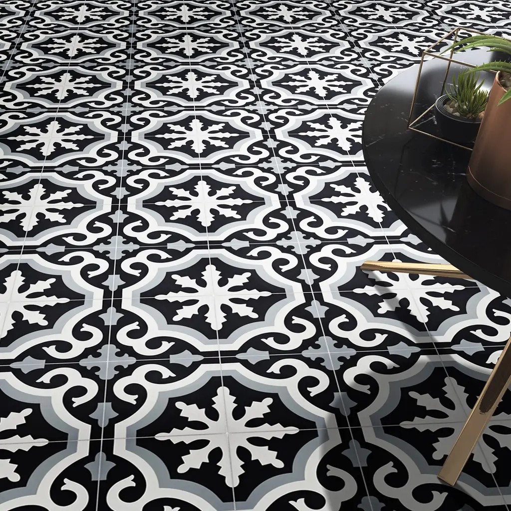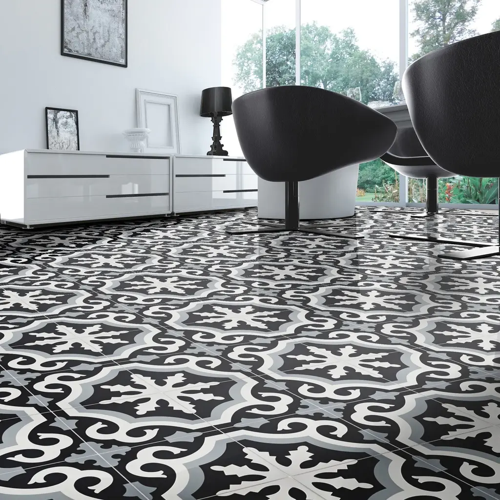 Enjoy exotic Moorish design in your home with this convenient set of twelve floor and wall tiles. Each piece is made of cement and granite for remarkable resistance to daily use and wear, you can use it indoor and outdoor areas for maximum handiness. The traditional and eco-friendly production process of these tiles also ensures environmental responsibility and easy home care.Features:· Story Behind the Art: "It's more than tile, it's art." That simple statement is what sets the craftsmanship of Moroccan Mosaic apart from the rest. Based in the small city of Sale, Moroccan Mosaic is a family business going back 4 generations. When Simo, the current head of the business graduated from university in New York, he had little interest in the family business. But on a return trip home, he saw that the business was not doing well and set about reviving it. One important change he made was introducing black, grey, and white designs to appeal to American and European customers. It worked. When he started, they employed 2 workers and now they have nearly 80 on staff. The workshop itself is fairly simple, and the techniques used to create the tiles are steeped in tradition. Some modern equipment is available, though the workers prefer to use the more rustic tools. The creative process is time intensive and done by hand, as Simo insists on no corners be cut or production be rushed. Environmentally responsible and resource efficient, no chemicals are used at any step. For example, colors used come from nature literally. Green comes from mint leaves, orange from orange peel, and black from charcoal. The tiles themselves are a simple mixture of cement, sand, and granite powder. Moroccan Mosaic hires only local workers, teaching them a valued skill as well as paying them fair wages. Simo's goals for his business are to share the tradition of gorgeous Moroccan tile, grow the business, and employ more and more workers.