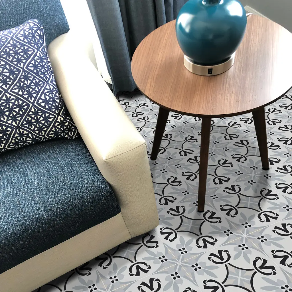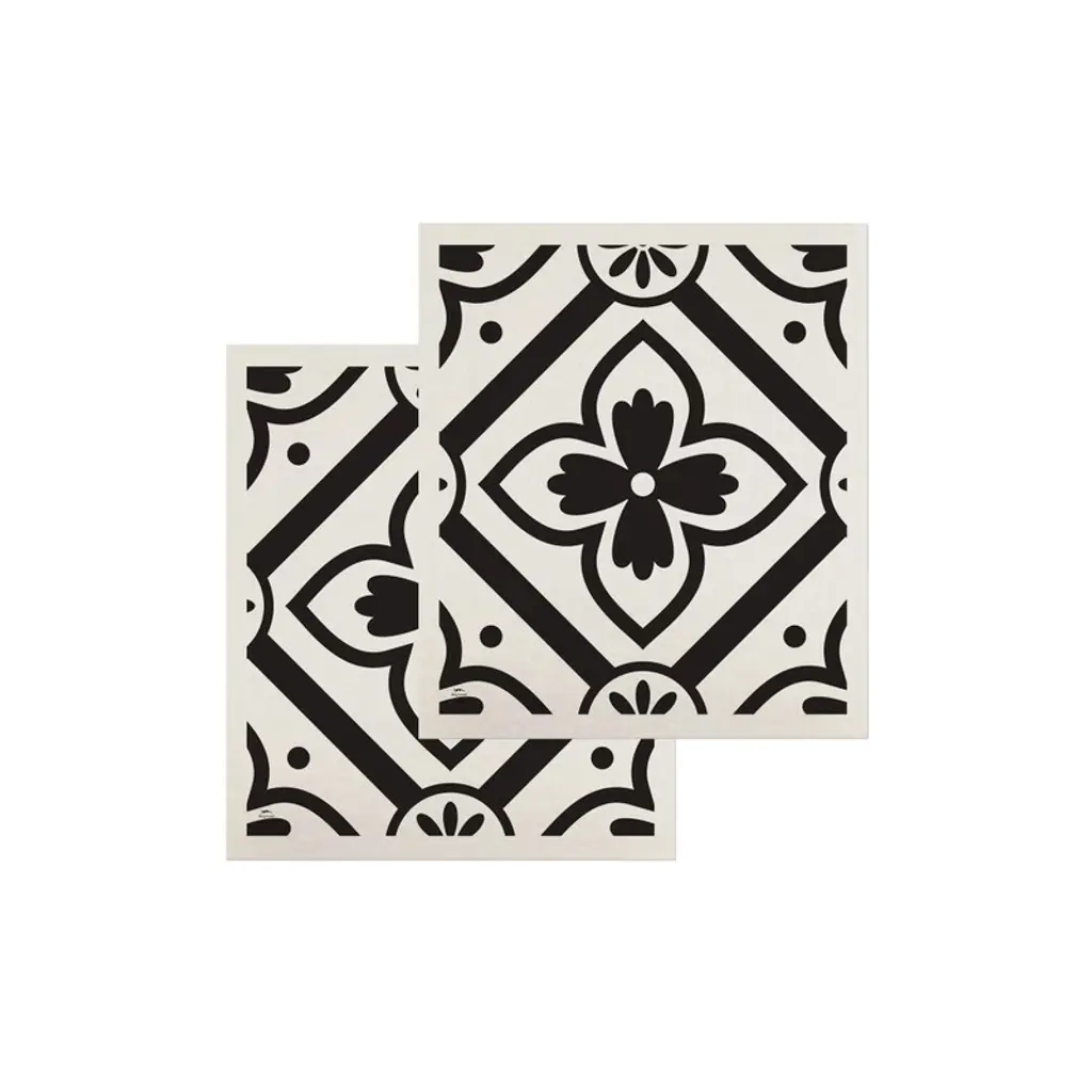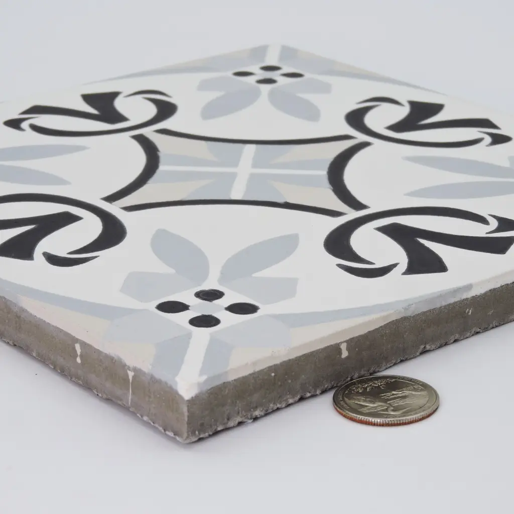 Replace your old, floor or wall tile with this pack of twelve cement tiles. Handmade in Morocco with a unique geometric design in a combination of white, grey, black, and a hint of beige colors, these tiles are sure to liven up any living space. Each tile measures eight inches square that all together cover a surface area of 5.22 square feet. Product Features: Features:Story Behind the Art: "It's more than tile, it's art." That simple statement is what sets the craftsmanship of Moroccan Mosaic apart from the rest. Based in the small city of Sale, Moroccan Mosaic is a family business going back 4 generations. When Simo, the current head of the business graduated from university in New York, he had little interest in the family business. But on a return trip home, he saw that the business was not doing well and set about reviving it. One important change he made was introducing black, grey, and white designs to appeal to American and European customers. It worked. When he started, they employed 2 workers and now they have nearly 80 on staff. The workshop itself is fairly simple, and the techniques used to create the tiles are steeped in tradition. Some modern equipment is available, though the workers prefer to use the more rustic tools. The creative process is time intensive and done by hand, as Samad insists on no corners be cut or production be rushed. Environmentally responsible and resource efficient, no chemicals are used at any step. For example, colors used come from nature literally. Green comes from mint leaves, orange from orange peel, and black from charcoal. The tiles themselves are a simple mixture of cement, sand, and granite powder. Moroccan Mosaic hires only local workers, teaching them a valued skill as well as paying them fair wages. Samad's goals for his business are to share the tradition of gorgeous Moroccan tile, grow the business, and employ more and more workers. The handcrafted touch of artisan skill will create variations in color, size and design. Color differences may occur between the actual product and your computer screen. If buying two of the same item, slight differences will occur from piece to piece. Imported Please be aware that if you order more than 151 pounds of tile or flooring, the order may need to be shipped Freight and our Oversized Item Delivery/Return policy will apply. Please click here for more information.