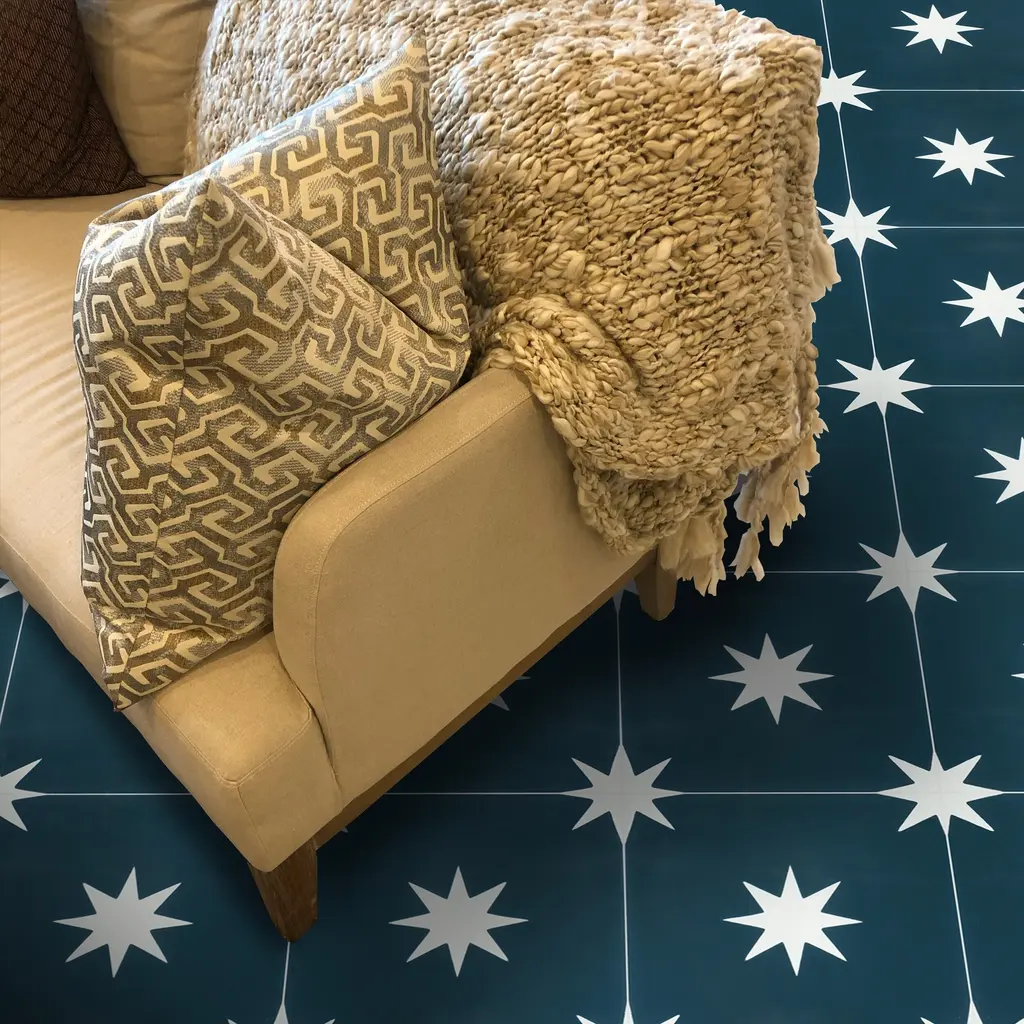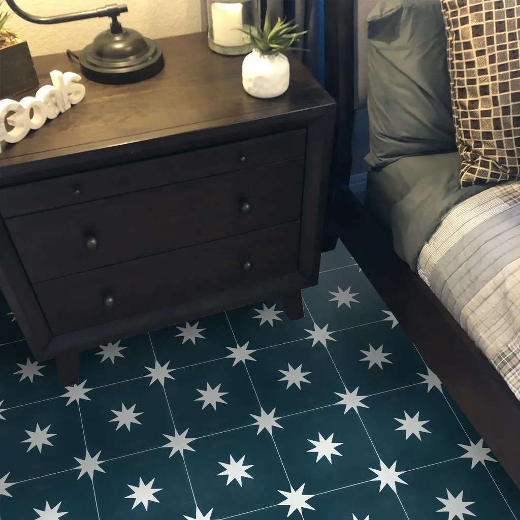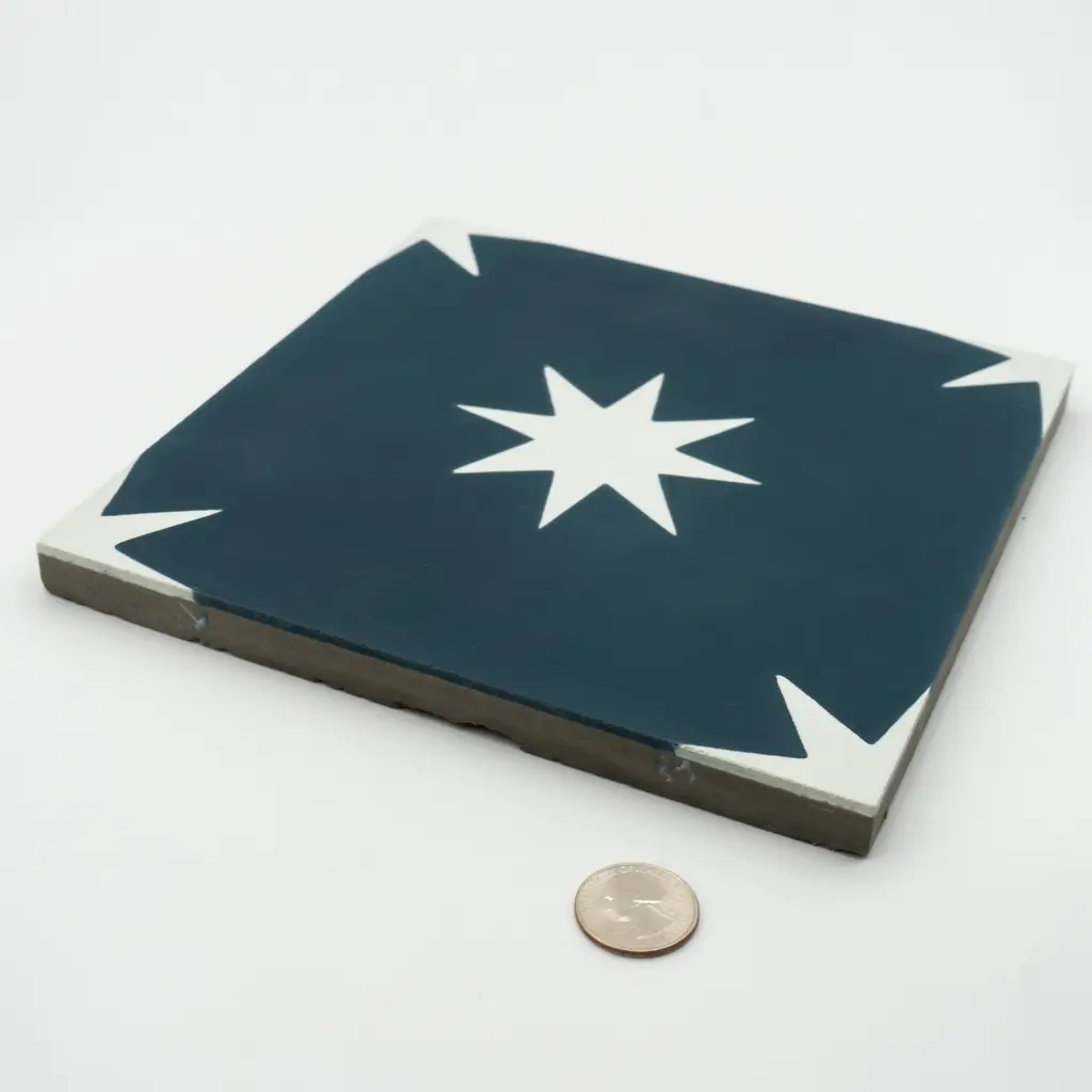 Transform your living space with this pack of twelve handmade cement tiles from Morocco. The unique geometric design in navy blue and white colors will add a touch of elegance to your floors or walls. Each tile measures eight inches square, and the pack covers 5.22 square feet of surface area. Made with eco-friendly materials and suitable for indoor or outdoor use, these decorative tiles are perfect for any style of home decor.Features:· Story Behind the Art: "It's more than tile, it's art." That simple statement is what sets the craftsmanship of Moroccan Mosaic apart from the rest. Based in the small city of Sale, Moroccan Mosaic is a family business going back 4 generations. When Simo, the current head of the business graduated from university in New York, he had little interest in the family business. But on a return trip home, he saw that the business was not doing well and set about reviving it. One important change he made was introducing black, grey, and white designs to appeal to American and European customers. It worked. When he started, they employed 2 workers and now they have nearly 80 on staff. The workshop itself is fairly simple, and the techniques used to create the tiles are steeped in tradition. Some modern equipment is available, though the workers prefer to use the more rustic tools. The creative process is time intensive and done by hand, as Simo insists on no corners be cut or production be rushed. Environmentally responsible and resource efficient, no chemicals are used at any step. For example, colors used come from nature literally. Green comes from mint leaves, orange from orange peel, and black from charcoal. The tiles themselves are a simple mixture of cement, sand, and granite powder. Moroccan Mosaic hires only local workers, teaching them a valued skill as well as paying them fair wages. Simo's goals for his business are to share the tradition of gorgeous Moroccan tile, grow the business, and employ more and more workers.