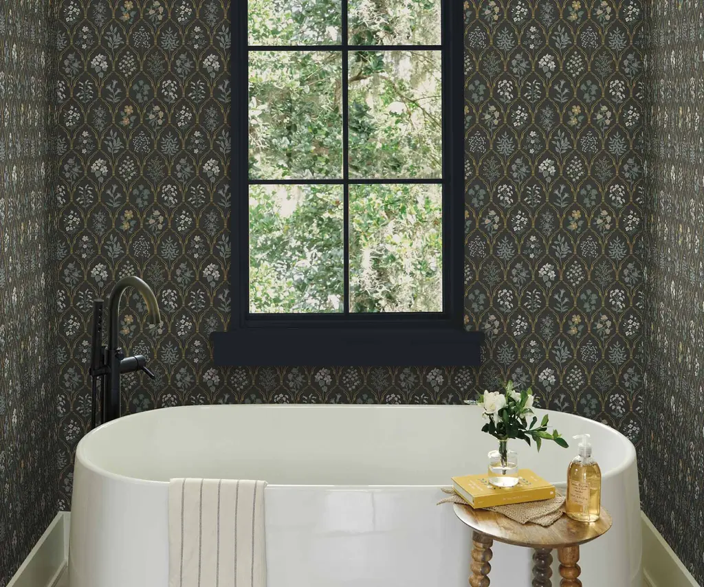 8 × 10" sample of our Hawthorne wallpaper. Hawthorne features sprays of assorted flowers standing under delicate arches that create a botanical grid with a vintage feel. Please note that wallpaper samples are cut at random, and pattern placement of the sample you receive will not match the photo featured here.