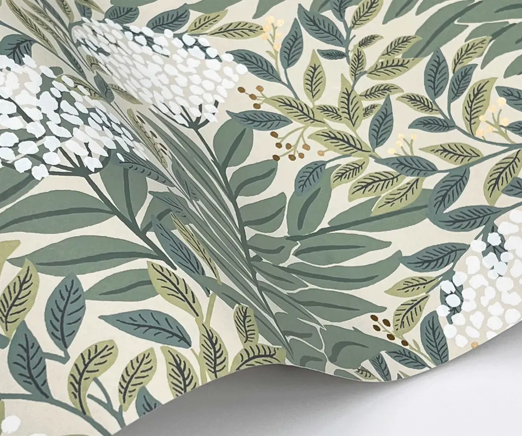 8" x 10" sample of our Highgrove wallpaper. Highgrove is a traditional design featuring layered leaves that create a lush tapestry of greenery, accented by sprays of Queen Anne's Lace. This wallpaper is gravure printed and comes in 27 inch rolls with a 24 inch repeat.