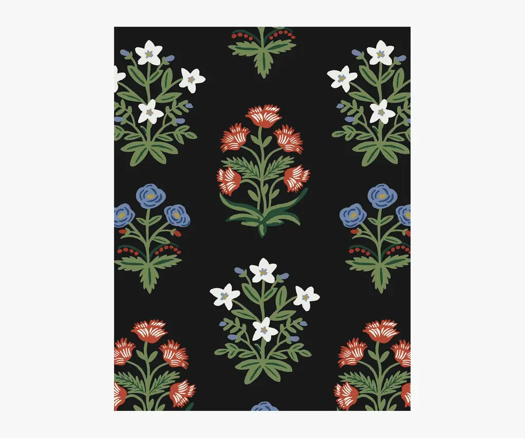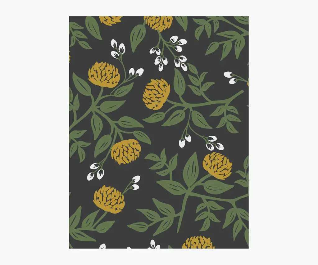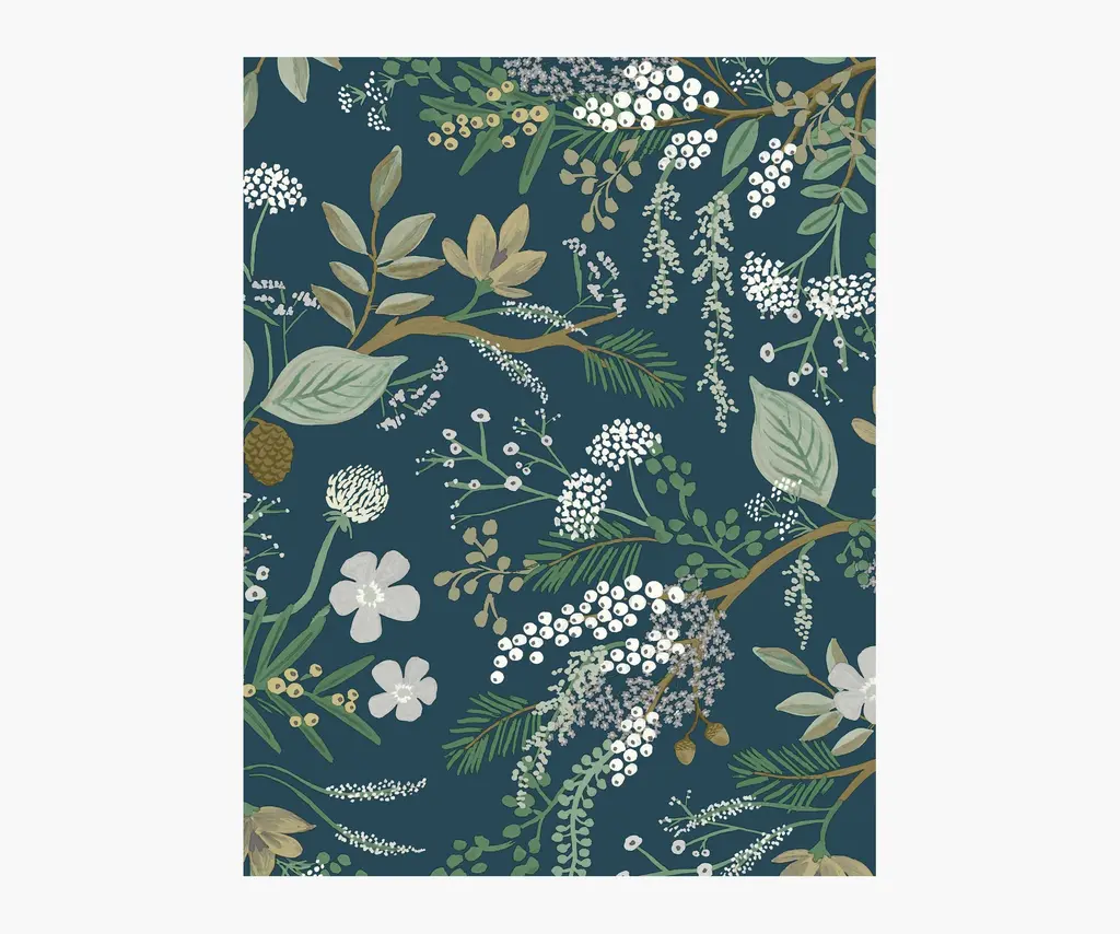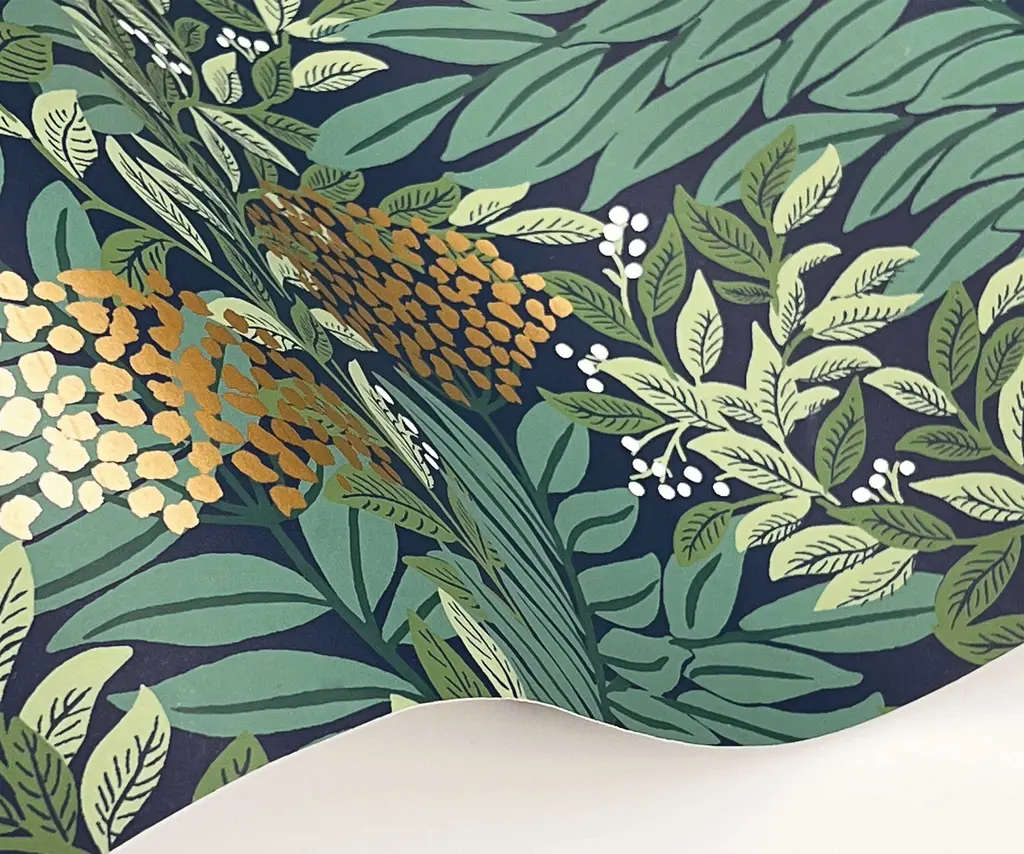 8" x 10" sample of our Highgrove wallpaper. Highgrove is a traditional design featuring layered leaves that create a lush tapestry of greenery, accented by sprays of Queen Anne's Lace. This wallpaper is gravure printed and comes in 27 inch rolls with a 24 inch repeat.