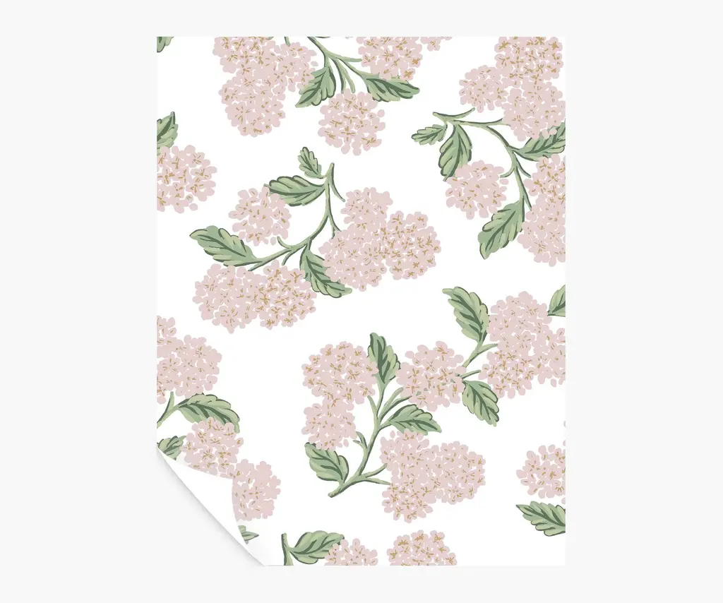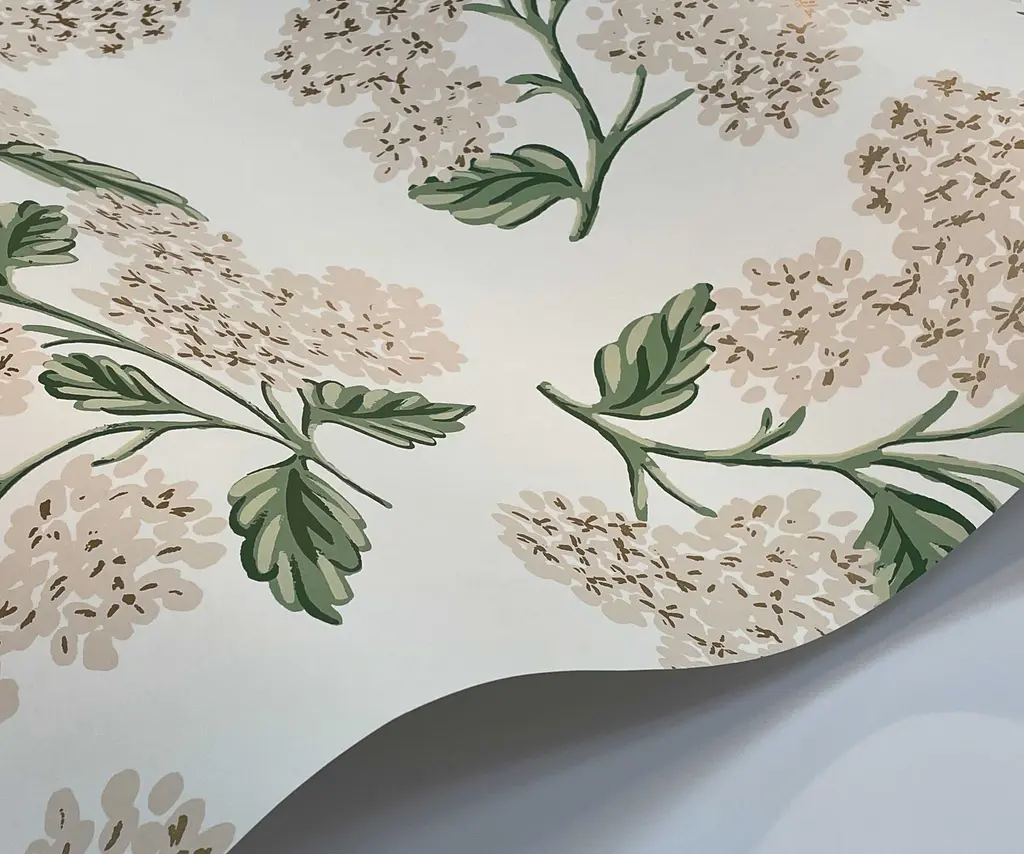 8 × 10" sample of our Hydrangea wallpaper. Our Hydrangea wallpaper is both elegant and elevated, with abundant branches blooming with the classic flower. This wallpaper is screen printed and comes in 27 inch rolls with a 25.25 inch repeat. Please note that wallpaper samples are cut at random, and pattern placement of the sample you receive will not match the photo featured here.