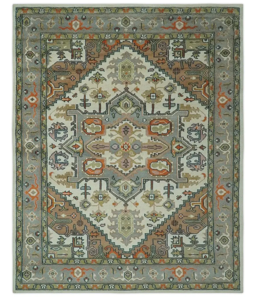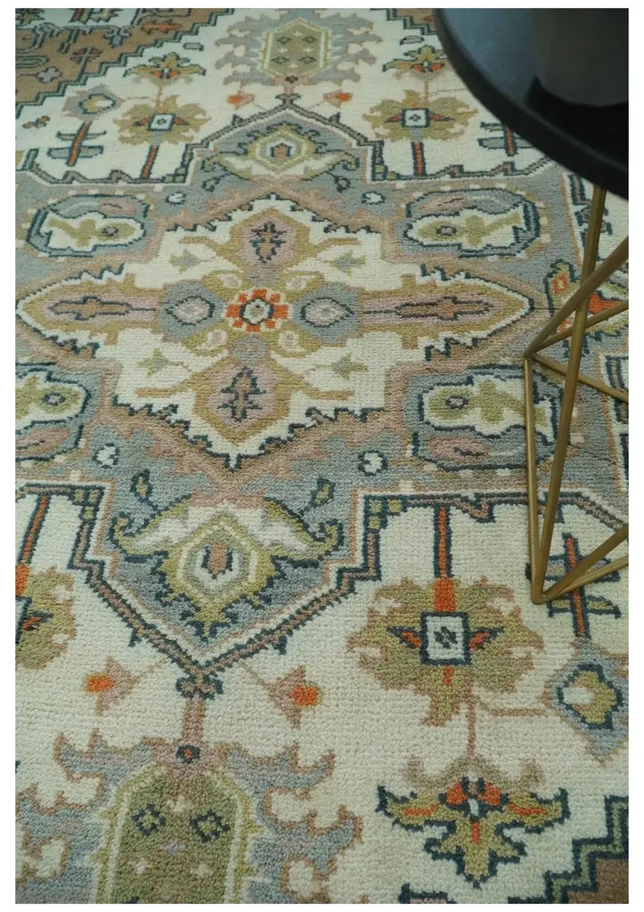 This hand-knotted Heriz area rug features a traditional design in ivory, silver, peach, and Olive. Made from high-quality wool, it is available in multiple sizes. Elevate your space with its timeless beauty and durable craftsmanship. Hand-Knotted Made with Wool Made to Order in 30-45 Days Color : Ivory, Silver, Peach and Olive This specific rug is made in India, in the city of Bhadohi. Bhadohi is one of the biggest rug manufacturing cities. Carpet weaving in the region dates back to the 16th century during the reign of Akbar. The skilled artisans of Bhadohi have been carrying the tradition of rug-making for centuries. USERS GUIDE Avoid prolonged moisture Vacuum regularly and/or shake to remove dust Do not pull any loose threads. Use scissors to simply cut the ends Blot spills immediately with a white cloth. Harsh chemicals may damage or fade the rug Use rug protectors under heavy furniture