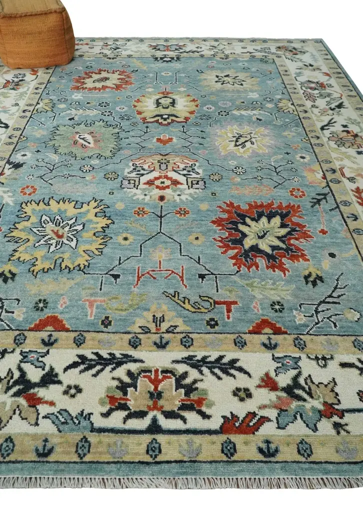 This Light Blue and Ivory hand knotted Traditional Oushak Wool Area Rug offers a unique blend of vibrant colors and soft wool for a timeless look. Hand crafted with attention to detail, this rug brings traditional style to any space. Perfect for a living room, entryway, or bedroom. Hand-Knotted SIZES ARE MADE TO ORDER IN 30-45 DAYS Made with Wool Color : Light Blue and Ivory Made with 28 knots per square inch Made in India USERS GUIDE Avoid prolonged moisture Vacuum regularly and/or shake to remove dust Do not pull any loose threads. Use scissors to simply cut the ends The blot spills immediately with a white cloth. Harsh chemicals may damage or fade the rug Use rug protectors under heavy furniture