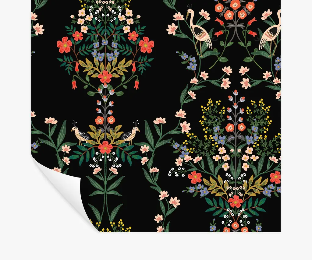 8 × 10" sample of our Luxembourg wallpaper. Drawing inspiration from French palace gardens, Luxembourg features mirrored medallions of florals, greenery, and the occasional bird to create a pattern that is sophisticated and timeless. This wallpaper is gravure printed and comes in 27 inch rolls with a 24 inch repeat. Please note that wallpaper samples are cut at random, and pattern placement of the sample you receive will not match the photo featured here.