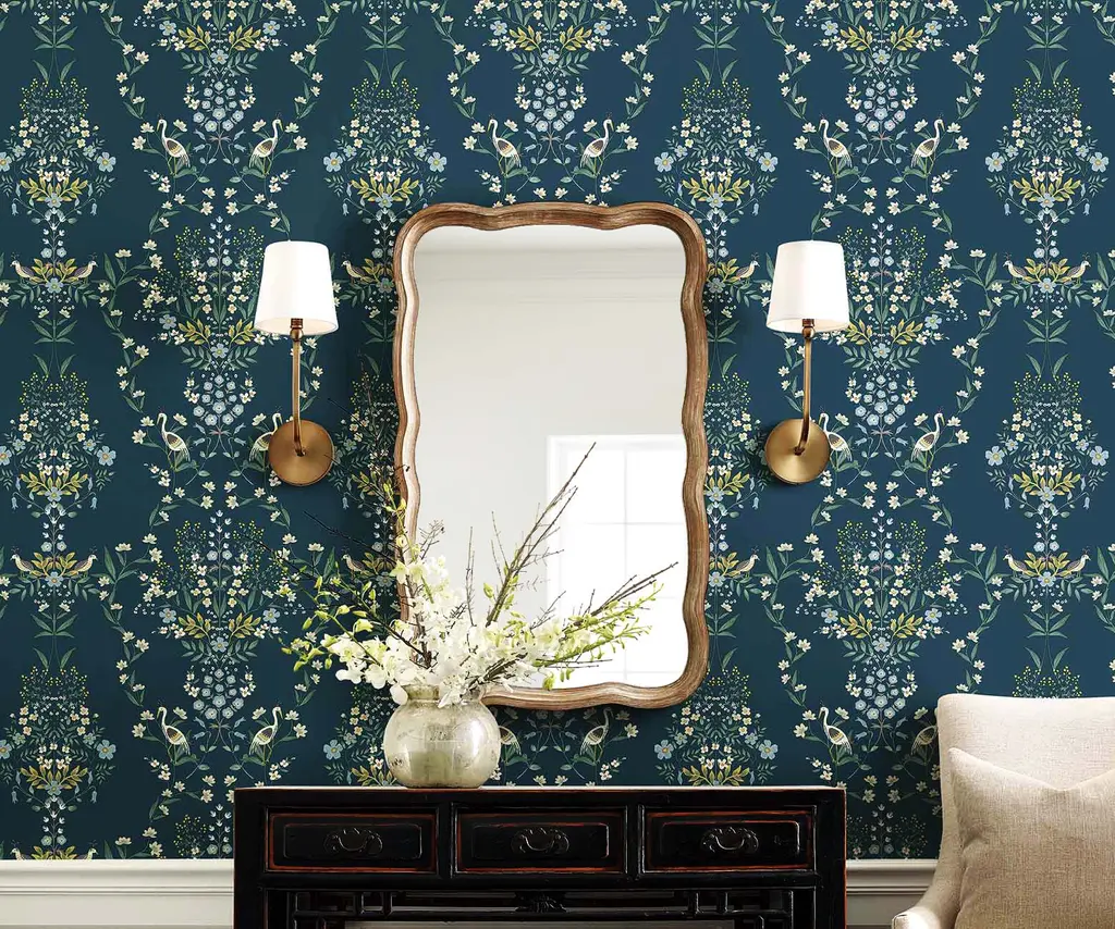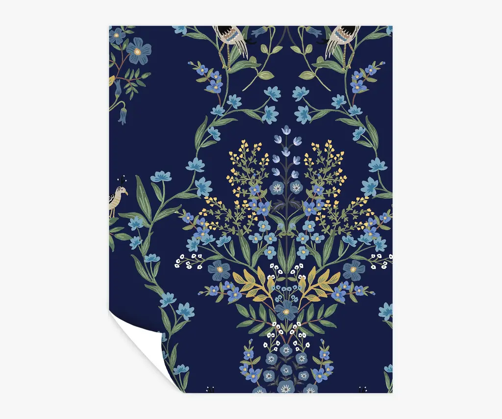 8 × 10" sample of our Luxembourg wallpaper. Drawing inspiration from French palace gardens, Luxembourg features mirrored medallions of florals, greenery, and the occasional bird to create a pattern that is sophisticated and timeless. This wallpaper is gravure printed and comes in 27 inch rolls with a 24 inch repeat. Please note that wallpaper samples are cut at random, and pattern placement of the sample you receive will not match the photo featured here.