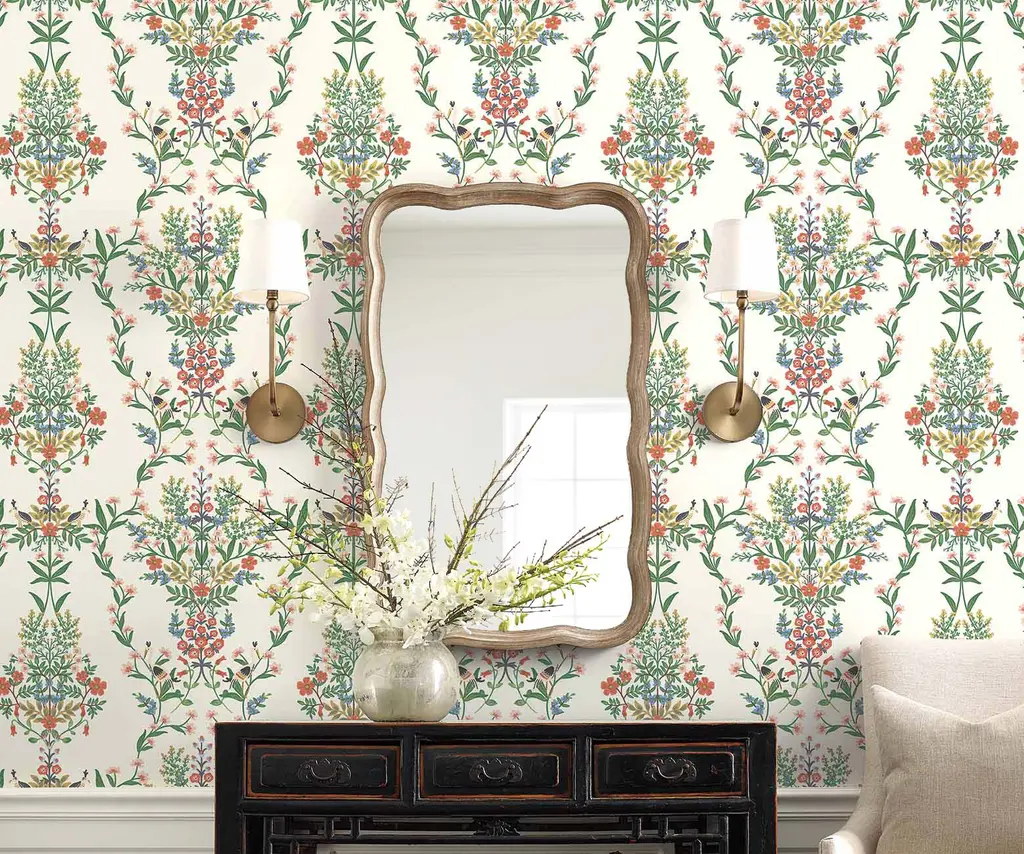 8 × 10" sample of our Luxembourg wallpaper. Drawing inspiration from French palace gardens, Luxembourg features mirrored medallions of florals, greenery, and the occasional bird to create a pattern that is sophisticated and timeless. This wallpaper is gravure printed and comes in 27 inch rolls with a 24 inch repeat. Please note that wallpaper samples are cut at random, and pattern placement of the sample you receive will not match the photo featured here.