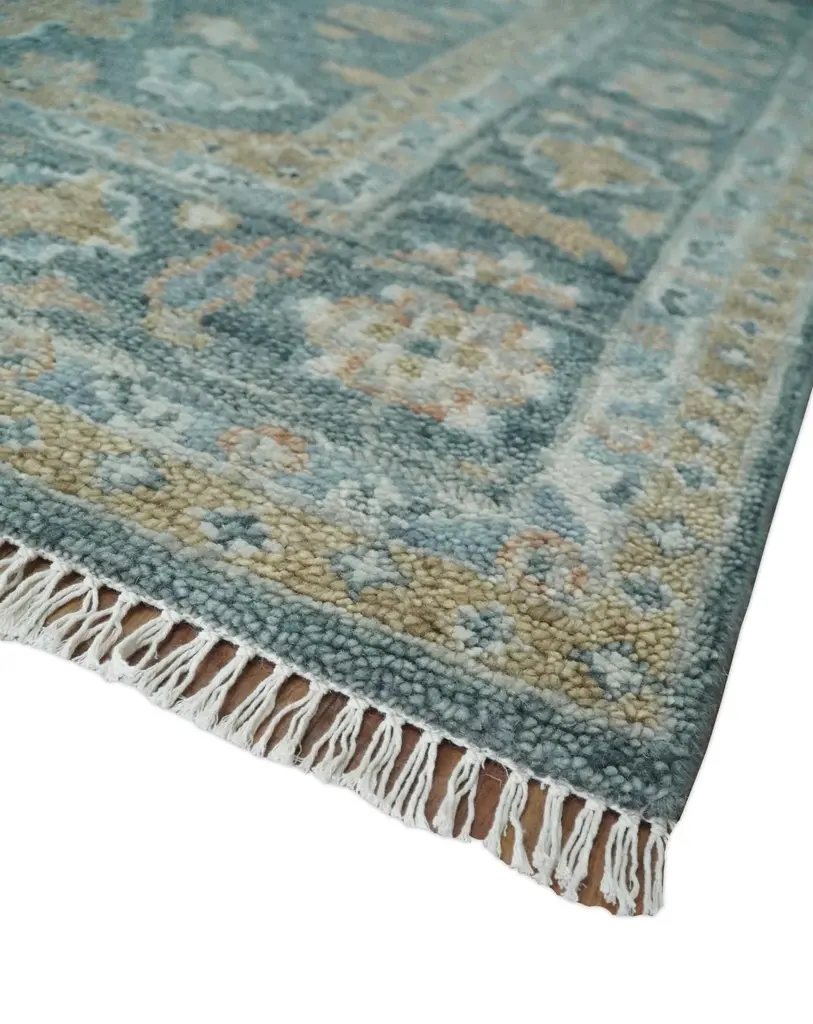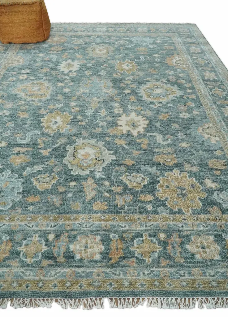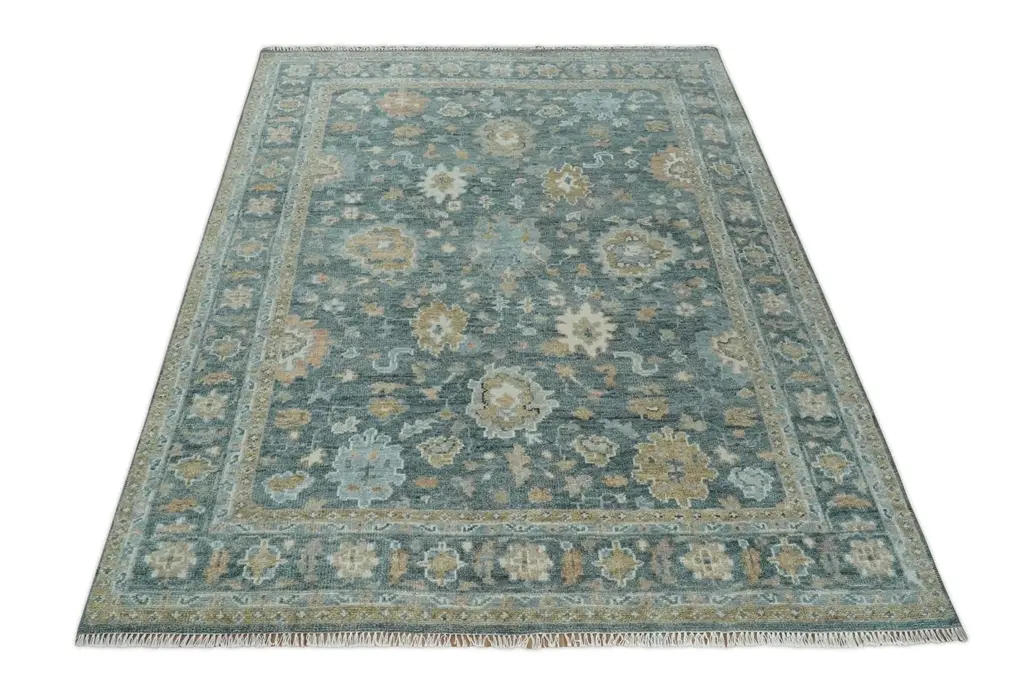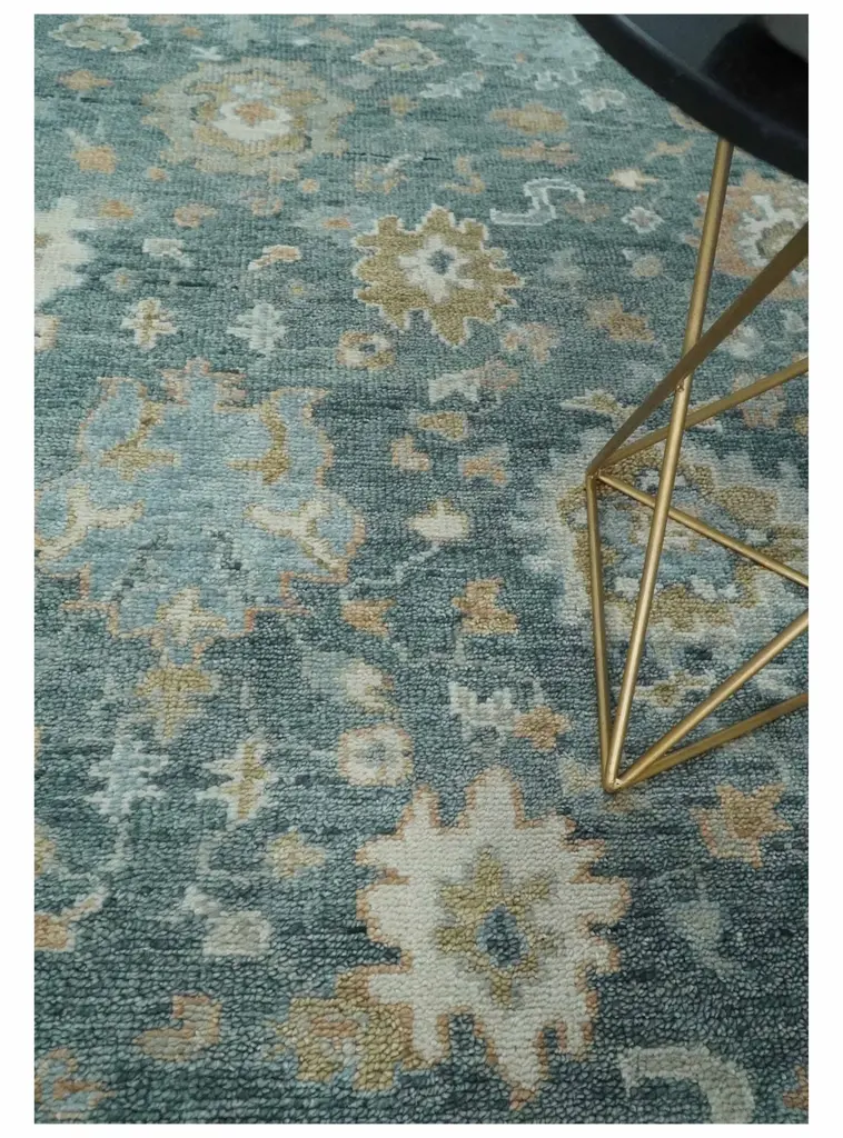 This one-of-a-kind, Teal, Olive and Silver area rug is hand knotted from luxurious Oushak wool. Featuring an antique style, this timeless classic is sure to imbue your home with a classic aesthetic. Hand-Knotted SIZES ARE MADE TO ORDER IN 30-60 DAYS Made with Wool Color : Gray, Olive and Silver Made with 28 knots per square inch Oushak rugs originate from the city of Oushak in the province of East Azerbaijan in North West Iran. Oushak rugs have been made for centuries and carry a tradition and art. This specific rug is made in India, in the city of Bhadohi. Bhadohi is one of the biggest rug manufacturing cities. Carpet weaving in the region dates back to the 16th century during the reign of Akbar. The skilled artisans of Bhadohi have been carrying the tradition of rug-making for centuries. USERS GUIDE Avoid prolonged moisture Vacuum regularly and/or shake to remove dust Do not pull any loose threads. Use scissors to simply cut the ends The blot spills immediately with a white cloth. Harsh chemicals may damage or fade the rug Use rug protectors under heavy furniture