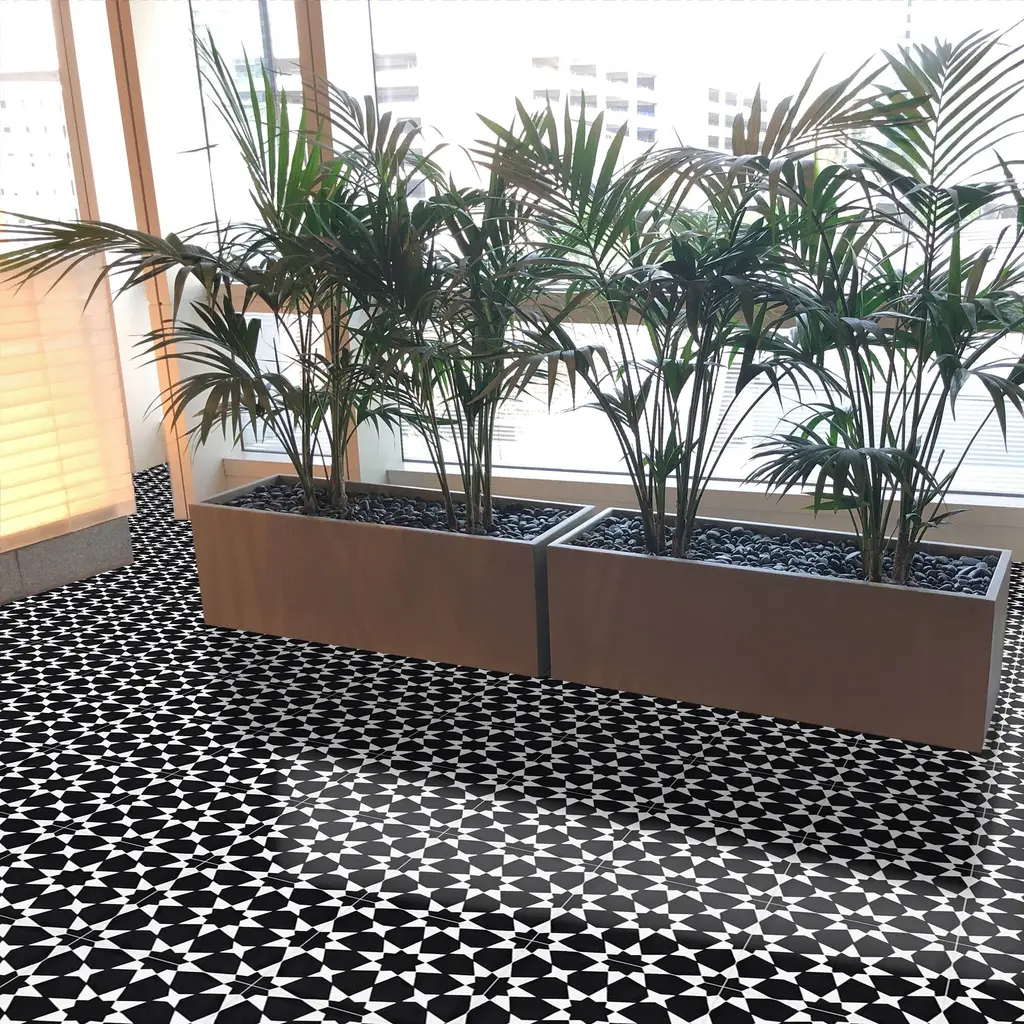 Design a dazzling backsplash, floor, or wall with these stunning tiles. Handmade by skilled Moroccan artisans for superior craftsmanship and traditional authenticity. These decorative tiles made from cement are durable indoors and outdoors. Weather-resistant and waterproof, the eco-friendly Moroccan tiles support your commitment to a greener home. Features:· Handmade in Morocco· Decorative floor and wall tiles· Made of cement materials· Professional installation is recommended.· Tiles need to be sealed before and after grouting.· Eco-friendly· Indoor or outdoor use· Geometric pattern· When ordering a box, 12 tiles come included. Sample is just 1 tile.· 12 tiles per box, covering 5.22 square feet.· 2.3 tiles per square foot· Each tile measures 8 inches wide x 8 inches long· Story Behind the Art: "It's more than tile, it's art." That simple statement is what sets the craftsmanship of Moroccan Mosaic apart from the rest. Based in the small city of Sale, Moroccan Mosaic is a family business going back 4 generations. When Simo, the current head of the business graduated from university in New York, he had little interest in the family business. But on a return trip home, he saw that the business was not doing well and set about reviving it. One important change he made was introducing black, grey, and white designs to appeal to American and European customers. It worked. When he started, they employed 2 workers and now they have nearly 80 on staff. The workshop itself is fairly simple, and the techniques used to create the tiles are steeped in tradition. Some modern equipment is available, though the workers prefer to use the more rustic tools. The creative process is time intensive and done by hand, as Simo insists on no corners be cut or production be rushed. Environmentally responsible and resource efficient, no chemicals are used at any step. For example, colors used come from nature literally. Green comes from mint leaves, orange from orange peel, and black from charcoal. The tiles themselves are a simple mixture of cement, sand, and granite powder. Moroccan Mosaic hires only local workers, teaching them a valued skill as well as paying them fair wages. Simo's goals for his business are to share the tradition of gorgeous Moroccan tile, grow the business, and employ more and more workers. Country of Origin: Morocco