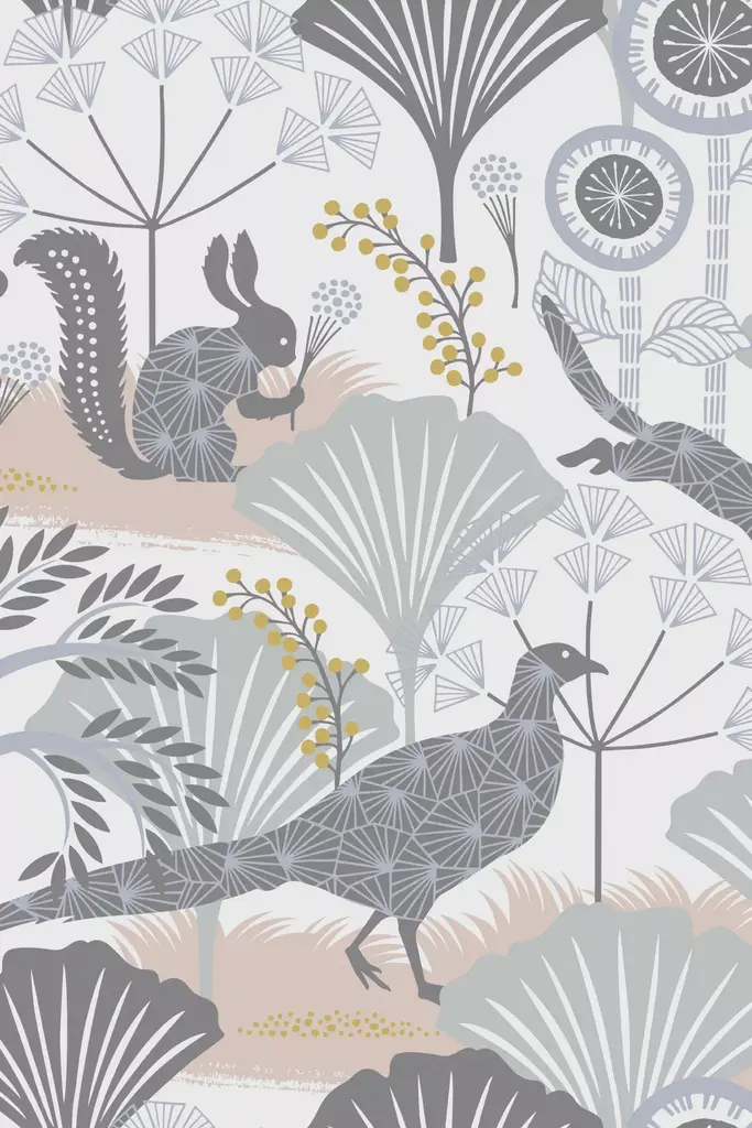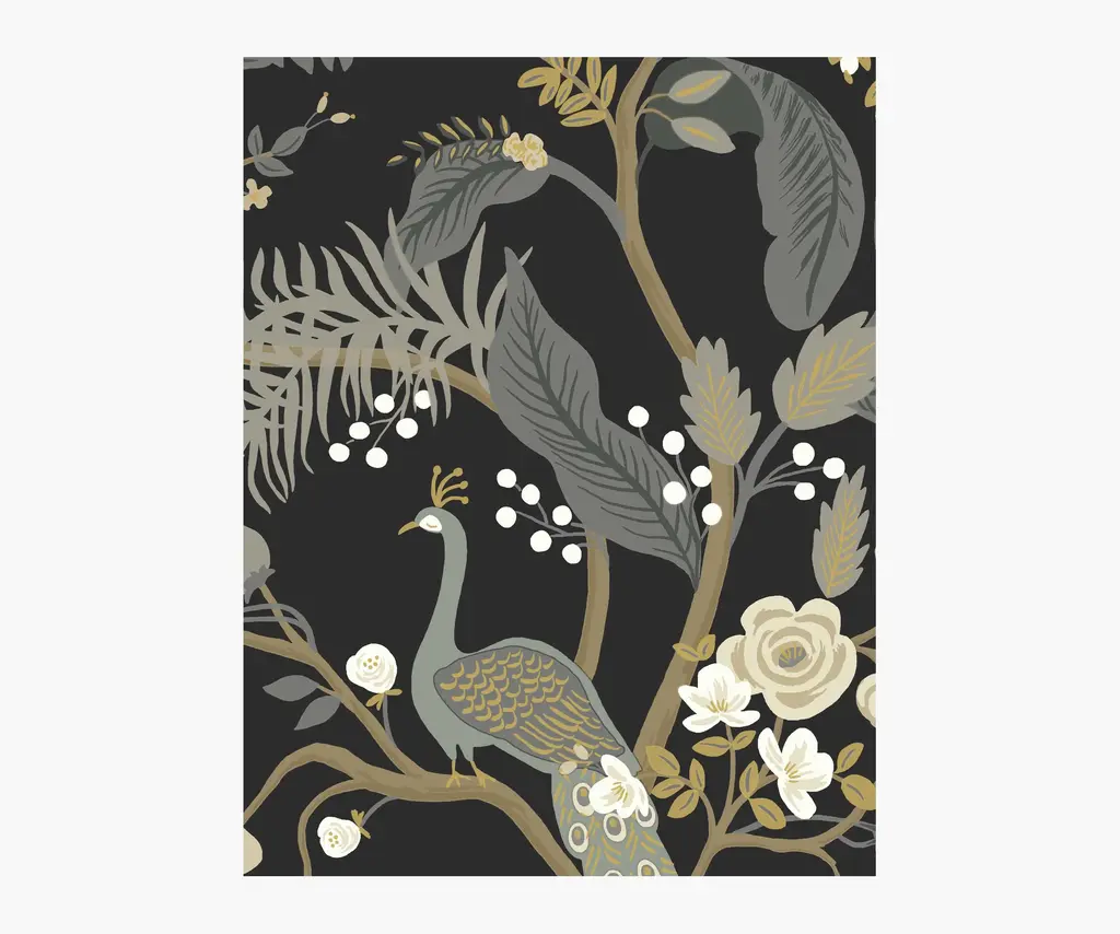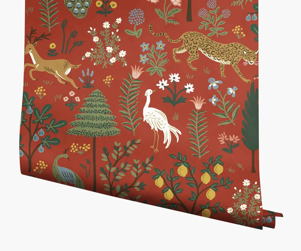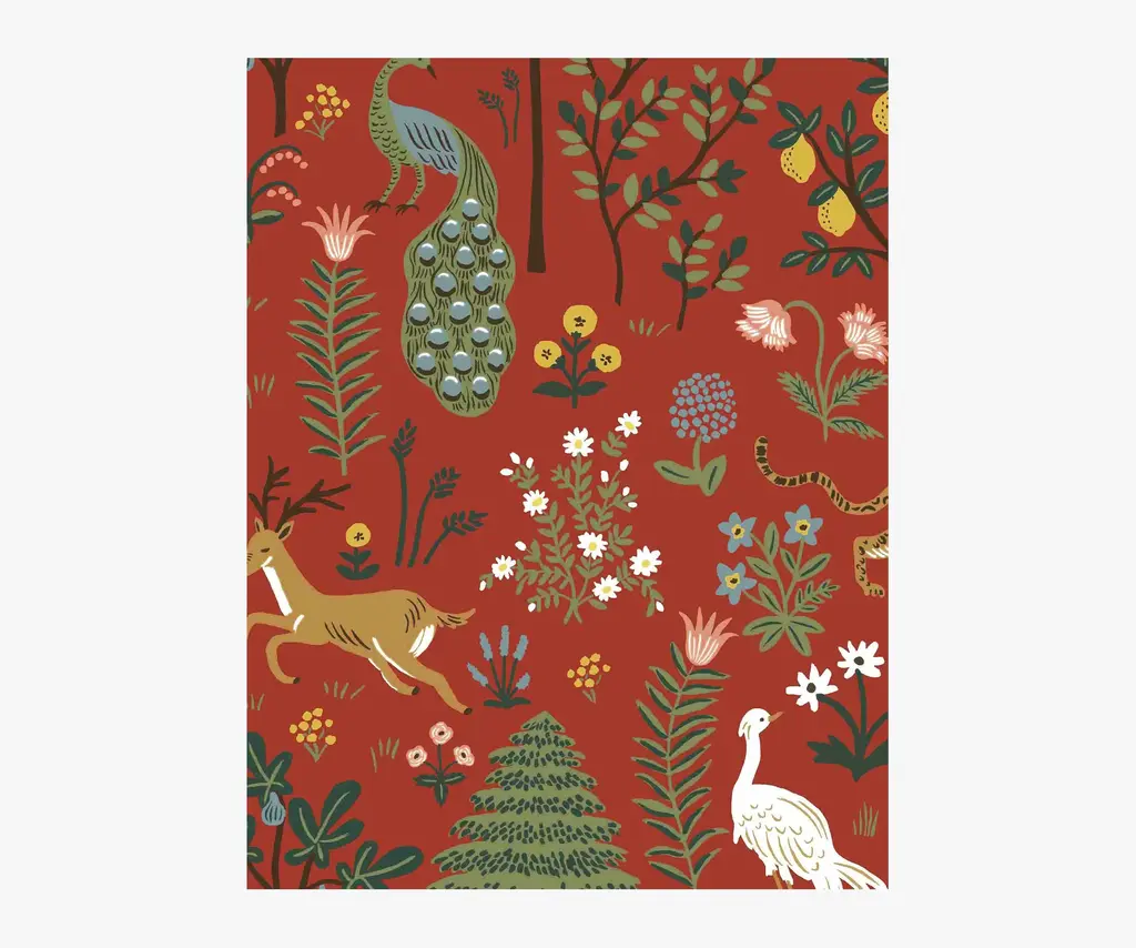 8 × 10" sample of our Menagerie wallpaper. Inspired by the work of early 20th century modern artists, Menagerie is a forest scene complete with stylized flowers, roaming animals, and showy birds portrayed in rich colors. This wallpaper is screen printed and comes in 27 inch rolls with a 25.25 inch repeat. Please note that wallpaper samples are cut at random, and pattern placement of the sample you receive will not match the photo featured here.