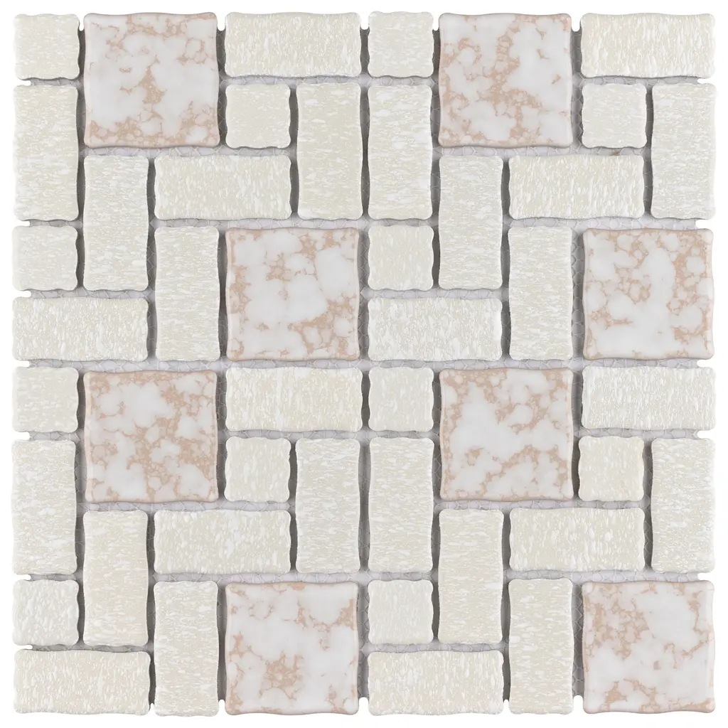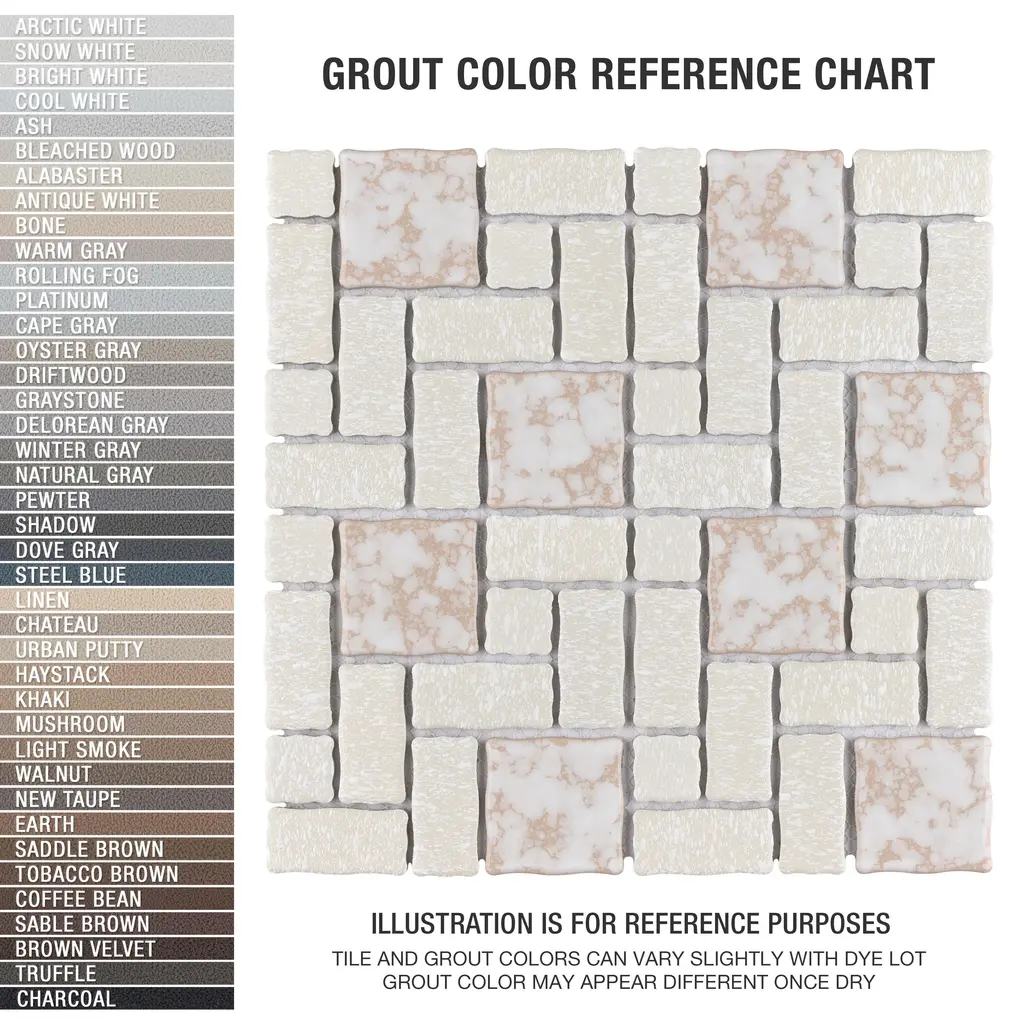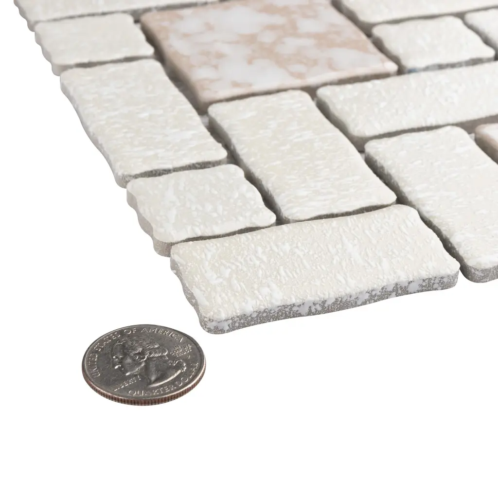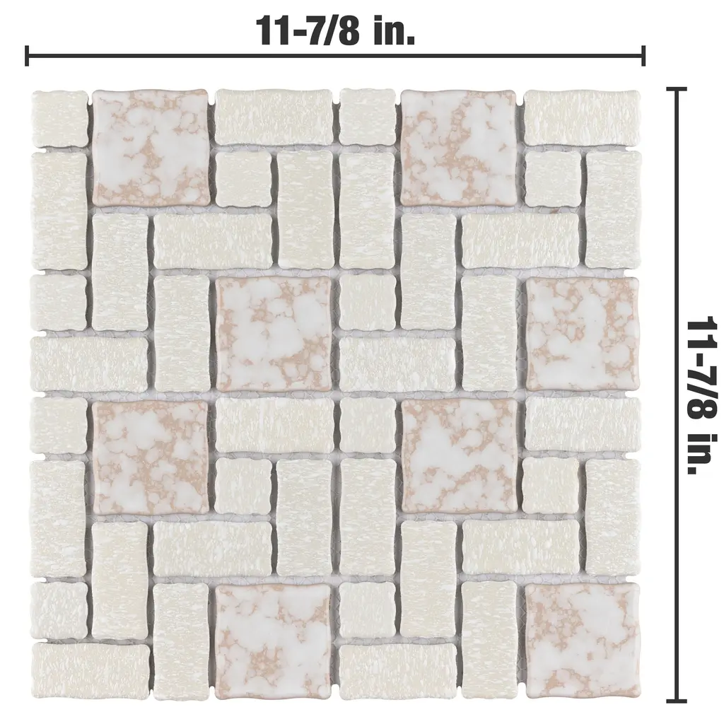 Our Academy Bone Porcelain Mosaic Tile is reminiscent of traditional, multi-texture and multi-color porcelain mosaic floor tile. Featuring a mottled finish and muted color palette, these tiles recreate a classic look with the durability and versatility of a modern tile. Use this tile virtually anywhere, due to its frost resistance, high slip resistance and P.E.I. rating of 4. 10.0 square feet, 10 pieces per case. Case weight is 20 lbs. Grade 1, first-quality porcelain tile for floor and wall use 11.88 in. width x 11.88 in. length x 0.19 in. thick mesh-mounted mosaic Glazed, mixed texture with a mixed finish and slight variation in tone PEI Rating IV has high resistance to abrasion and is suitable for heavy-duty residential and commercial kitchens, hotels, exhibition and sales rooms with some dirt conditions Impervious tiles have a water absorption of less than 0.5% for indoor and outdoor use and are frost resistant This tile has a COF wet rating greater than 0.60 to 0.79 which is considered skid resistant for indoor and outdoor use. This tile is ADA approved for slip resistance. Completely frost resistant for indoor or outdoor applications; use a latex-modified thinset for acceptable bond strength Please note: A sample of this product may be a partial piece cut from the full size tile in order to provide an affordable and convenient way for customers to judge the quality and finish of this item. Samples are not returnable.