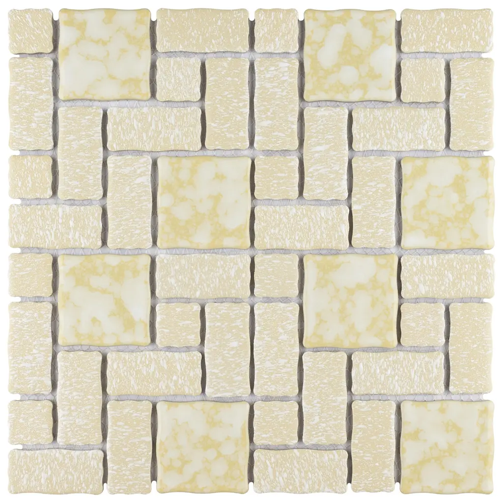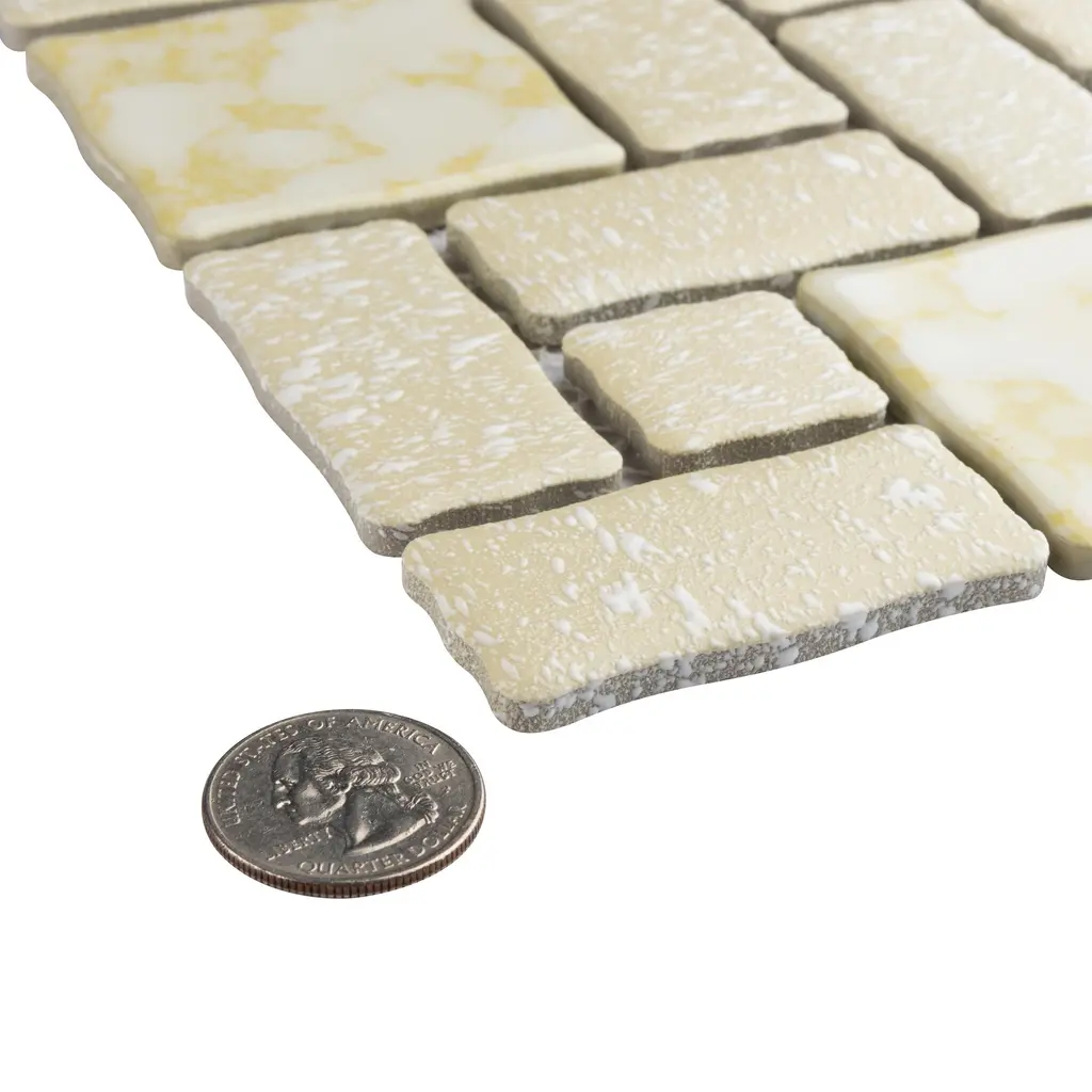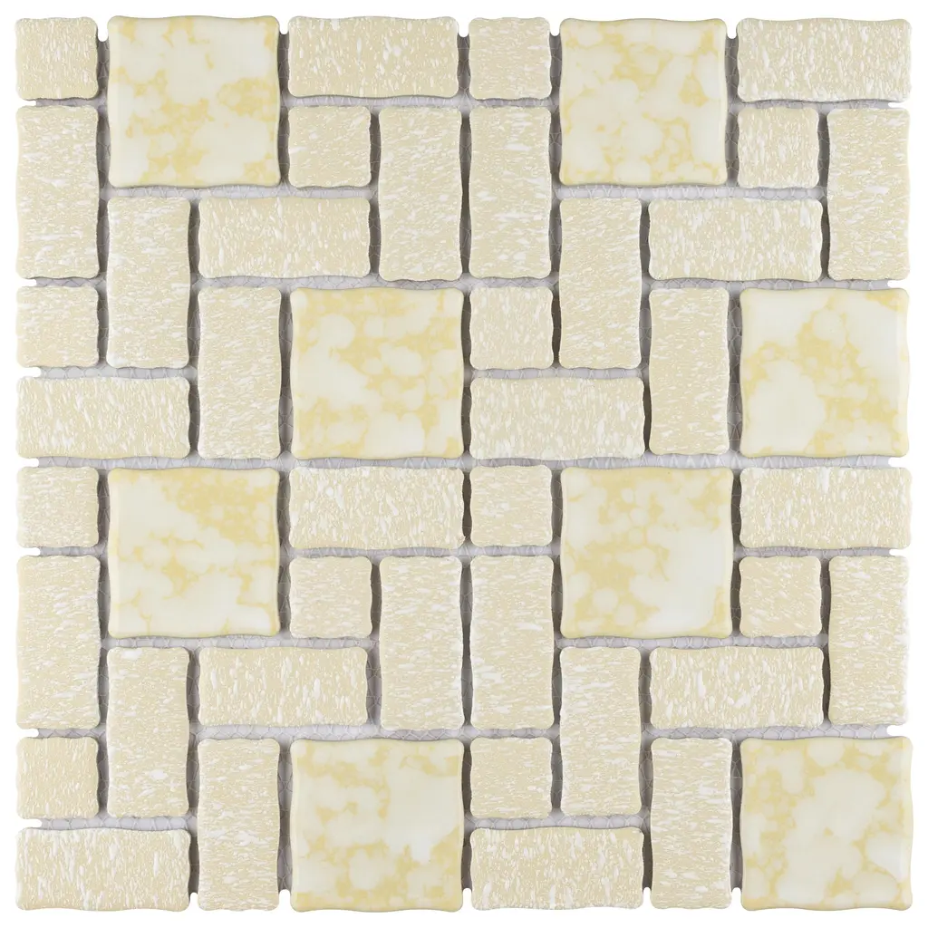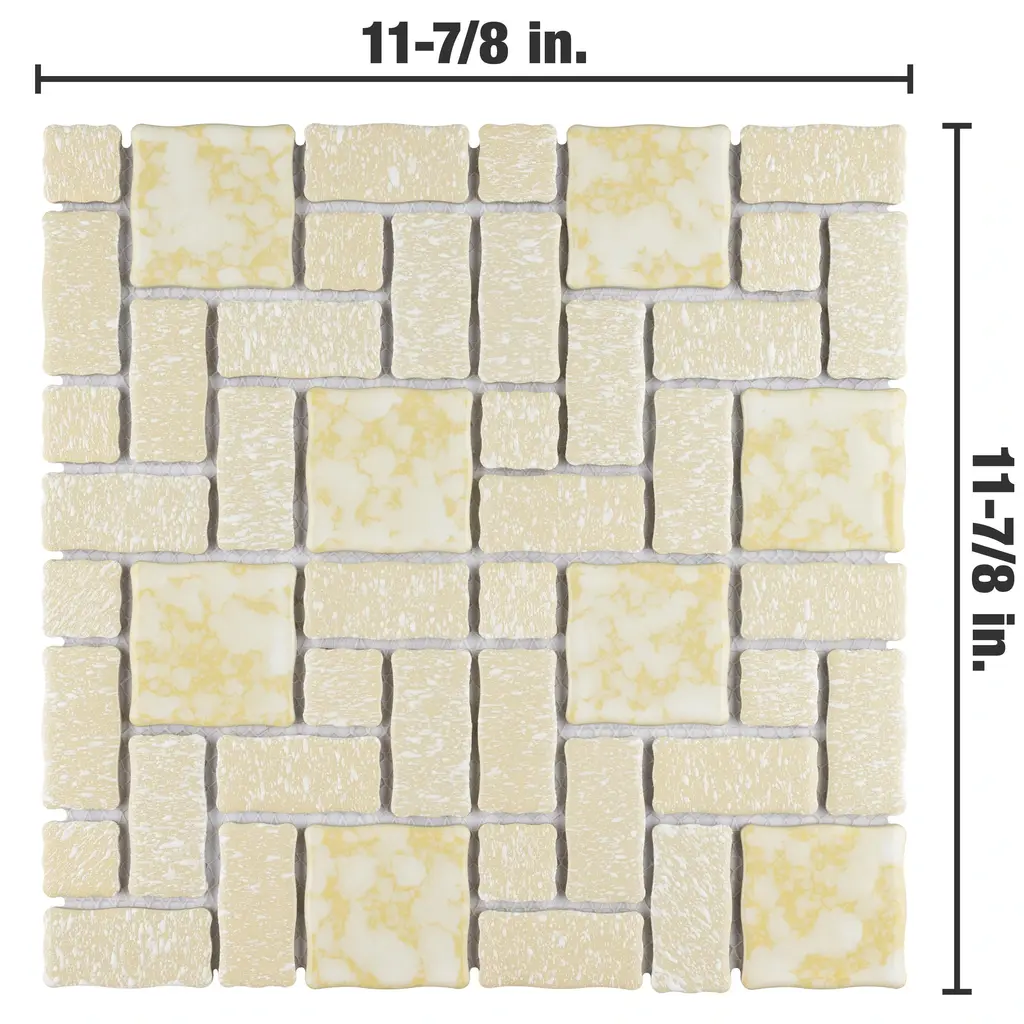 Our Academy Gold Porcelain Mosaic Tile is reminiscent of traditional, multi-texture and multi-color porcelain mosaic floor tile. Featuring a mottled finish and muted color palette, these tiles recreate a classic look with the durability and versatility of a modern tile. Use this tile virtually anywhere, due to its frost resistance, high slip resistance and P.E.I. rating of 4. 10.0 square feet, 10 pieces per case. Case weight is 20 lbs. Grade 1, first-quality porcelain tile for floor and wall use 11.88 in. width x 11.88 in. length x 0.19 in. thick mesh-mounted mosaic Glazed, mixed texture with a mixed finish and slight variation in tone PEI Rating IV has high resistance to abrasion and is suitable for heavy-duty residential and commercial kitchens, hotels, exhibition and sales rooms with some dirt conditions Impervious tiles have a water absorption of less than 0.5% for indoor and outdoor use and are frost resistant This tile has a COF wet rating greater than 0.60 to 0.79 which is considered skid resistant for indoor and outdoor use. This tile is ADA approved for slip resistance. Completely frost resistant for indoor or outdoor applications; use a latex-modified thinset for acceptable bond strength Please note: A sample of this product may be a partial piece cut from the full size tile in order to provide an affordable and convenient way for customers to judge the quality and finish of this item. Samples are not returnable.