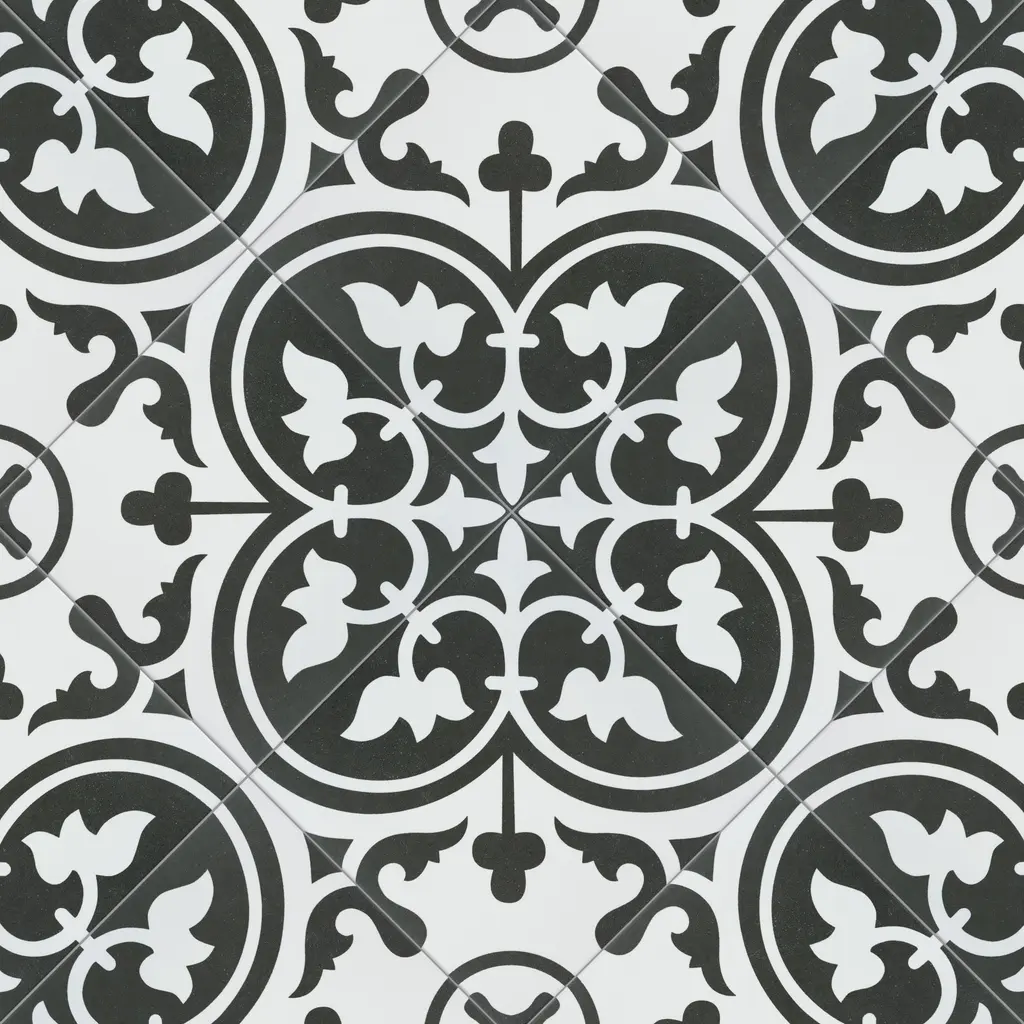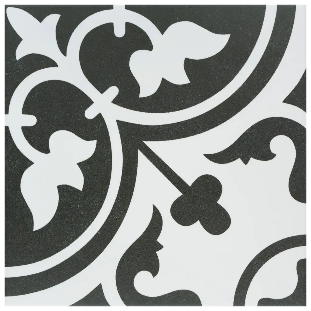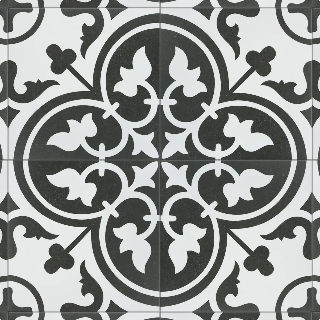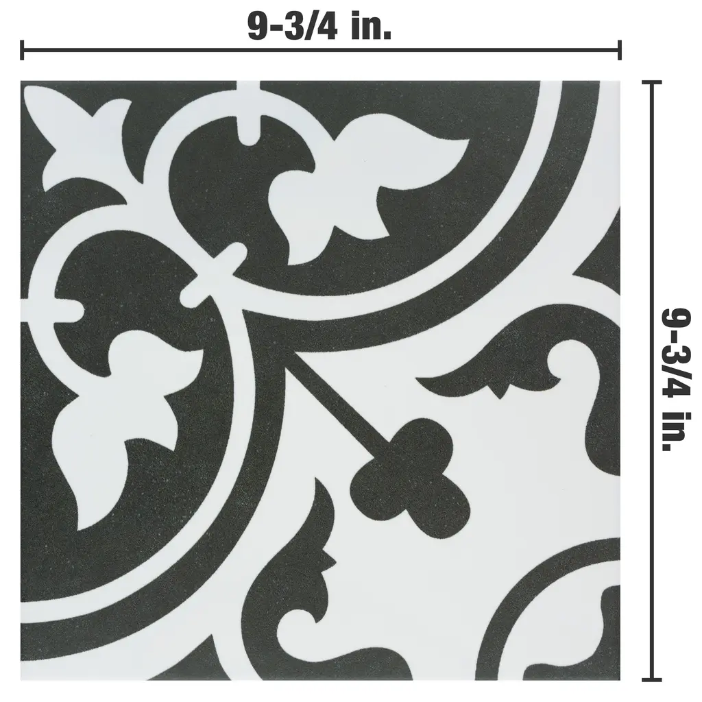 Capturing the appearance of an encaustic look, our Arte Clover Black Porcelain Floor and Wall Tile features a smooth, satin finish, providing decorative appeal that adapts to a variety of stylistic contexts. With its impervious, frost-resistant features, this black square tile is an ideal selection for a variety of spaces including indoor and outdoor residential installations, kitchens, bathrooms, backsplashes, showers, hallways, pools and fireplace facades. Discover more products from the Merola Tile Arte Collection to complete your design. To ensure optimal results, please consult with your installer and review the product specifications to confirm that this tile meets the specific needs of your project. 10.88 square feet, 16 pieces per case. Case weight is 43.68 lbs. Grade 1, first-quality porcelain tile for floor and wall use 9.75 in. width x 9.75 in. length x 0.4 in. thick Glazed, smooth finish with a medium sheen and uniform appearance in tone PEI Rating III is suitable for medium-duty residential floors including kitchens, halls, corridors, balconies, terraces and areas used more often with normal footwear and small amounts of dirt Impervious tiles have a water absorption of less than 0.5% for indoor and outdoor use and are frost resistant This tile is ADA approved for slip resistance with a DCOF value of 0.42 or higher. Completely frost resistant for indoor or outdoor applications; use a latex-modified thinset for acceptable bond strength Please note: A sample of this product may be a partial piece cut from the full size tile in order to provide an affordable and convenient way for customers to judge the quality and finish of this item. Samples are not returnable.