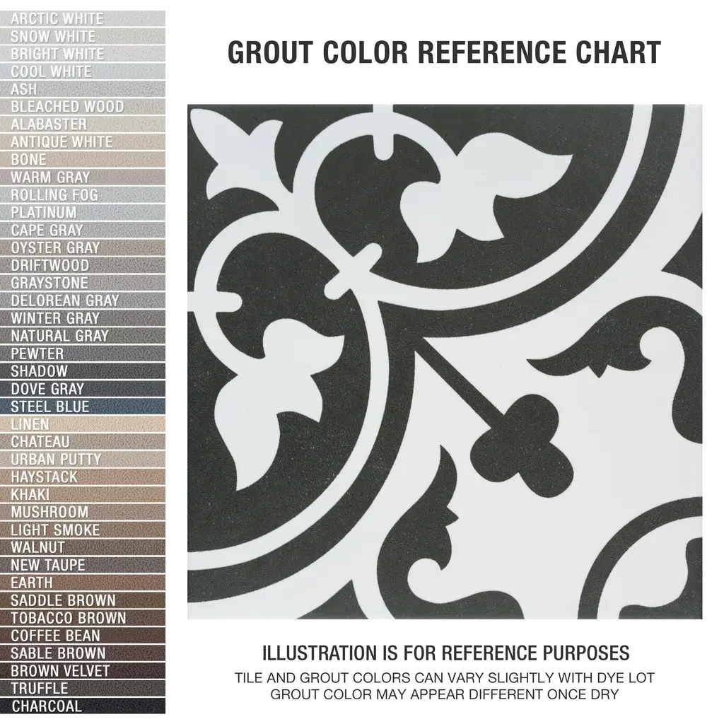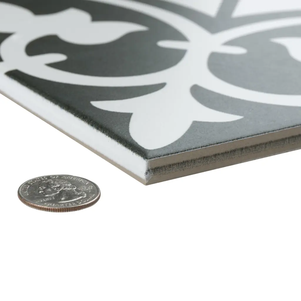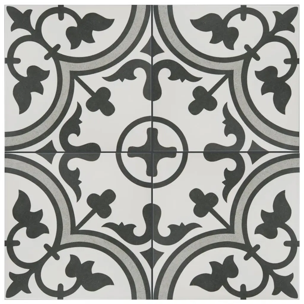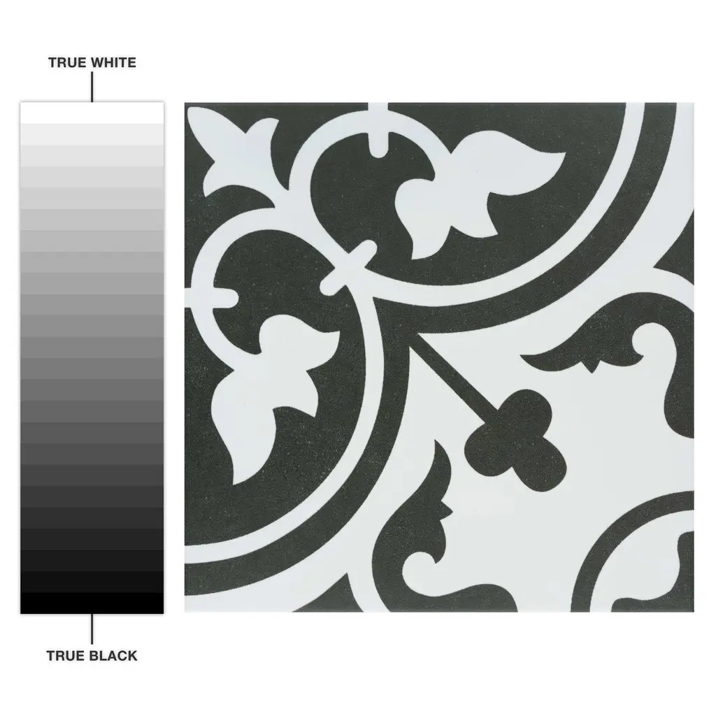 Capturing the appearance of an encaustic look, our Arte Clover Black Porcelain Floor and Wall Tile features a smooth, satin finish, providing decorative appeal that adapts to a variety of stylistic contexts. With its impervious, frost-resistant features, this black square tile is an ideal selection for a variety of spaces including indoor and outdoor residential installations, kitchens, bathrooms, backsplashes, showers, hallways, pools and fireplace facades. Discover more products from the Merola Tile Arte Collection to complete your design. To ensure optimal results, please consult with your installer and review the product specifications to confirm that this tile meets the specific needs of your project. 10.88 square feet, 16 pieces per case. Case weight is 43.68 lbs. Grade 1, first-quality porcelain tile for floor and wall use 9.75 in. width x 9.75 in. length x 0.4 in. thick Glazed, smooth finish with a medium sheen and uniform appearance in tone PEI Rating III is suitable for medium-duty residential floors including kitchens, halls, corridors, balconies, terraces and areas used more often with normal footwear and small amounts of dirt Impervious tiles have a water absorption of less than 0.5% for indoor and outdoor use and are frost resistant This tile is ADA approved for slip resistance with a DCOF value of 0.42 or higher. Completely frost resistant for indoor or outdoor applications; use a latex-modified thinset for acceptable bond strength Please note: A sample of this product may be a partial piece cut from the full size tile in order to provide an affordable and convenient way for customers to judge the quality and finish of this item. Samples are not returnable.