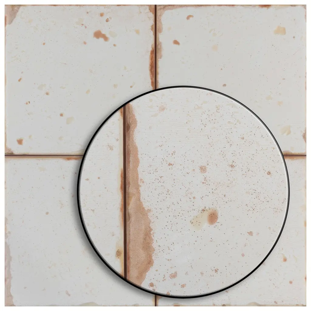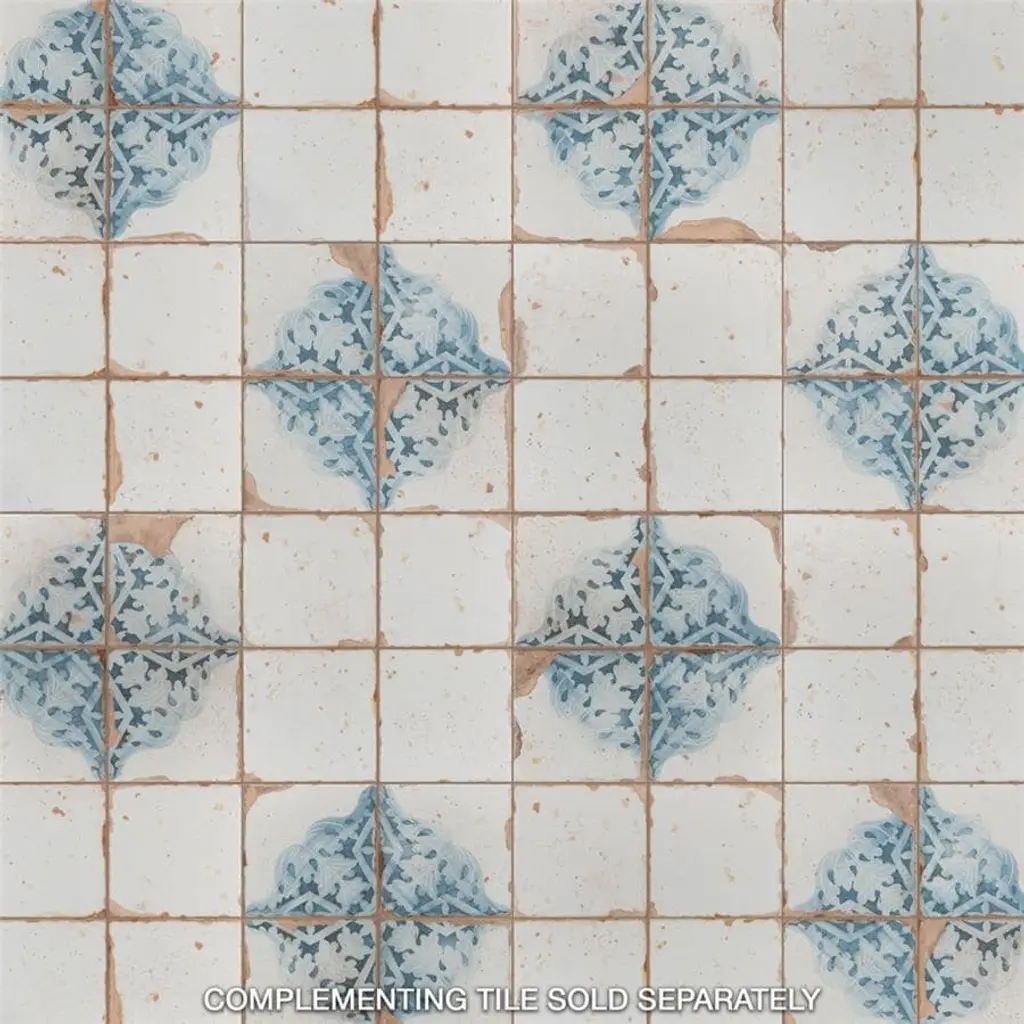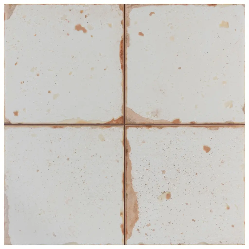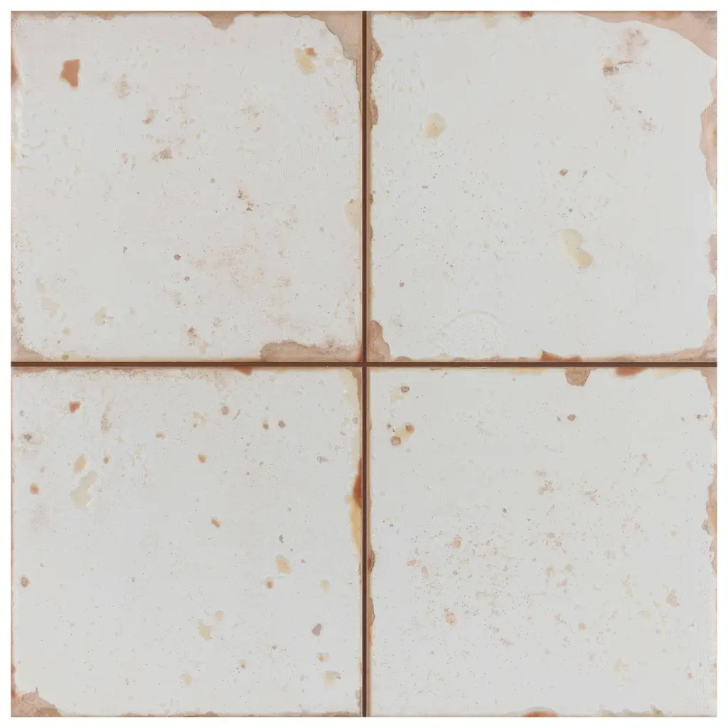 Inspired by the sun-drenched streets of Spain, our Artisan Blanco Ceramic Floor and Wall Tile brings vintage charm to your interior. The low-sheen white glaze is offset by imitations of scuffs and spots that mark well-loved, century-old tiles. Rich red tones from the ceramic underneath peek through, adding a worn finishing touch on this uniquely aged piece. There are 8 different variations of this pattern randomly spread throughout each case, it is easy to capture the authentic appearance of a matured installation. Save time and labor spent arranging smaller square tiles and instead install these durable ceramic slabs, which have four squares with realistic lines in between to mimic grout. The scored grout lines can be grouted with the color of your choice to further customize your installation. Tile is the better choice for your space. This tile is made from natural ingredients, making it a healthy choice as it is free from allergens, VOCs, formaldehyde and PVC. 12.0 square feet, 10 pieces per case. Case weight is 51 lbs. Grade 1, first-quality ceramic tile for floor and wall use 13 in. width x 13 in. length x 0.39 in. thick Glazed, smooth finish with a low sheen and moderate variation in tone PEI Rating IV has high resistance to abrasion and is suitable for heavy-duty residential and commercial kitchens, hotels, exhibition and sales rooms with some dirt conditions Semi-Vitreous tiles have water absorption of more than 3% but less than 7% for indoor use This tile is ADA approved for slip resistance with a DCOF value of 0.42 or higher. Not frost resistant Please note: A sample of this product may be a partial piece cut from the full size tile in order to provide an affordable and convenient way for customers to judge the quality and finish of this item. Samples are not returnable.