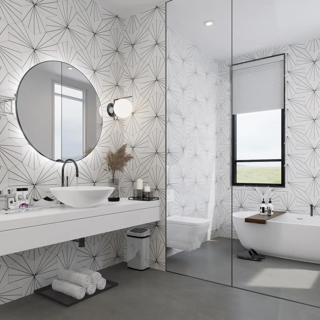 Modeling a geometric look, our Aster Hex Blanco Porcelain Floor and Wall Tile features a smooth, satin finish, providing decorative appeal that adapts to a variety of stylistic contexts. With its impervious, frost-resistant features, this white hexagon tile is an ideal selection for a variety of spaces including indoor and outdoor commercial and residential installations, kitchens, bathrooms, backsplashes, showers, hallways, entryways, patios, pools and fireplace facades. This tile is a perfect choice on its own or with other products in the Merola Tile, Aster Collection. To ensure optimal results, please consult with your installer and review the product specifications to confirm that this tile meets the specific needs of your project.