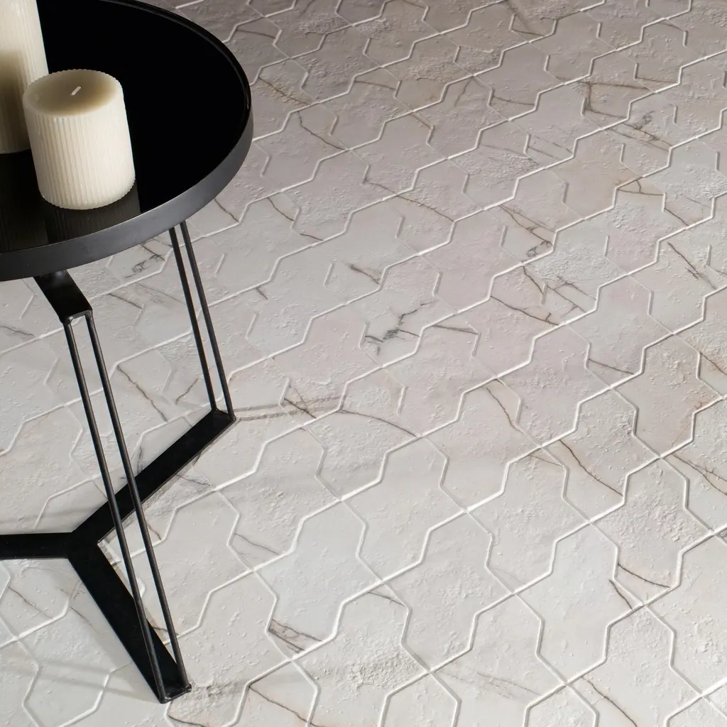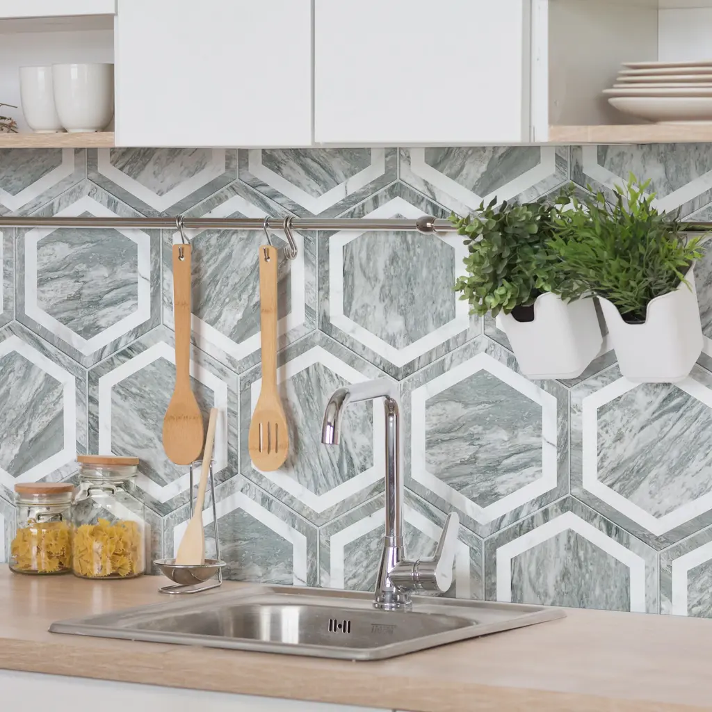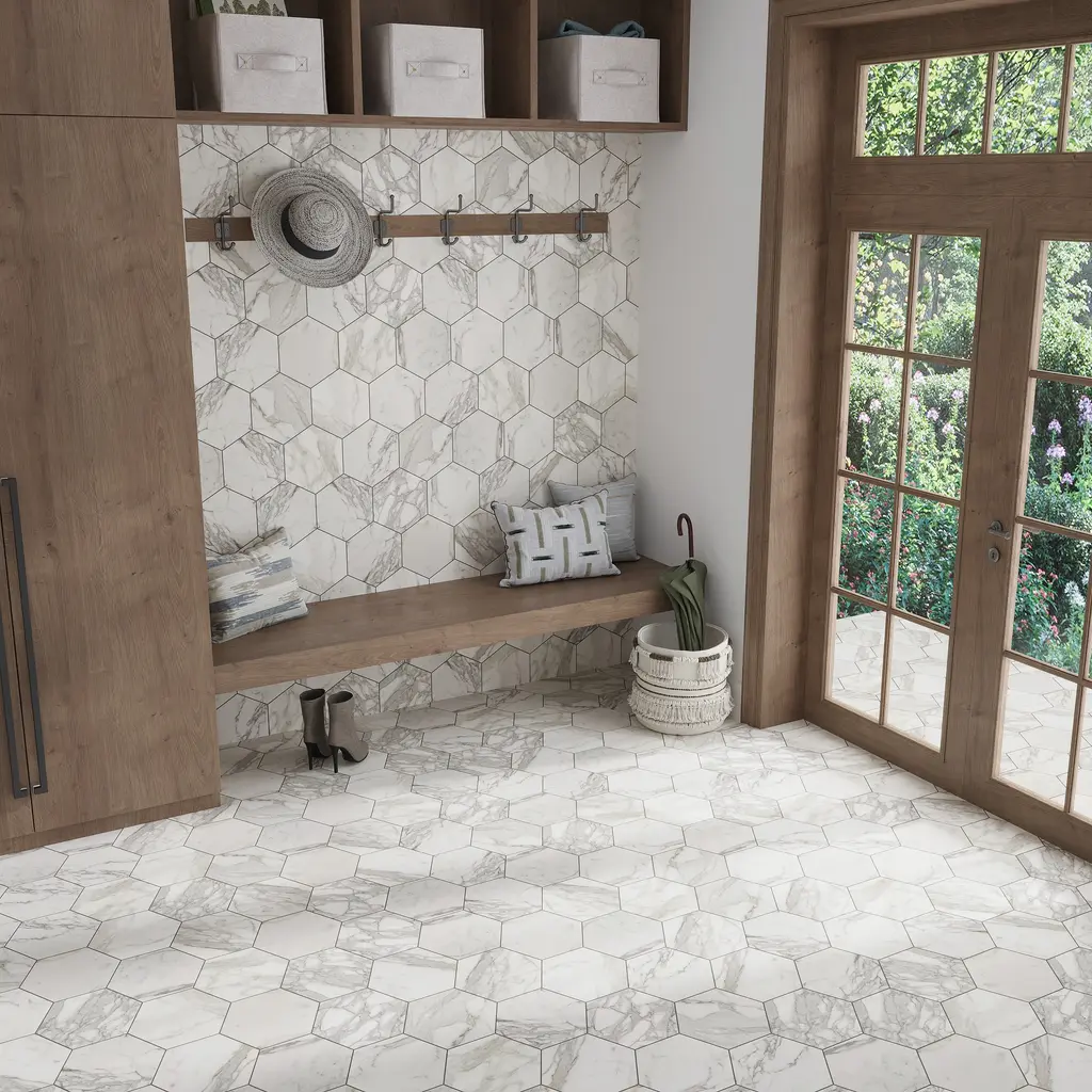 Capturing the appearance of a marble look, our BioTech Hex Bardiglio Deco Porcelain Floor and Wall Tile features a smooth, matte finish, providing decorative appeal that adapts to a variety of stylistic contexts. Containing 10 different print variations that are randomly distributed throughout each case, this gray hexagon tile offers a one-of-a-kind look. With its impervious, frost-resistant features, this tile is an ideal selection for both indoor and outdoor residential installations, including kitchens, bathrooms, backsplashes, showers, hallways and fireplace facades. This tile is a perfect choice on its own or paired with other products in the BioTech Collection. Tile is the better choice for your space! 10.64 square feet, 14 pieces per case. Case weight is 35.4 lbs. Grade 1, first-quality porcelain tile for floor and wall use 11 in. width x 13 in. length x 0.3 in. thick Glazed, smooth finish with a low sheen and slight variation in tone PEI Rating III is suitable for medium-duty residential floors including kitchens, halls, corridors, balconies, terraces and areas used more often with normal footwear and small amounts of dirt Impervious tiles have a water absorption of less than 0.5% for indoor and outdoor use and are frost resistant This tile is ADA approved for slip resistance with a DCOF value of 0.42 or higher. Completely frost resistant for indoor or outdoor applications; use a latex-modified thinset for acceptable bond strength Please note: Samples are not returnable
