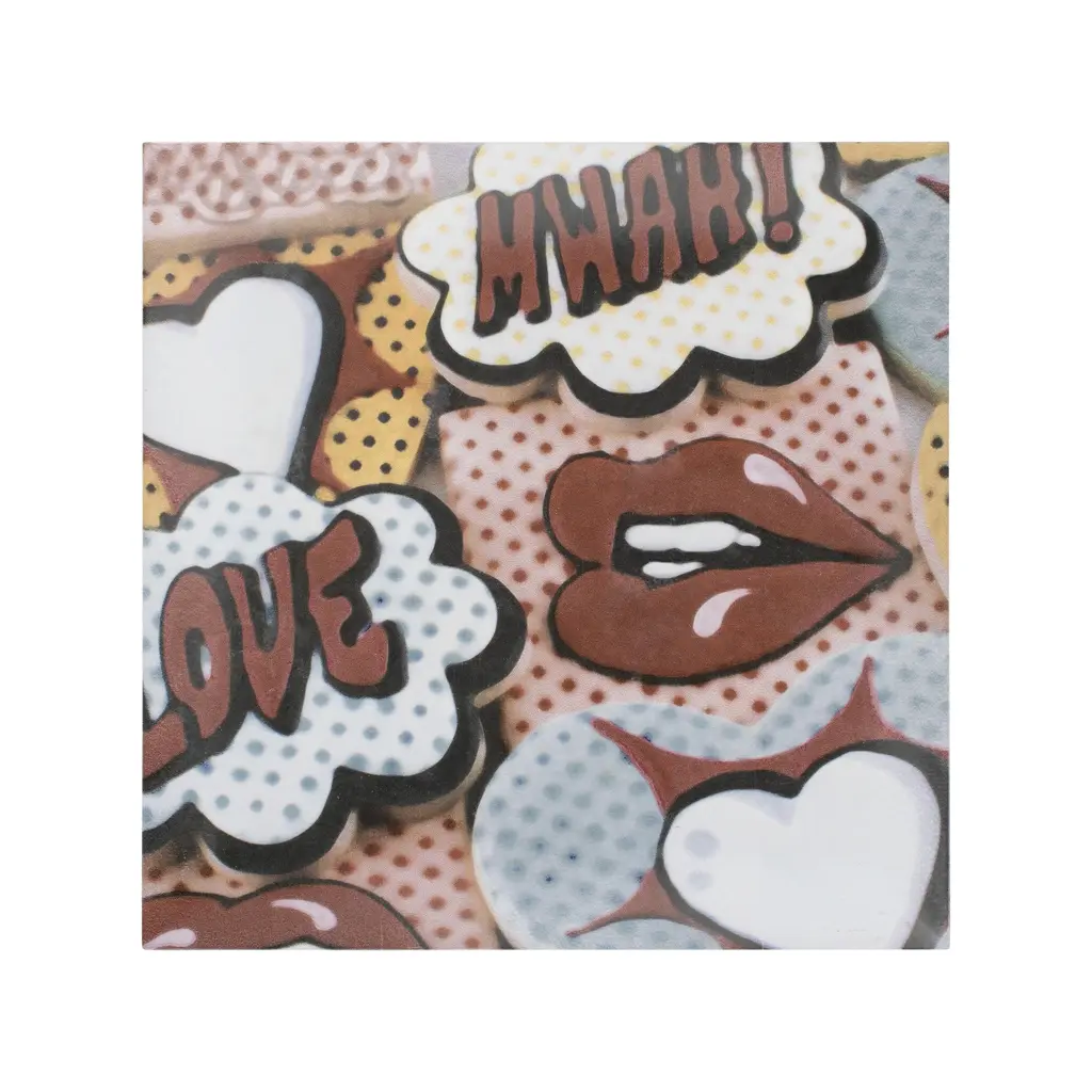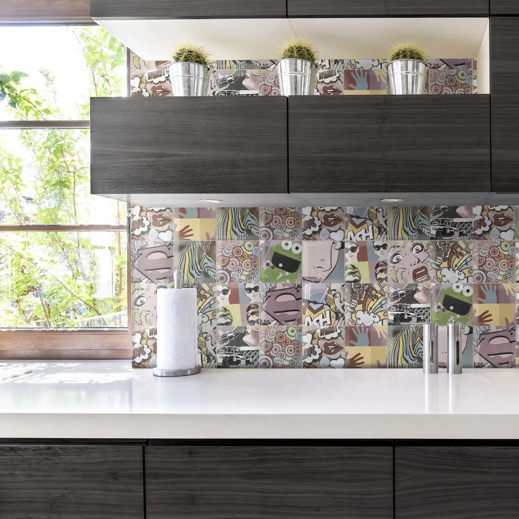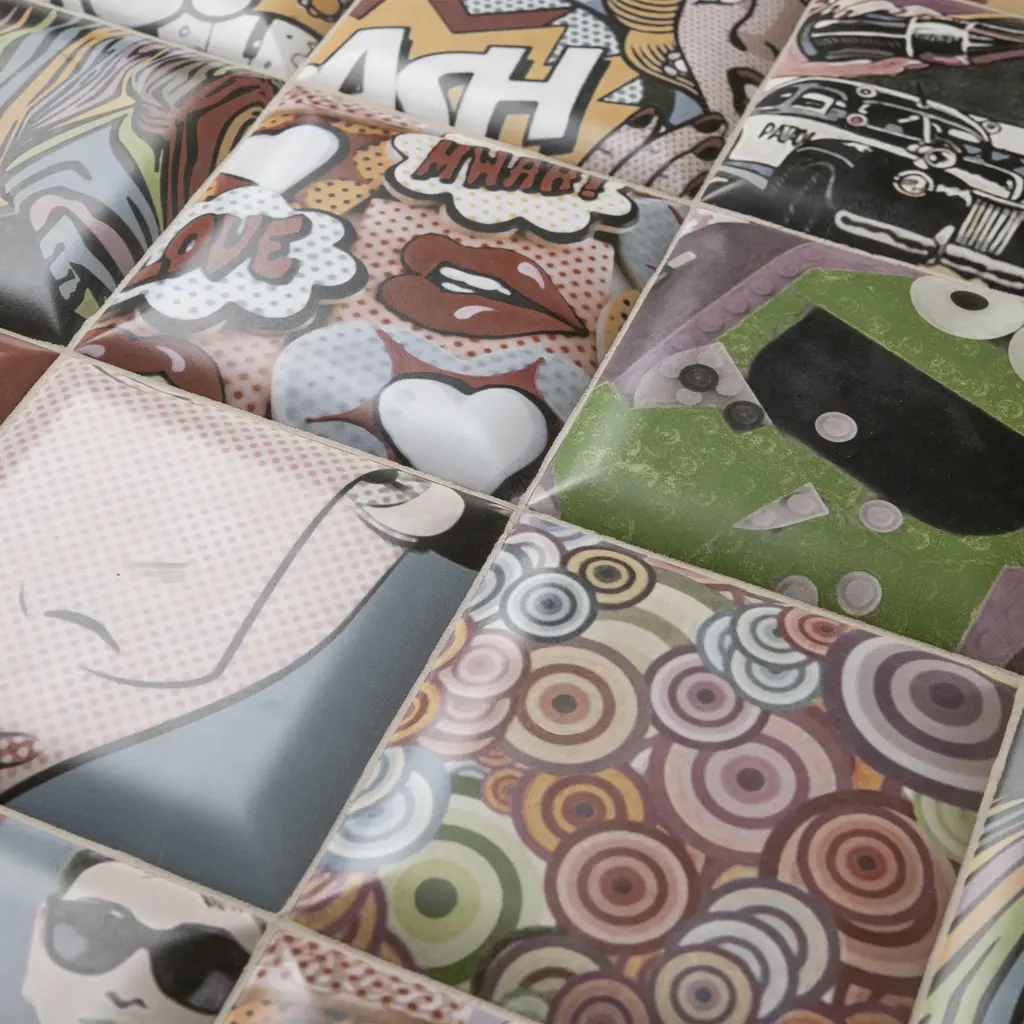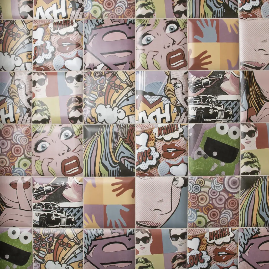 Inspired by comic book like patterns, the Bombato Decor York Ceramic Wall Tile features 12 different designs randomly scattered throughout each case that can be casually mixed and matched. This unique, artistic tile will add a bold, intriguing touch to any space with its bright colors and intricate patterns. This multi-pattern tile radiates creativity and features a smooth, satin finish that gives extra character to this tile. This tile is ideal for indoor wall installations, including backsplashes, bathrooms and fireplaces. Tile is the better choice for your space. This tile is made from natural ingredients, making it a healthy choice as it is free from allergens, VOCs, formaldehyde and PVC. 5.5 square feet, 22 pieces per case. Case weight is 20.59 lbs. Grade 1, first-quality ceramic tile for wall use 5.88 in. width x 5.88 in. length x 0.54 in. thick Glazed, smooth finish with a medium sheen and moderate variation in tone PEI Rating 0 is suitable for wall use only Non-Vitreous tiles have water absorption of more than 7% for indoor use DCOF value is not available for this product. Please reference the PEI and MOHS rating for installation. Not frost resistant Please note: A sample of this product may be a partial piece cut from the full size tile in order to provide an affordable and convenient way for customers to judge the quality and finish of this item. Samples are not returnable.