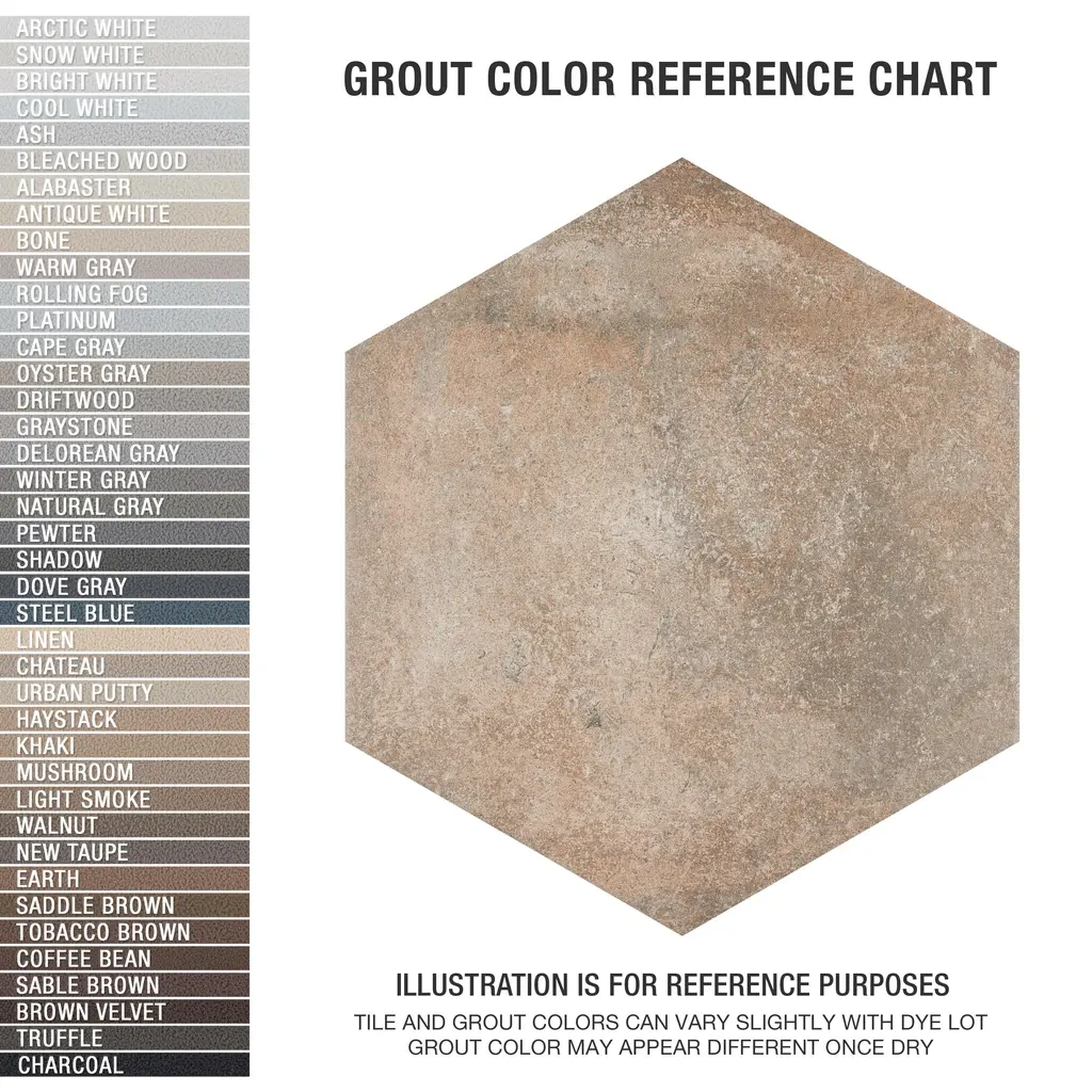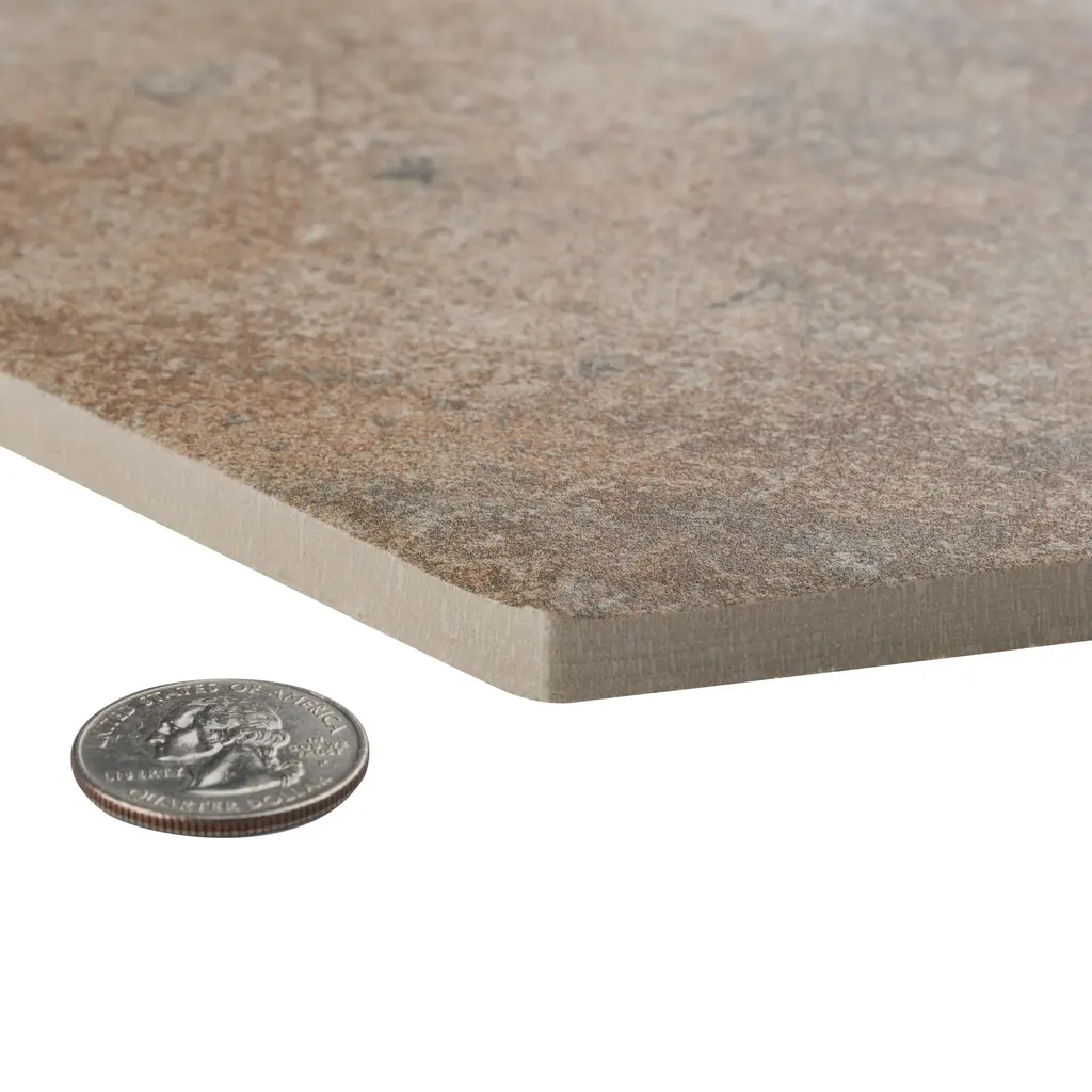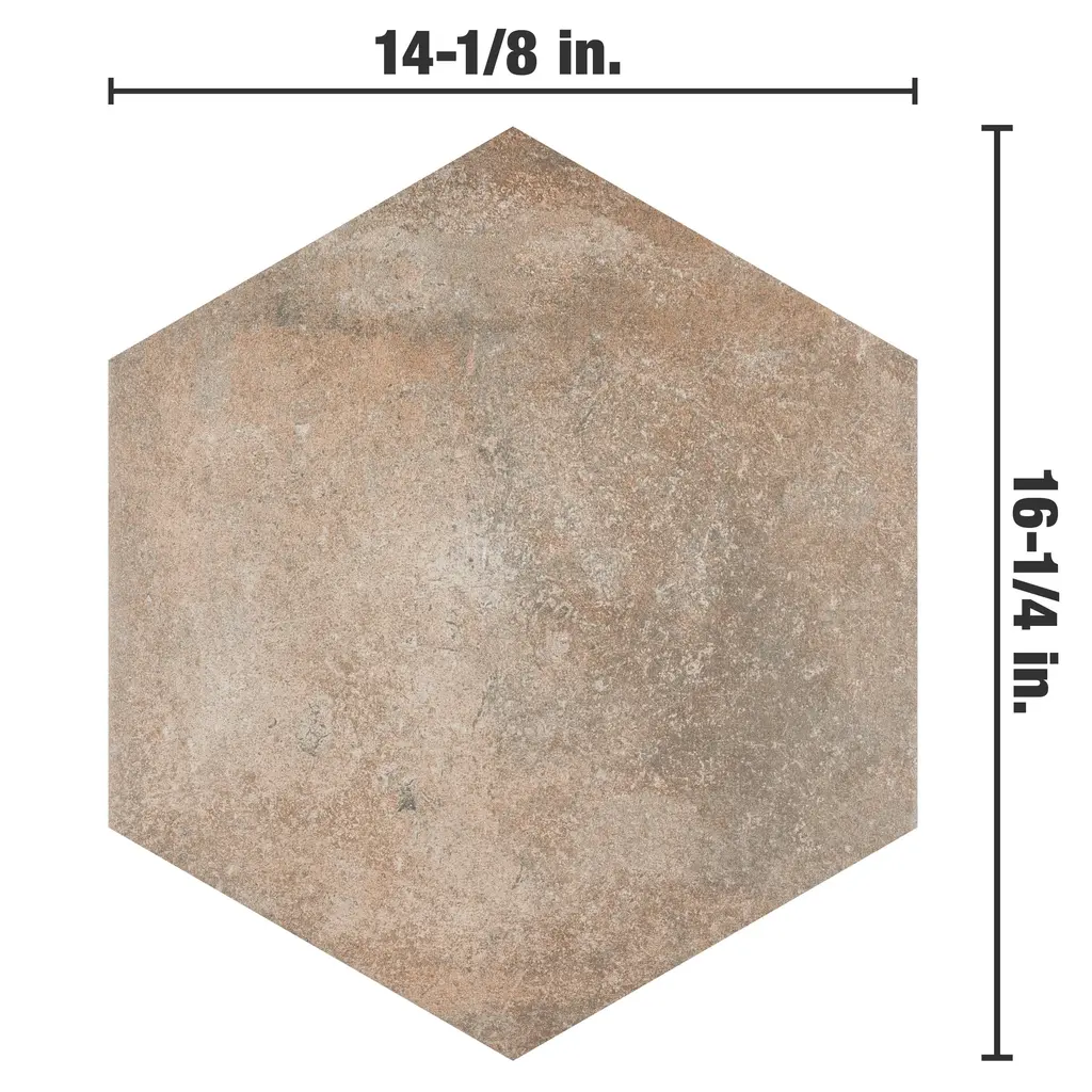 Bring a rustic feel to any space with our Boston Ferro Hex Crema Porcelain Floor and Wall Tile. This impervious tile has substantial variation between each case, which offers a one-of-a-kind look. With tones of beige, auburn and ash grey that vary throughout every piece, no two looks will ever be the same. This tile offers endless design possibilities when paired with other products in the Boston Ferro series. Use this slightly textured tile in all indoor and outdoor locations, including walls, floors and patios. Tile is the better choice for your space. This tile is made from natural ingredients, making it a healthy choice as it is free from allergens, VOCs, formaldehyde and PVC. 11.07 square feet, 9 pieces per case. Case weight is 48.28 lbs. Grade 1, first-quality porcelain tile for floor and wall use 14.13 in. width x 16.25 in. length x 0.38 in. thick Glazed, slightly textured finish with a medium sheen and moderate variation in tone PEI Rating III is suitable for medium-duty residential floors including kitchens, halls, corridors, balconies, terraces and areas used more often with normal footwear and small amounts of dirt Impervious tiles have a water absorption of less than 0.5% for indoor and outdoor use and are frost resistant This tile is ADA approved for slip resistance with a DCOF value of 0.42 or higher. Completely frost resistant for indoor or outdoor applications; use a latex-modified thinset for acceptable bond strength Please note: A sample of this product may be a partial piece cut from the full size tile in order to provide an affordable and convenient way for customers to judge the quality and finish of this item. Samples are not returnable.