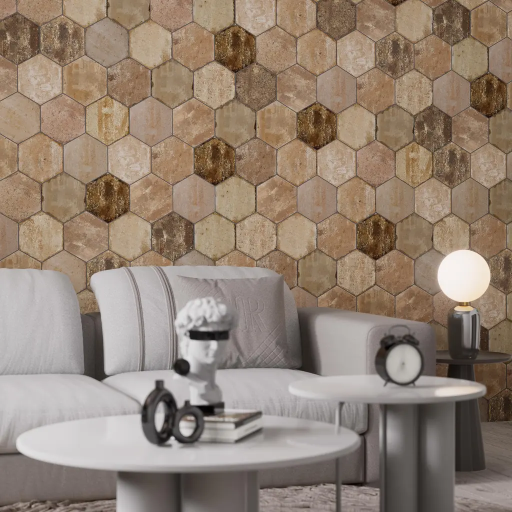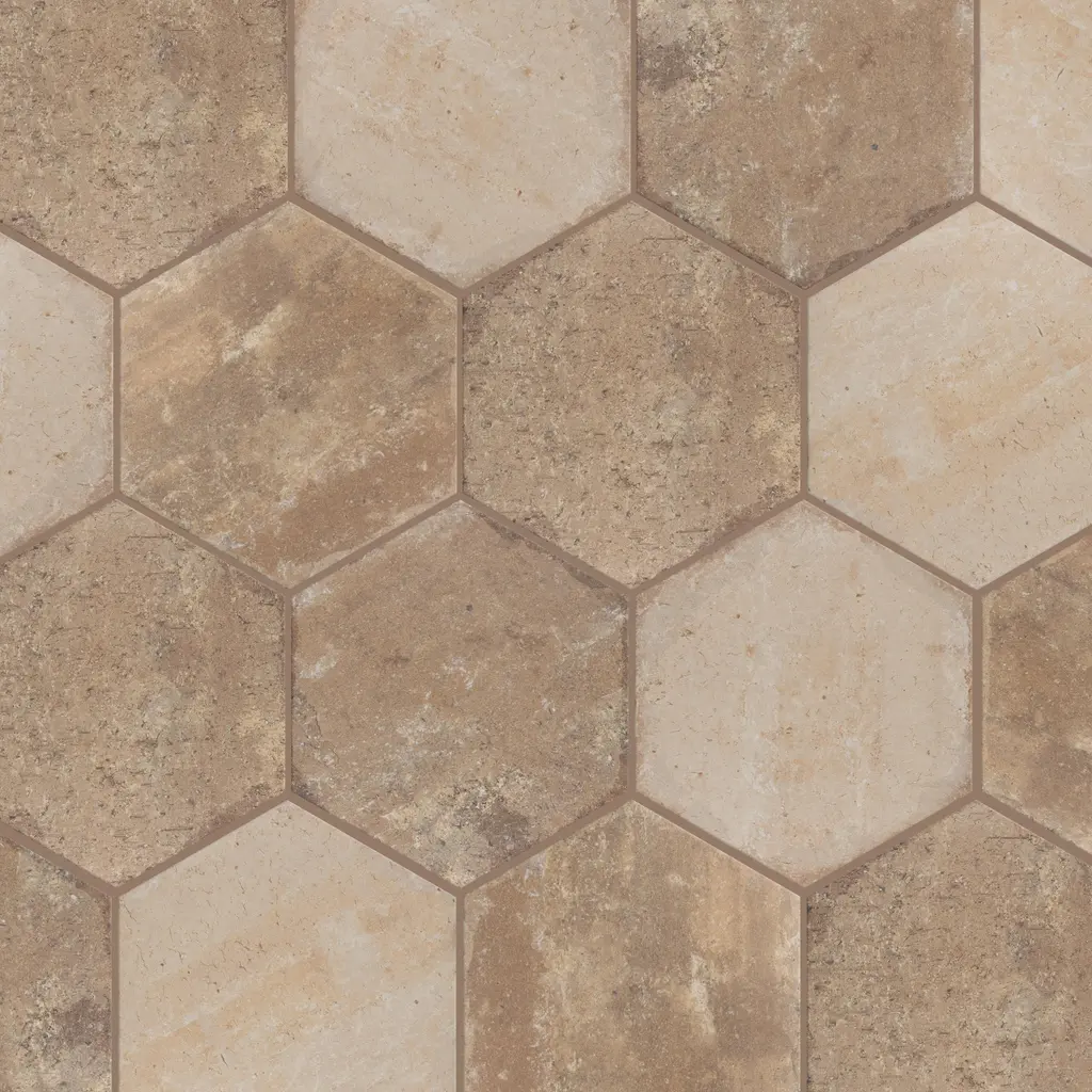 Inspired by a rustic look, our Brickyard Hex Beige Porcelain Floor and Wall Tile features a medium textured, matte finish, providing decorative appeal that adapts to a variety of stylistic contexts. Containing 40 different print variations that are randomly distributed throughout each case, this beige hexagon tile offers a one-of-a-kind look. With its impervious, frost-resistant features, this tile is an ideal selection for both indoor and outdoor residential installations, including kitchens, bathrooms, backsplashes, showers, hallways and fireplace facades. This tile is a perfect choice on its own or paired with other products in the Brickyard Collection. Tile is the better choice for your space! 13.05 square feet, 29 pieces per case. Case weight is 51.04 lbs. Grade 1, first-quality porcelain tile for floor and wall use 8.5 in. width x 9.88 in. length x 0.35 in. thick Glazed, medium textured finish with a low sheen and substantial variation in tone PEI Rating III is suitable for medium-duty residential floors including kitchens, halls, corridors, balconies, terraces and areas used more often with normal footwear and small amounts of dirt Impervious tiles have a water absorption of less than 0.5% for indoor and outdoor use and are frost resistant This tile is ADA approved for slip resistance with a DCOF value of 0.42 or higher. Completely frost resistant for indoor or outdoor applications; use a latex-modified thinset for acceptable bond strength Please note: A sample of this product may be a partial piece cut from the full size tile in order to provide an affordable and convenient way for customers to judge the quality and finish of this item. Samples are not returnable.