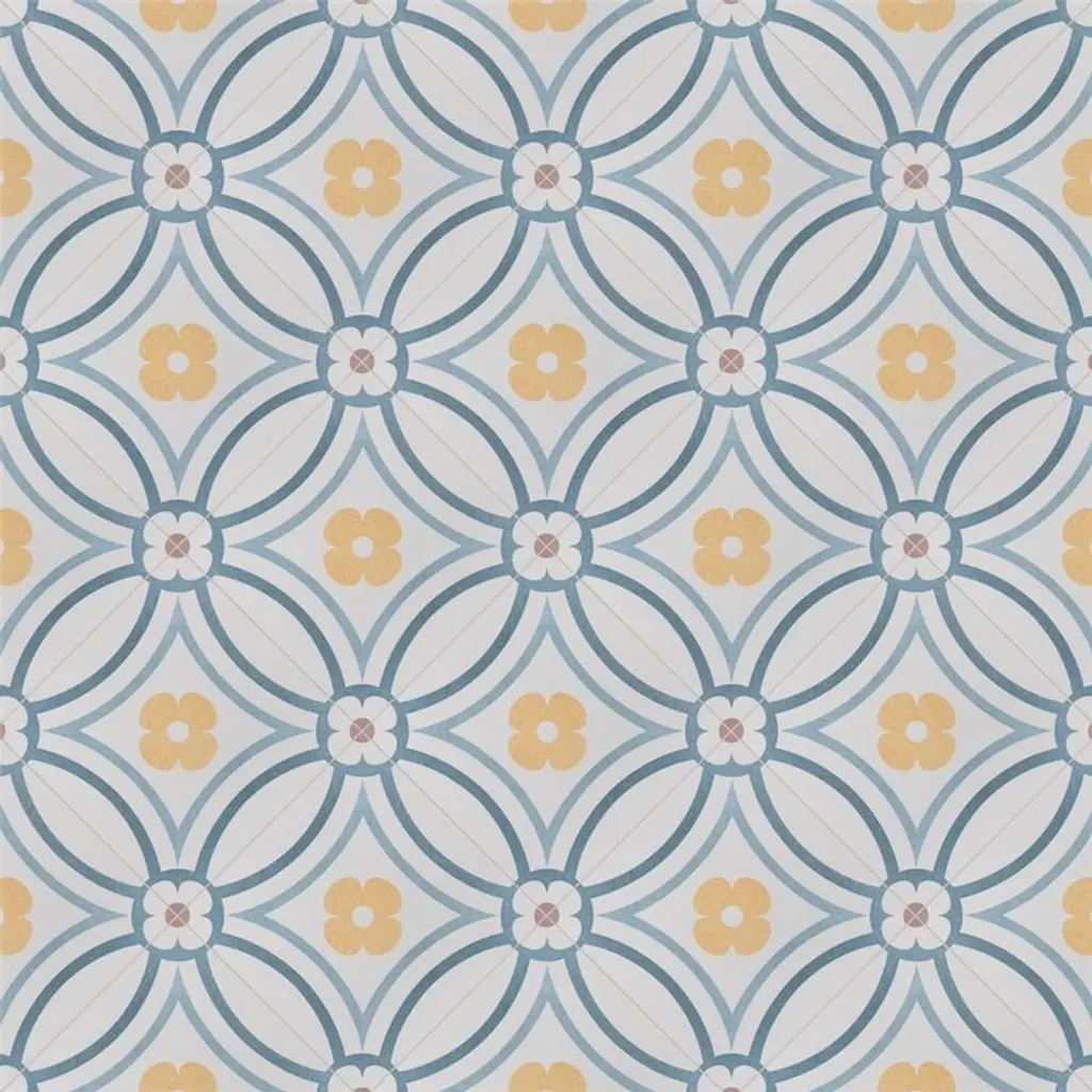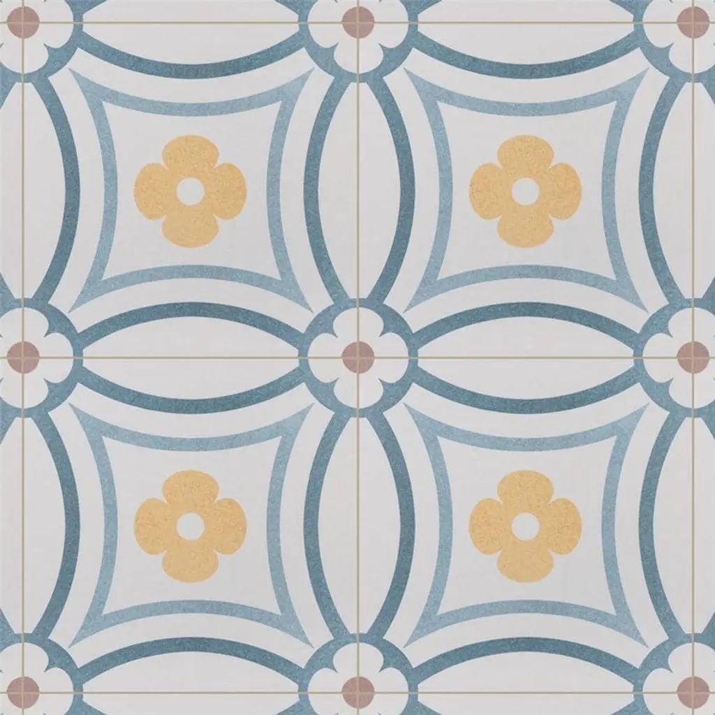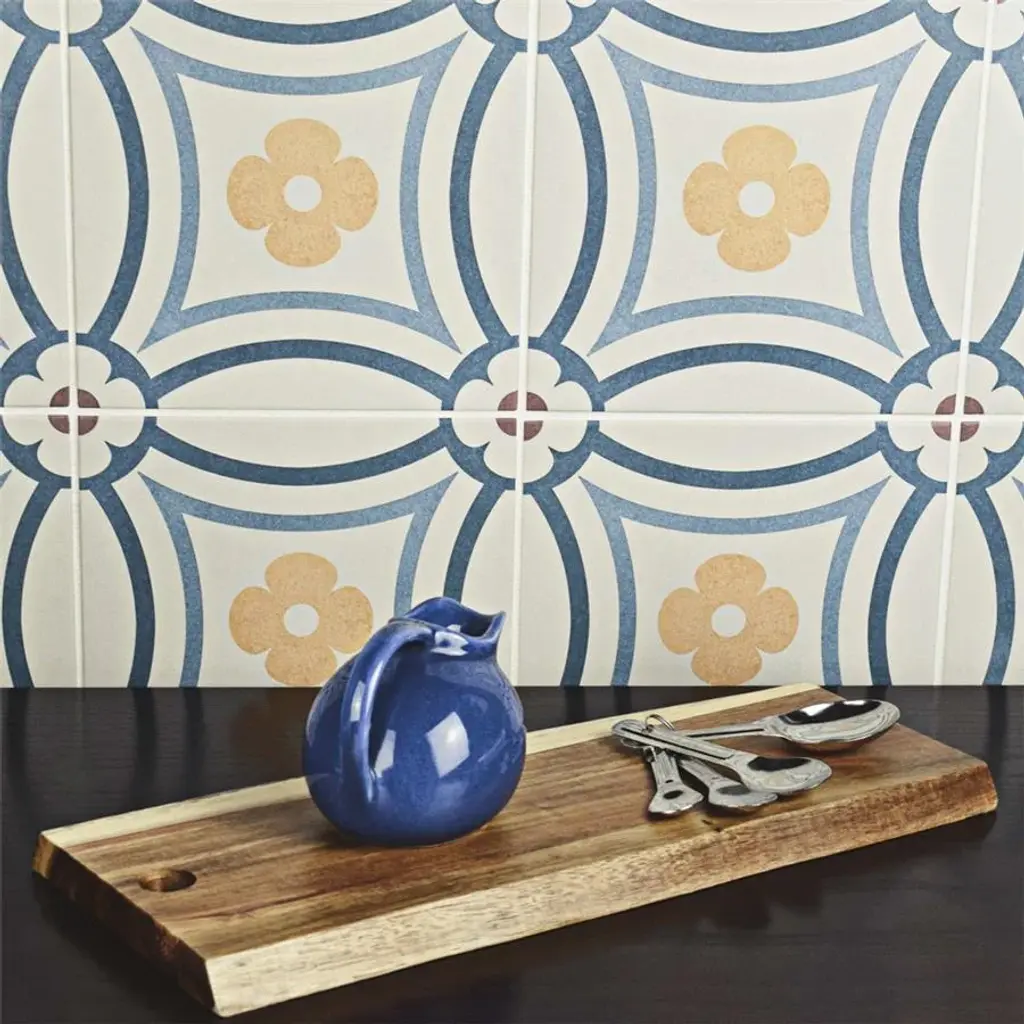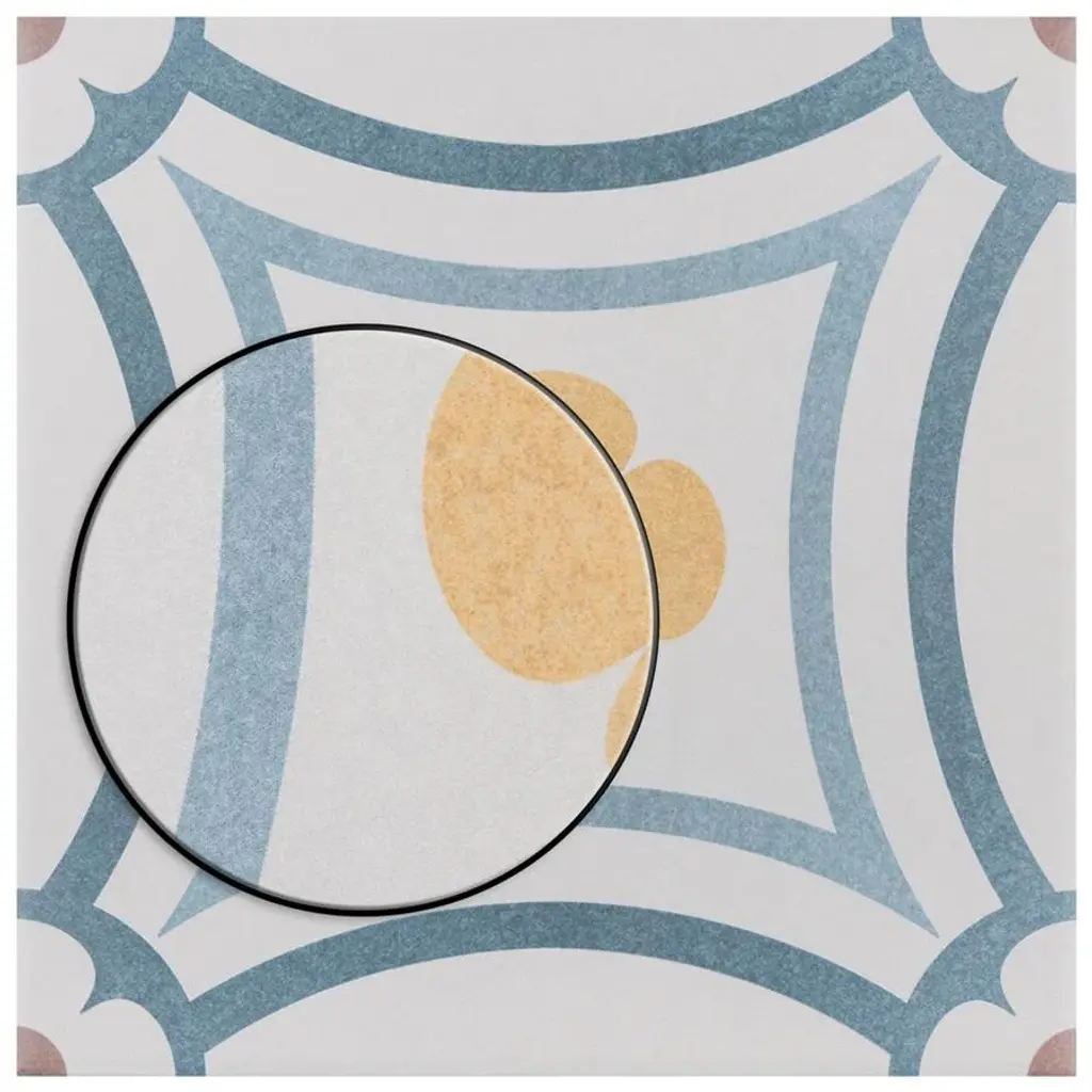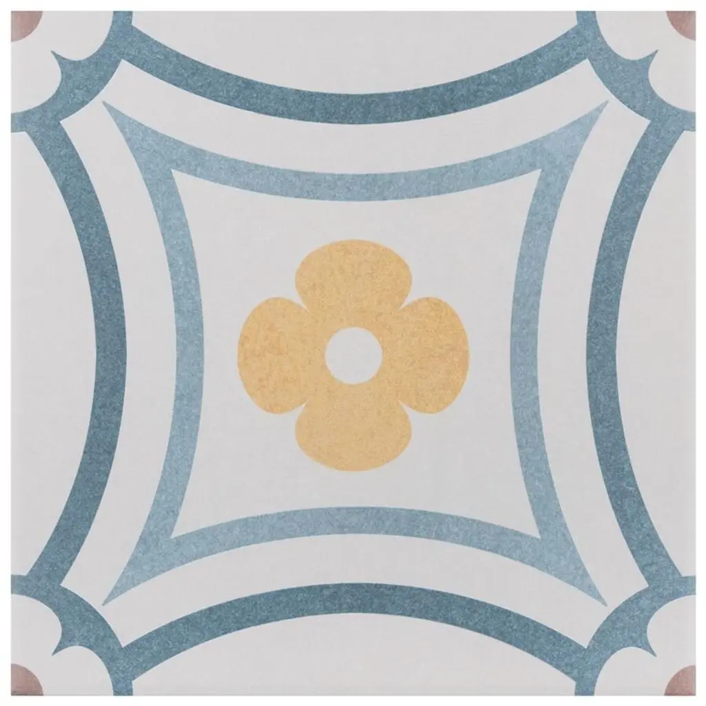 Achieve patterned elegance with the Caprice Saint Tropez Encaustic 7-7/8 in. x 7-7/8 in. Porcelain Floor and Wall Tile. This tile features dueling denim blue arcs that are accented with hues of goldenrod and wine on an eggshell background. Great for bringing an encaustic look to the home, this slightly textured tile has a matte glazed finish. Durable and frost resistant, this tile is great for any residential location, including entryways, kitchens, showers and patios. It also has a slip-resistant surface, making it safe for wet locations.