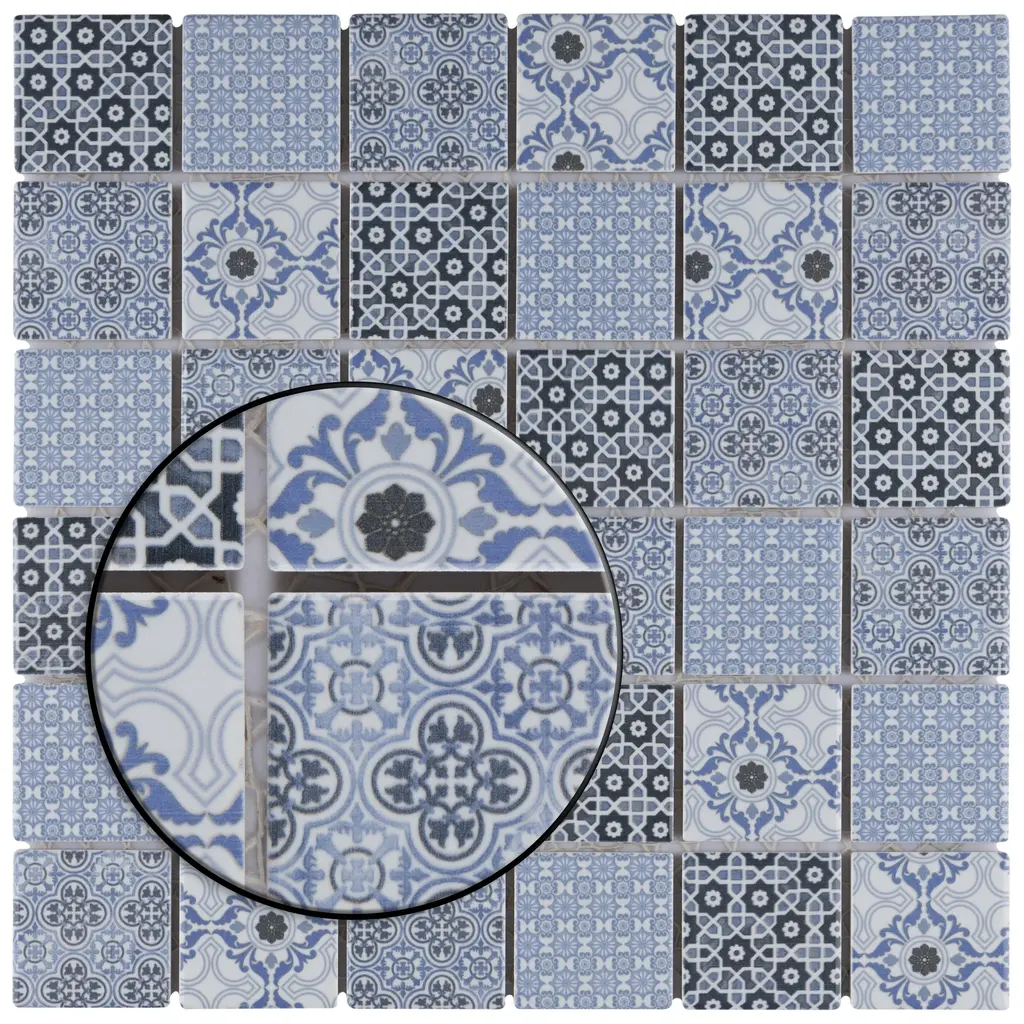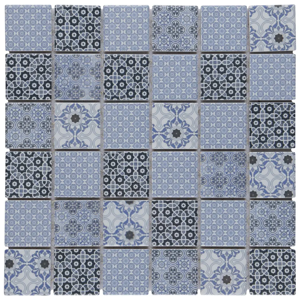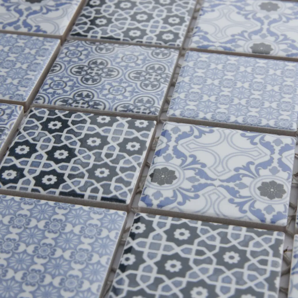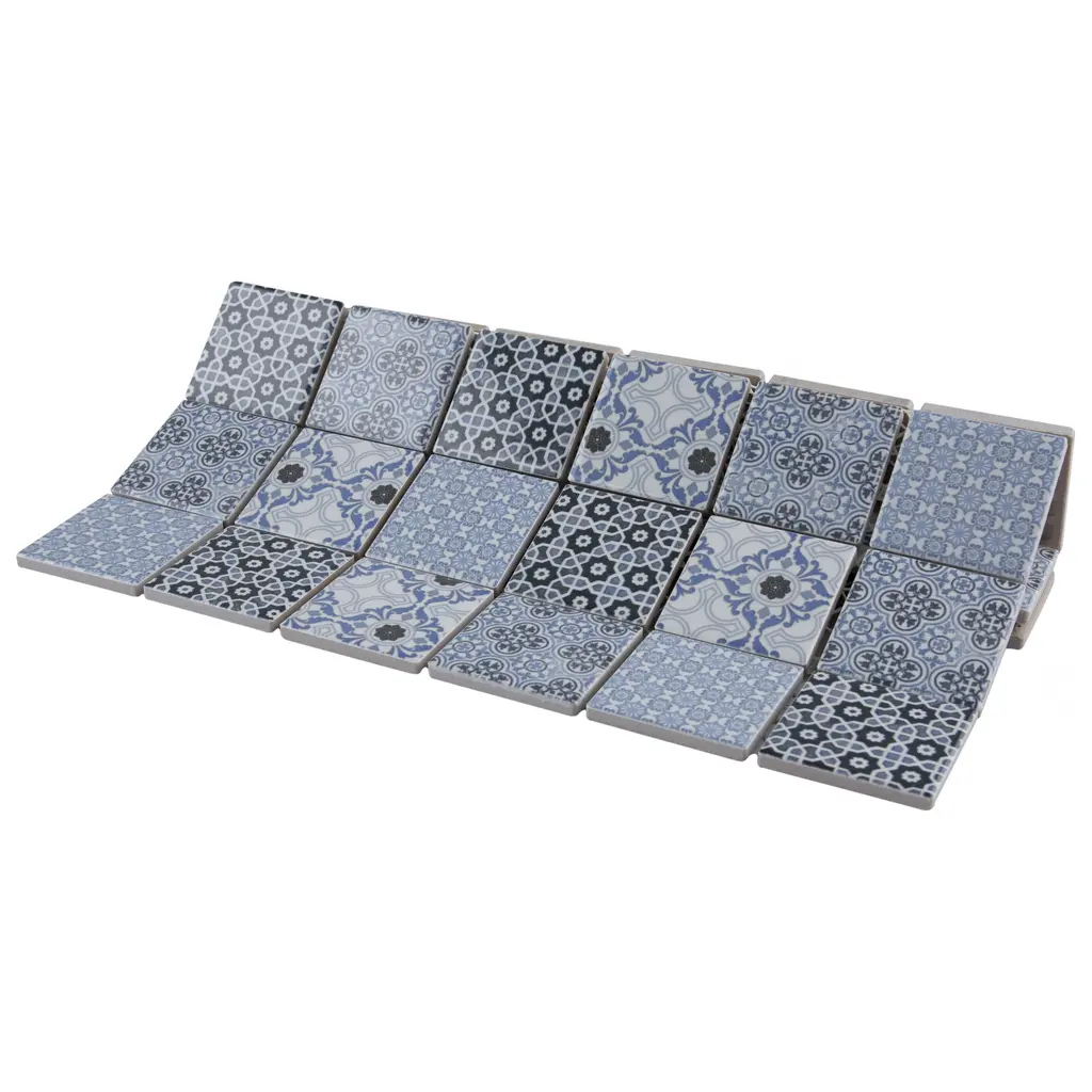Our Classico Blue Porcelain Floor and Wall Tile ties together the intricate look of individual tiles with the easy installation of a mosaic. This geometric patchwork mosaic features four varying old-world designs in light and dark blue tones with a smooth surface. This multi-patterned tile puts a contemporary twist on the traditional simplistic nature of mosaic tile. Glossy squares are arranged on an interlocking mesh to create a seamless installation. Its impervious and frost-resistant features make this an ideal tile for both indoor and outdoor residential use, including backsplashes, bathrooms, showers and kitchens. Tile is the better choice for your space. This tile is made from natural ingredients, making it a healthy choice as it is free from allergens, VOCs, formaldehyde and PVC. 9.8 square feet, 10 pieces per case. Case weight is 24.3 lbs. Grade 1, first-quality porcelain tile for floor and wall use 11.75 in. width x 11.75 in. length x 0.28 in. thick mesh-mounted mosaic Glazed, smooth finish with a high sheen and slight variation in tone PEI Rating II is suitable for all interior walls and light foot traffic such as powder rooms Impervious tiles have a water absorption of less than 0.5% for indoor and outdoor use and are frost resistant This tile has a COF wet rating less than or equal to 0.50 and is considered to have a marginally low skid resistance. This tile is not ADA approved for slip resistance. Completely frost resistant for indoor or outdoor applications; use a latex-modified thinset for acceptable bond strength Please note: A sample of this product may be a partial piece cut from the full size tile in order to provide an affordable and convenient way for customers to judge the quality and finish of this item. Samples are not returnable.