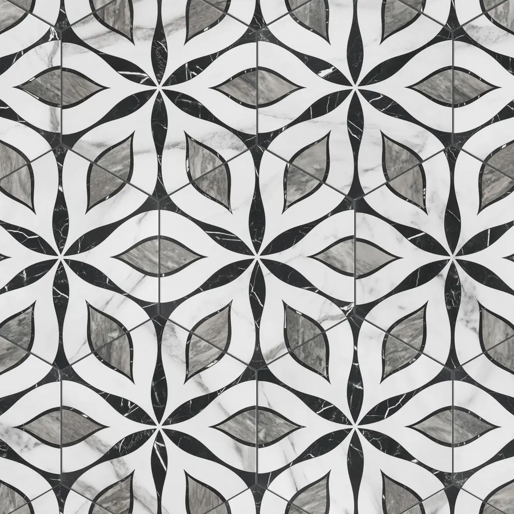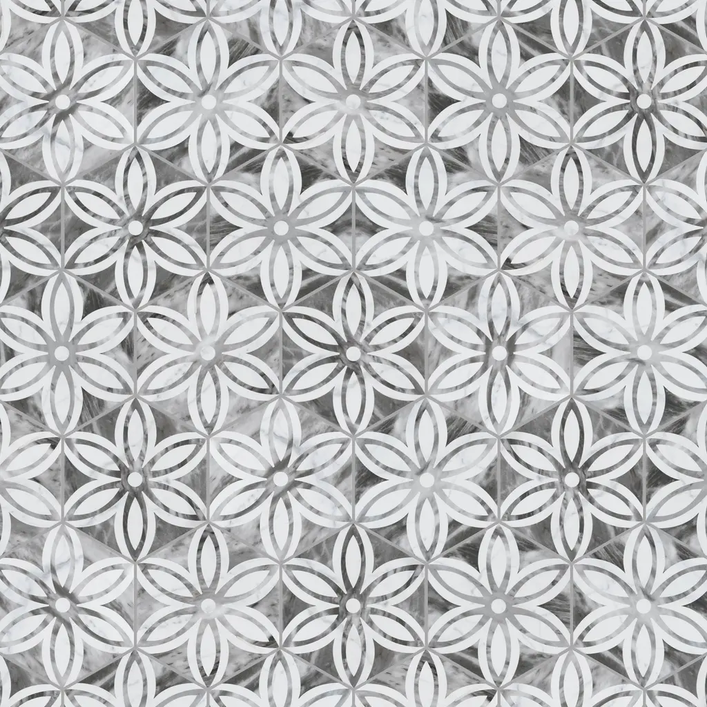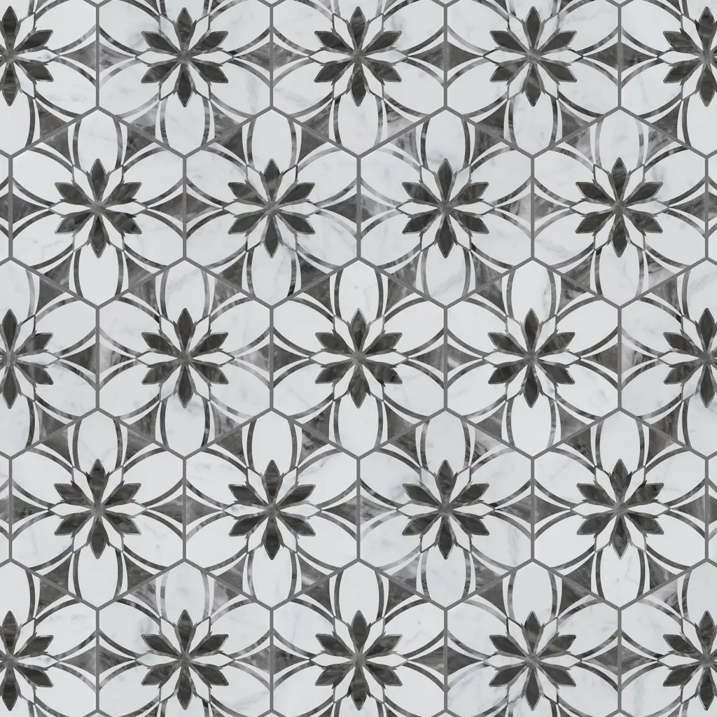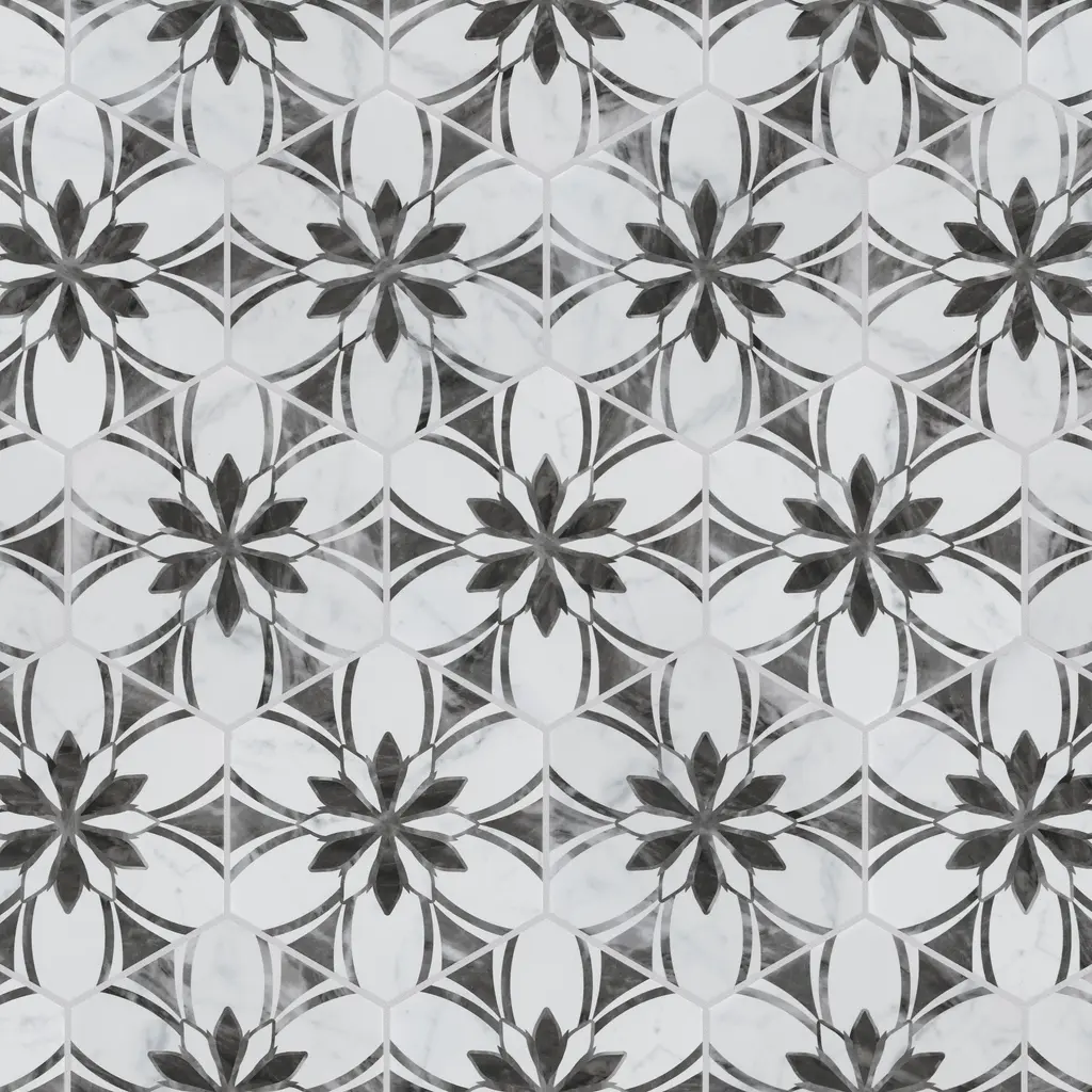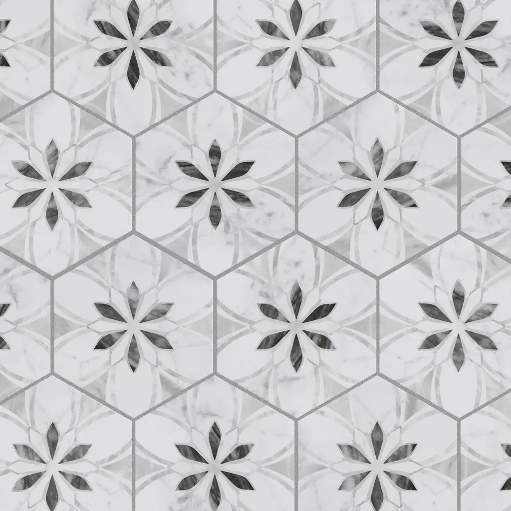 Emulating the timeless beauty of marble stone in an easy to maintain porcelain material, our Classico Bardiglio Hex Dahlia Dark Porcelain Floor and Wall Tile, brings functional sophistication into any space. This matte hexagon tile features black and grey floral patterns with grey veining and striations set on a white base glaze. This innovative and sophisticated display of geometric design is visually appealing and versatile and adapts to any stylistic context. Its impervious and frost-resistant features make it an ideal choice for indoor and outdoor installations including kitchens, bathrooms, backsplashes, showers, entryways, and patios. This tile is a perfect choice on its own or coordinated with other products in the Classico Bardiglio series. Tile is the better choice for your space Tile is the better choice for your space. This tile is made from natural ingredients, making it a healthy choice as it is free from allergens, VOCs, formaldehyde, and PVC. 7.5 square feet, 25 pieces per case. Case weight is 28.99 lbs. Grade 1, first-quality porcelain tile for floor and wall use 7 in. width x 8 in. length x 0.34 in. thick Glazed, slightly textured finish with a medium sheen and slight variation in tone PEI Rating III is suitable for medium-duty residential floors including kitchens, halls, corridors, balconies, terraces and areas used more often with normal footwear and small amounts of dirt Impervious tiles have a water absorption of less than 0.5% for indoor and outdoor use and are frost resistant This tile is ADA approved for slip resistance with a DCOF value of 0.42 or higher. Completely frost resistant for indoor or outdoor applications; use a latex-modified thinset for acceptable bond strength Please note: A sample of this product may be a partial piece cut from the full size tile in order to provide an affordable and convenient way for customers to judge the quality and finish of this item. Samples are not returnable.