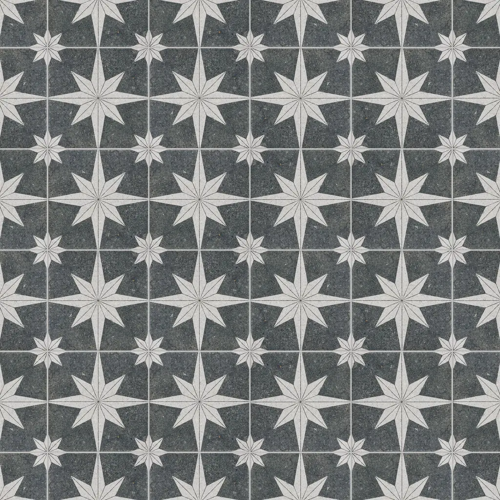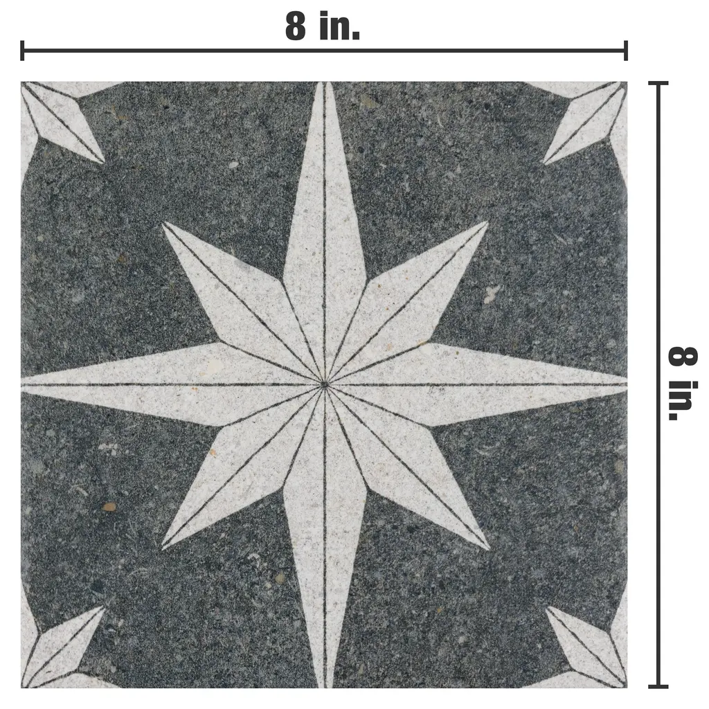Offering the appearance of patterned natural stone, our Compass Star Lava Stone Porcelain Floor and Wall Tile transforms any space into a functional and stylish extension of nature. This square tile features a large off-white geometric star atop a charcoal black base. Richly detailed with a slightly textured surface, this on-trend porcelain tile offers decorative, rustic beauty through natural mineral-like pattern variations and imitation scuffs and spots, replicating the appearance of natural stone. This stylish stone-look design is visually appealing and versatile, blending beautifully with a range of looks from vintage industrial to modern day. Its impervious and frost-resistant features make this an ideal choice for indoor and outdoor installations including kitchens, bathrooms, backsplashes, showers, entryways, patios and pools. This tile is a perfect choice on its own or paired with other products in the Compass Star collection. Tile is the better choice for your space. This tile is made from natural ingredients, making it a healthy choice as it is free from allergens, VOCs, formaldehyde and PVC. 11.5 square feet, 25 pieces per case. Case weight is 41.69 lbs. Grade 1, first-quality porcelain tile for floor and wall use 8 in. width x 8 in. length x 0.31 in. thick Glazed, slightly textured finish with a low sheen and uniform appearance in tone PEI Rating III is suitable for medium-duty residential floors including kitchens, halls, corridors, balconies, terraces and areas used more often with normal footwear and small amounts of dirt Impervious tiles have a water absorption of less than 0.5% for indoor and outdoor use and are frost resistant This tile is ADA approved for slip resistance with a DCOF value of 0.42 or higher. Completely frost resistant for indoor or outdoor applications; use a latex-modified thinset for acceptable bond strength Please note: A sample of this product may be a partial piece cut from the full size tile in order to provide an affordable and convenient way for customers to judge the quality and finish of this item. Samples are not returnable.