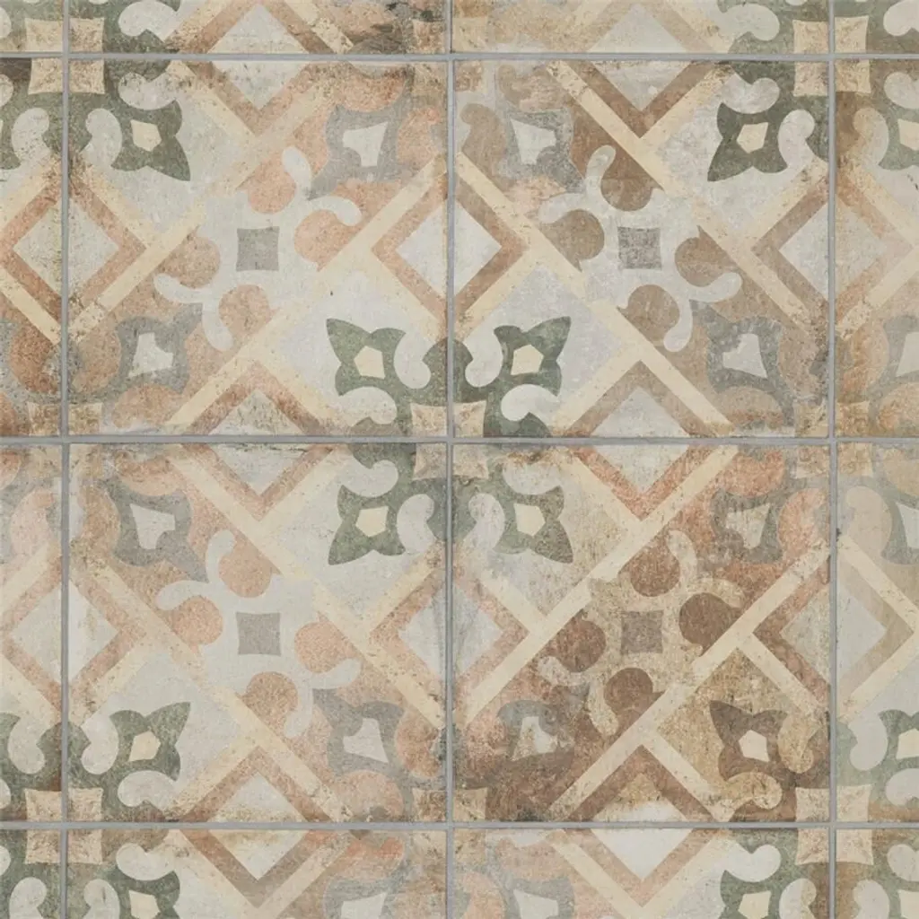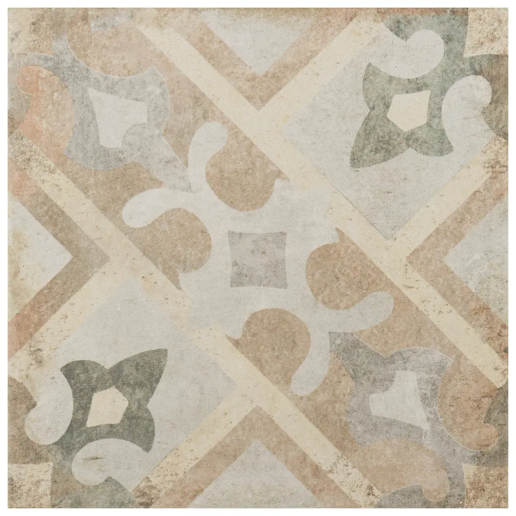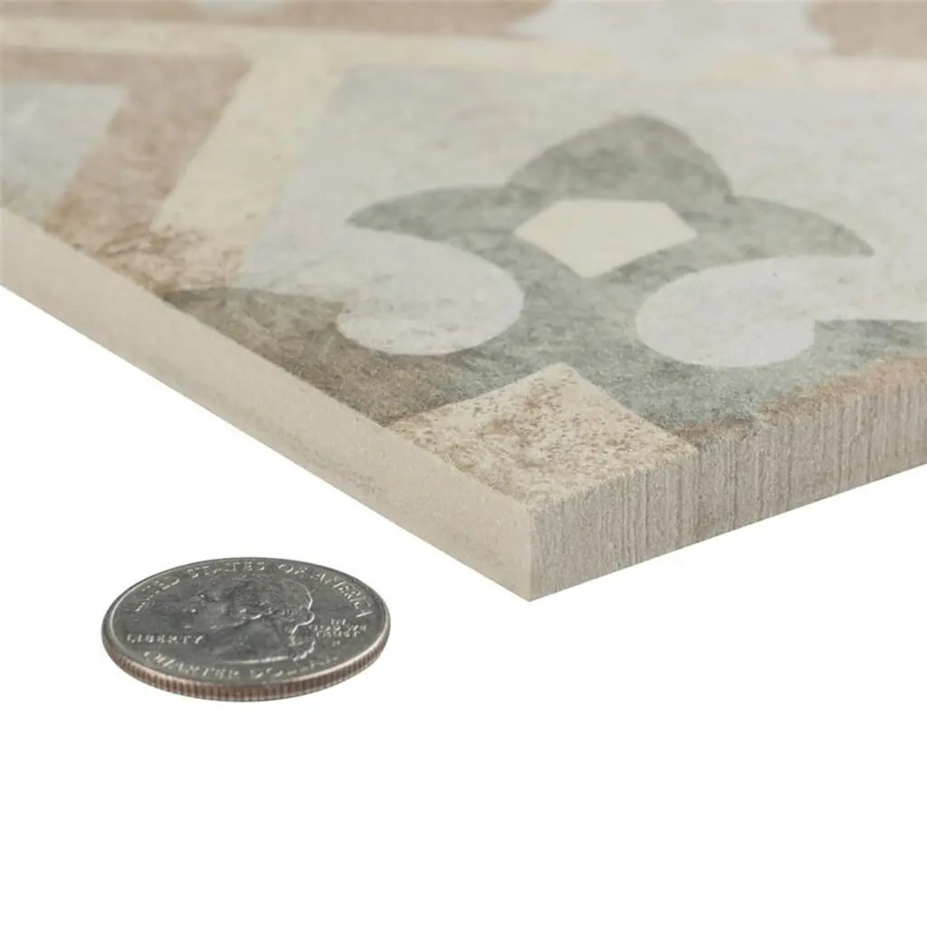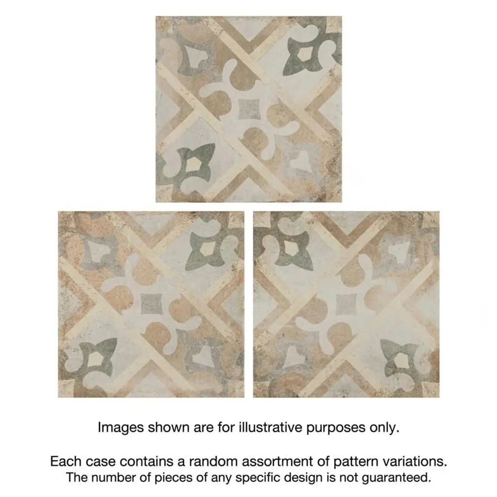 Our D’Anticatto Decor Laterza Porcelain Floor and Wall Tile radiates rustic charm. Mimicking a worn cement appearance, this porcelain tile is a subtle statement piece created by geometric motifs in faded pastel shades of moss green, copper, fog grey and light yellow set on a textured light beige base glaze. With rust colored accents and realistic imitations of scuffs and spots, this encaustic inspired tile evokes a loved, worn and century-old appearance. Available in twenty-five print variations that are randomly scattered throughout each case, the variation throughout each tile mimics an authentic aged appearance. Its impervious, frost-resistant and durable features make this tile and ideal choice for both indoor and outdoor residential installations including, backsplashes, kitchens, bathrooms, showers, entryways and patios. This tile is a perfect choice on its own or paired with other products in the D’Anticatto Collection. Tile is the better choice for your space. This tile is made from natural ingredients, making it a healthy choice as it is free from allergens, VOCs, formaldehyde and PVC. 11.0 square feet, 20 pieces per case. Case weight is 45.88 lbs. Grade 1, first-quality porcelain tile for floor and wall use 8.75 in. width x 8.75 in. length x 0.38 in. thick Glazed, medium textured finish with a low sheen and moderate variation in tone PEI Rating III is suitable for medium-duty residential floors including kitchens, halls, corridors, balconies, terraces and areas used more often with normal footwear and small amounts of dirt Impervious tiles have a water absorption of less than 0.5% for indoor and outdoor use and are frost resistant This tile is ADA approved for slip resistance with a DCOF value of 0.42 or higher. Completely frost resistant for indoor or outdoor applications; use a latex-modified thinset for acceptable bond strength Please note: A sample of this product may be a partial piece cut from the full size tile in order to provide an affordable and convenient way for customers to judge the quality and finish of this item. Samples are not returnable.