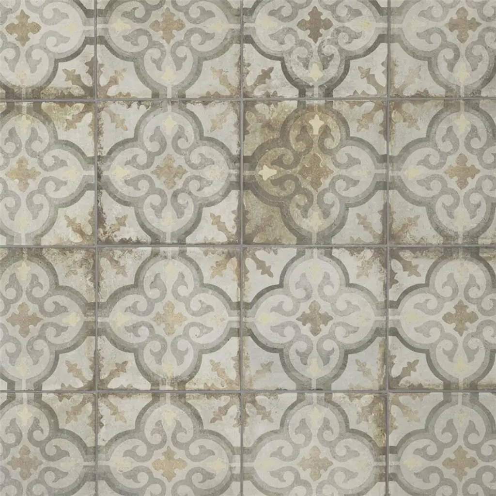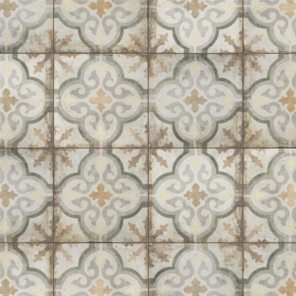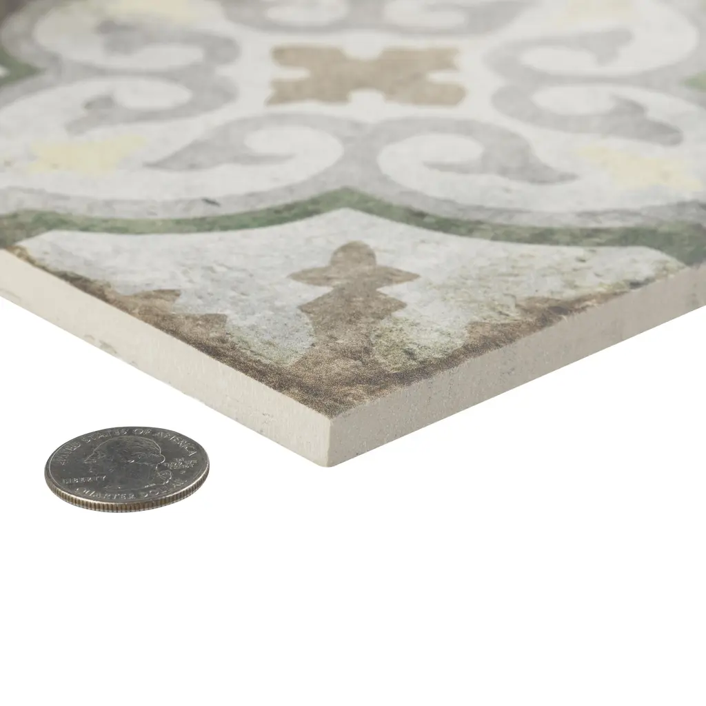 Our D’Anticatto Decor Palazzo Porcelain Floor and Wall Tile radiates rustic charm. Mimicking a worn cement appearance, this porcelain tile is a subtle statement piece created by geometric motifs in faded pastel shades of moss green, copper, fog grey and light yellow set on a textured light beige base glaze. With rust colored accents and realistic imitations of scuffs and spots, this encaustic inspired tile evokes a loved, worn and century-old appearance. Available in six print variations that are randomly scattered throughout each case, the variation throughout each tile mimics an authentic aged appearance. Its impervious, frost-resistant and highly durable features make this tile and ideal choice for both indoor and outdoor commercial and residential installations including backsplashes, kitchens, bathrooms, showers, entryways and patios. This tile is a perfect choice on its own or paired with other products in the D’Anticatto Collection. Tile is the better choice for your space. This tile is made from natural ingredients, making it a healthy choice as it is free from allergens, VOCs, formaldehyde and PVC. 11.0 square feet, 20 pieces per case. Case weight is 45.88 lbs. Grade 1, first-quality porcelain tile for floor and wall use 8.75 in. width x 8.75 in. length x 0.38 in. thick Glazed, medium textured finish with a low sheen and moderate variation in tone PEI Rating IV has high resistance to abrasion and is suitable for heavy-duty residential and commercial kitchens, hotels, exhibition and sales rooms with some dirt conditions Impervious tiles have a water absorption of less than 0.5% for indoor and outdoor use and are frost resistant This tile is ADA approved for slip resistance with a DCOF value of 0.42 or higher. Completely frost resistant for indoor or outdoor applications; use a latex-modified thinset for acceptable bond strength Please note: A sample of this product may be a partial piece cut from the full size tile in order to provide an affordable and convenient way for customers to judge the quality and finish of this item. Samples are not returnable.
