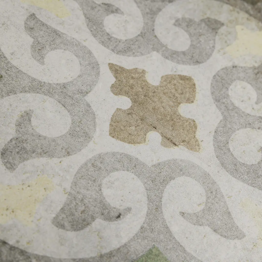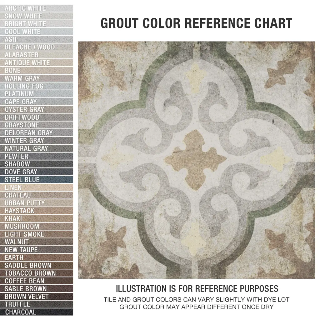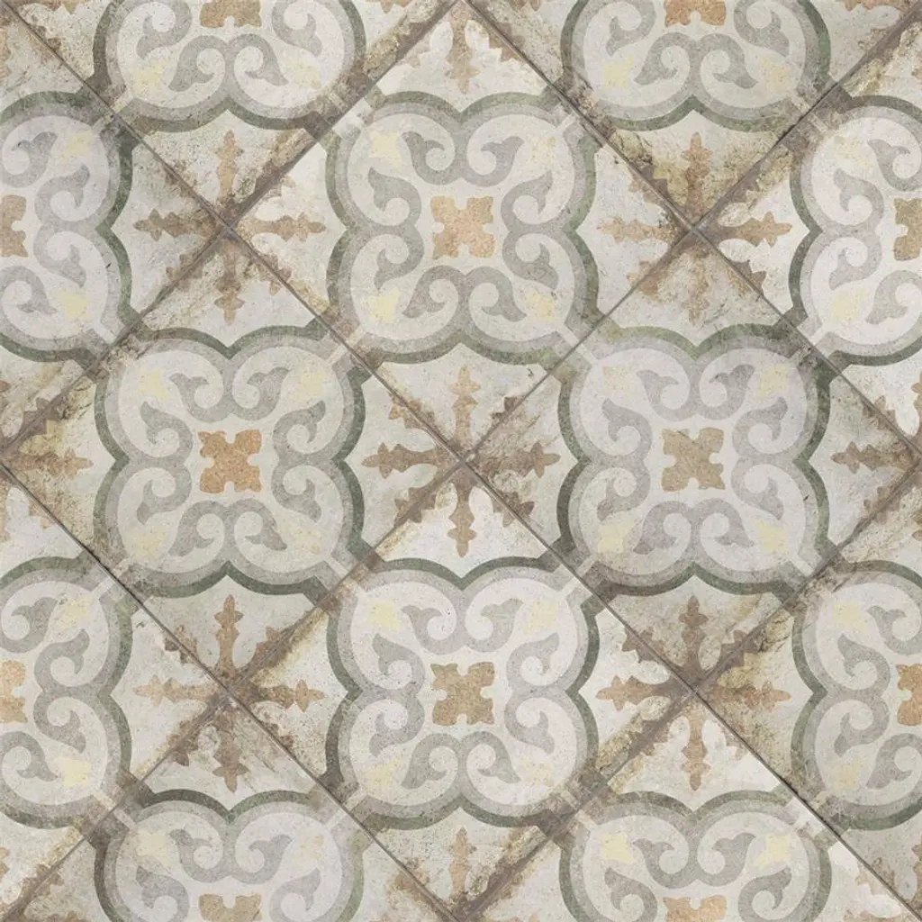 Our D’Anticatto Decor Palazzo Porcelain Floor and Wall Tile radiates rustic charm. Mimicking a worn cement appearance, this porcelain tile is a subtle statement piece created by geometric motifs in faded pastel shades of moss green, copper, fog grey and light yellow set on a textured light beige base glaze. With rust colored accents and realistic imitations of scuffs and spots, this encaustic inspired tile evokes a loved, worn and century-old appearance. Available in six print variations that are randomly scattered throughout each case, the variation throughout each tile mimics an authentic aged appearance. Its impervious, frost-resistant and highly durable features make this tile and ideal choice for both indoor and outdoor commercial and residential installations including backsplashes, kitchens, bathrooms, showers, entryways and patios. This tile is a perfect choice on its own or paired with other products in the D’Anticatto Collection. Tile is the better choice for your space. This tile is made from natural ingredients, making it a healthy choice as it is free from allergens, VOCs, formaldehyde and PVC. 11.0 square feet, 20 pieces per case. Case weight is 45.88 lbs. Grade 1, first-quality porcelain tile for floor and wall use 8.75 in. width x 8.75 in. length x 0.38 in. thick Glazed, medium textured finish with a low sheen and moderate variation in tone PEI Rating IV has high resistance to abrasion and is suitable for heavy-duty residential and commercial kitchens, hotels, exhibition and sales rooms with some dirt conditions Impervious tiles have a water absorption of less than 0.5% for indoor and outdoor use and are frost resistant This tile is ADA approved for slip resistance with a DCOF value of 0.42 or higher. Completely frost resistant for indoor or outdoor applications; use a latex-modified thinset for acceptable bond strength Please note: A sample of this product may be a partial piece cut from the full size tile in order to provide an affordable and convenient way for customers to judge the quality and finish of this item. Samples are not returnable.