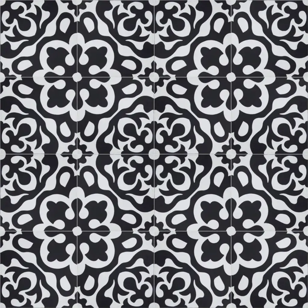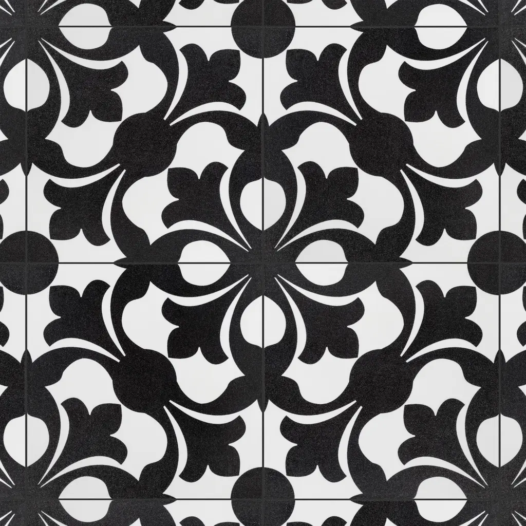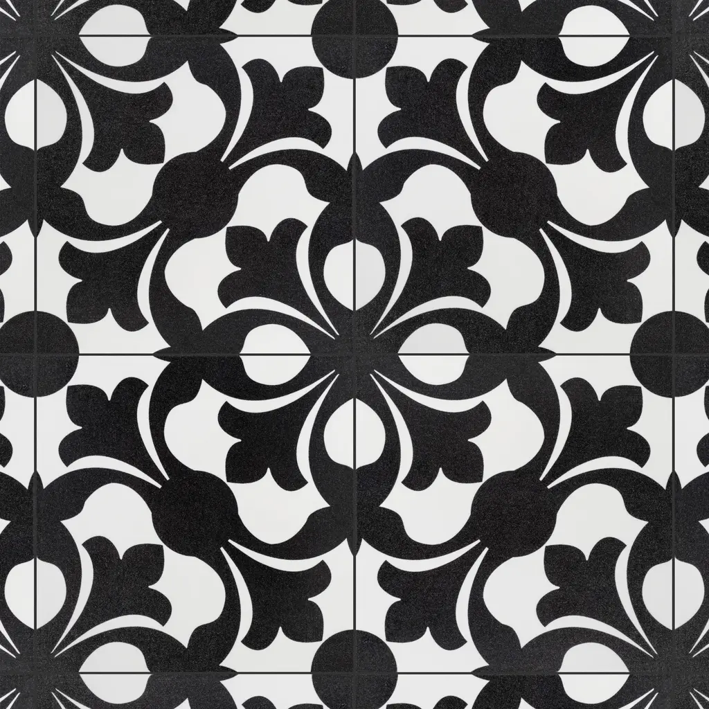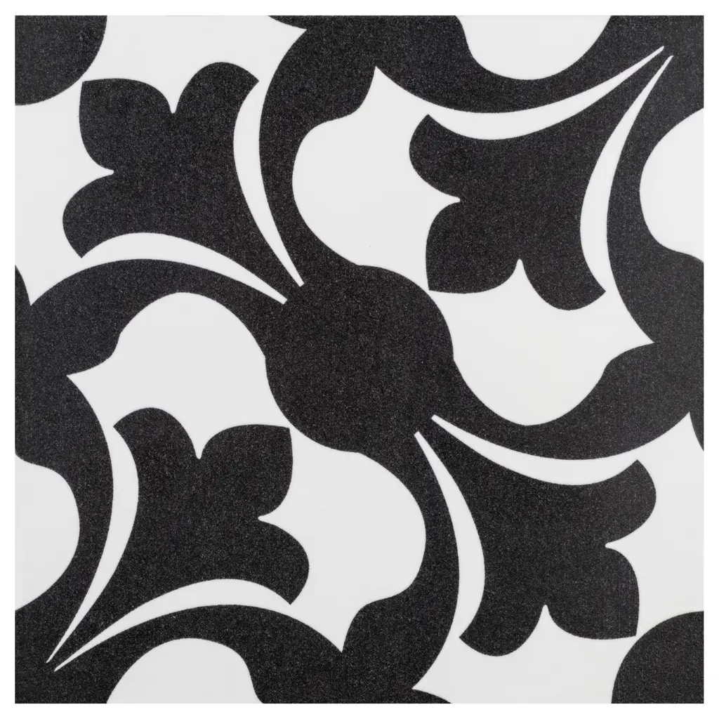 Drawing inspiration from artisan cement tiles, our Emotion Negro Ceramic Floor and Wall Tile is a gorgeous tribute to encaustic design. This ceramic tile features floral old-world patterns in charcoal black that are set on a white glaze, offering subtle contrast and dimension to the decoration. The smooth, satin surface features a weathered, speckled look, replicating the beauty of aged tile. The floral, geometric pattern blends into virtually any design theme, making this an exceptional product for modern installations and historic renovations. This tile is an excellent choice for most interior installations, including showers, kitchens and backsplashes. Tile is the better choice for your space. This tile is made from natural ingredients, making it a healthy choice as it is free from allergens, VOCs, formaldehyde and PVC. 11.0 square feet, 25 pieces per case. Case weight is 48.75 lbs. Grade 1, first-quality ceramic tile for floor and wall use 7.75 in. width x 7.75 in. length x 0.4 in. thick Glazed, smooth finish with a medium sheen and uniform appearance in tone PEI Rating III is suitable for medium-duty residential floors including kitchens, halls, corridors, balconies, terraces and areas used more often with normal footwear and small amounts of dirt Semi-Vitreous tiles have water absorption of more than 3% but less than 7% for indoor use This tile has a COF wet rating less than or equal to 0.50 and is considered to have a marginally low skid resistance. This tile is not ADA approved for slip resistance. Not frost resistant Please note: A sample of this product may be a partial piece cut from the full size tile in order to provide an affordable and convenient way for customers to judge the quality and finish of this item. Samples are not returnable.