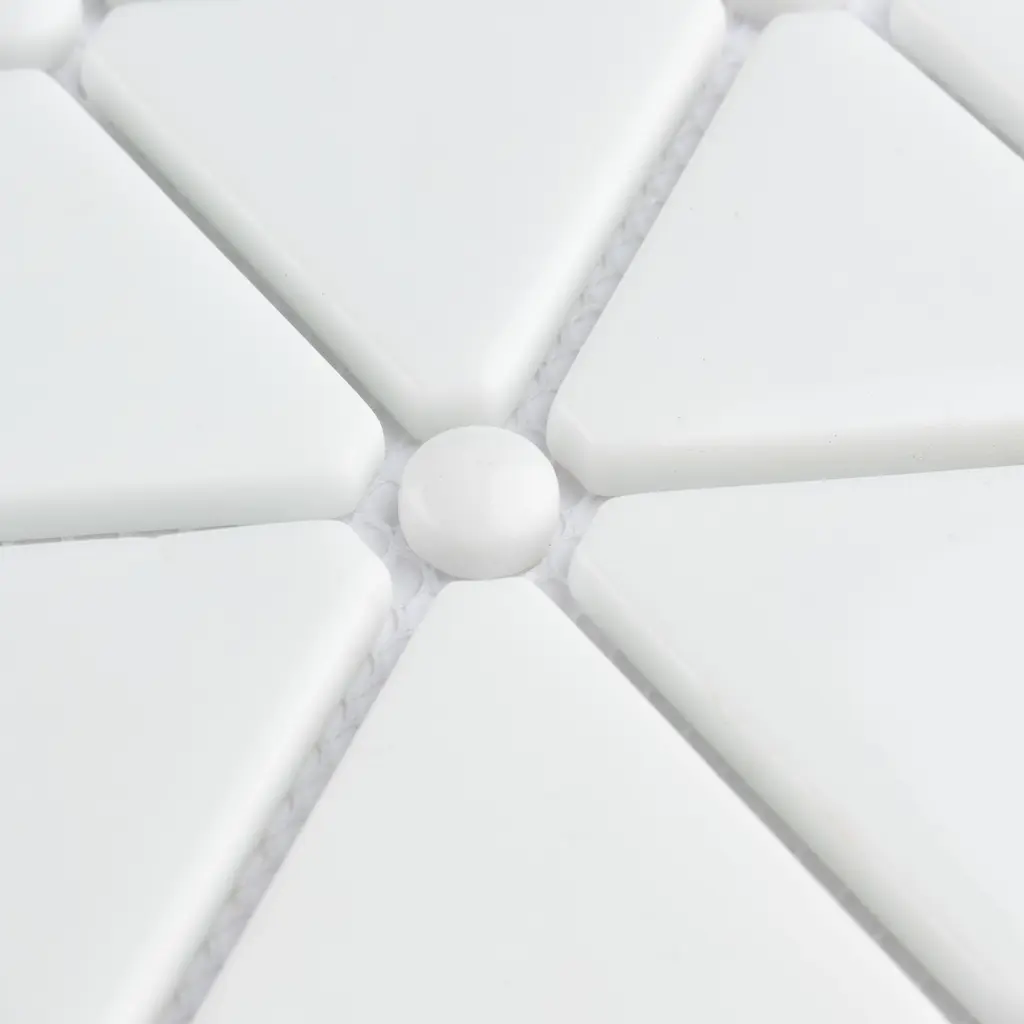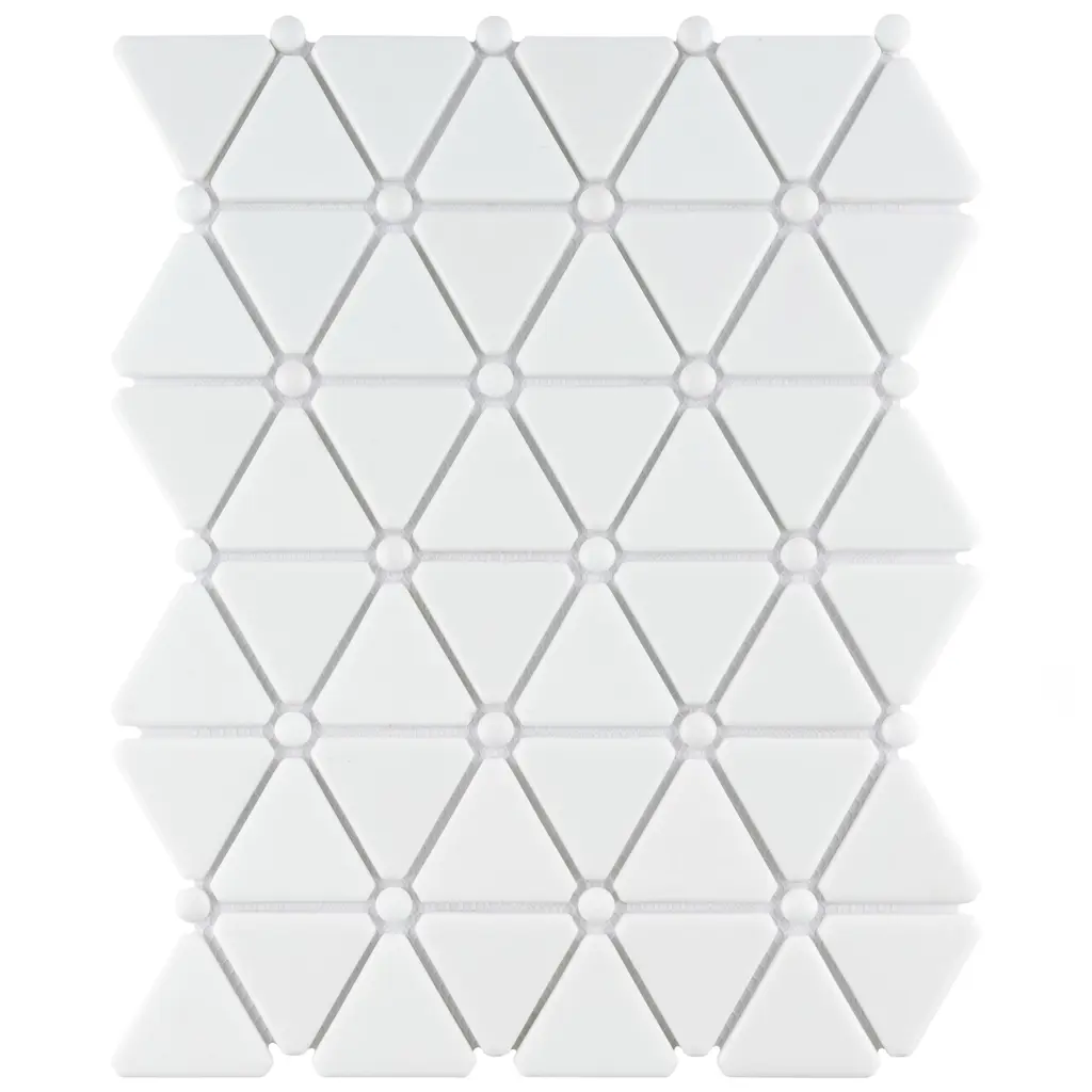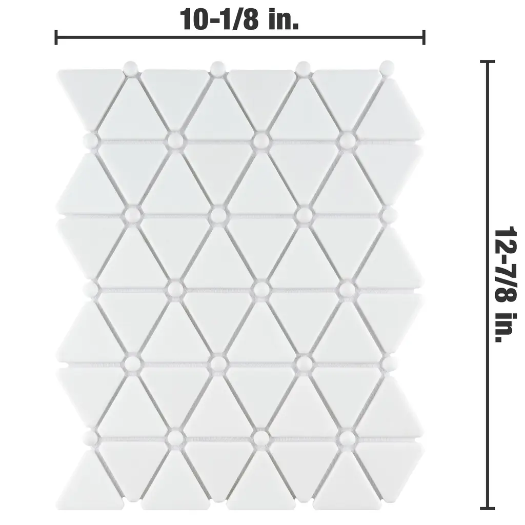 Our Expressions Treux White Glass Mosaic Tile is made of recycled pressed glass. Alternating triangles are accented with small buttons and feature a stunning mixed finish for added dimension. With characteristics of unglazed porcelain tile, this mosaic is impervious and frost resistant. These mesh-mounted tiles offer a high durability rating that is great for any interior or exterior space. Tile is the better choice for your space. This tile is made from natural ingredients, making it a healthy choice as it is free from allergens, VOCs, formaldehyde and PVC. 0.93 square foot per piece, each piece sold individually. Piece weight equals 2.65 lbs. Grade 1, first-quality glass tile for floor and wall use 10.13 in. width x 12.88 in. length x 0.27 in. thick mesh-mounted mosaic Unglazed, smooth finish with a mixed finish and uniform appearance in tone PEI Rating IV has high resistance to abrasion and is suitable for heavy-duty residential and commercial kitchens, hotels, exhibition and sales rooms with some dirt conditions Impervious tiles have a water absorption of less than 0.5% for indoor and outdoor use and are frost resistant This tile has a COF wet rating less than or equal to 0.50 and is considered to have a marginally low skid resistance. This tile is not ADA approved for slip resistance. Completely frost resistant for indoor or outdoor applications; use a latex-modified thinset for acceptable bond strength ImportedPlease note: A sample of this product may be a partial piece cut from the full size tile in order to provide an affordable and convenient way for customers to judge the quality and finish of this item. Samples are not returnable.