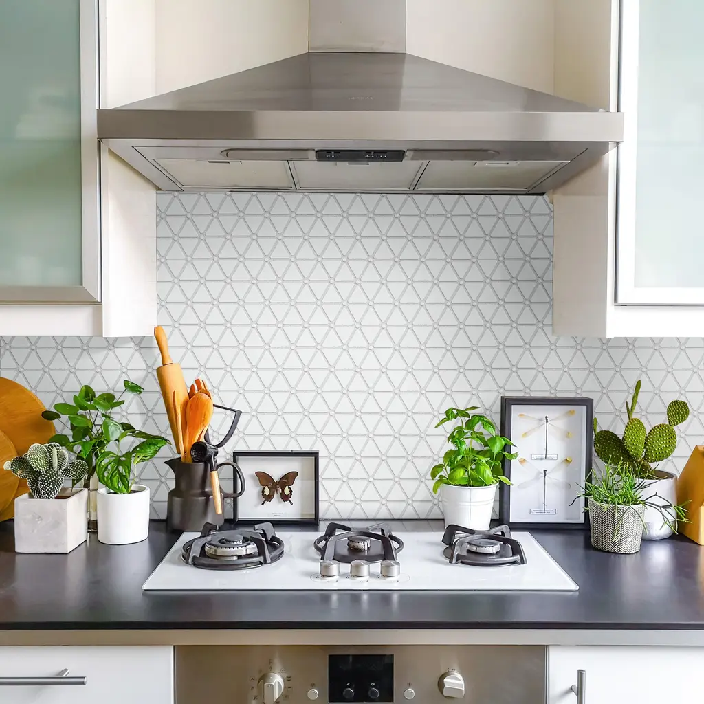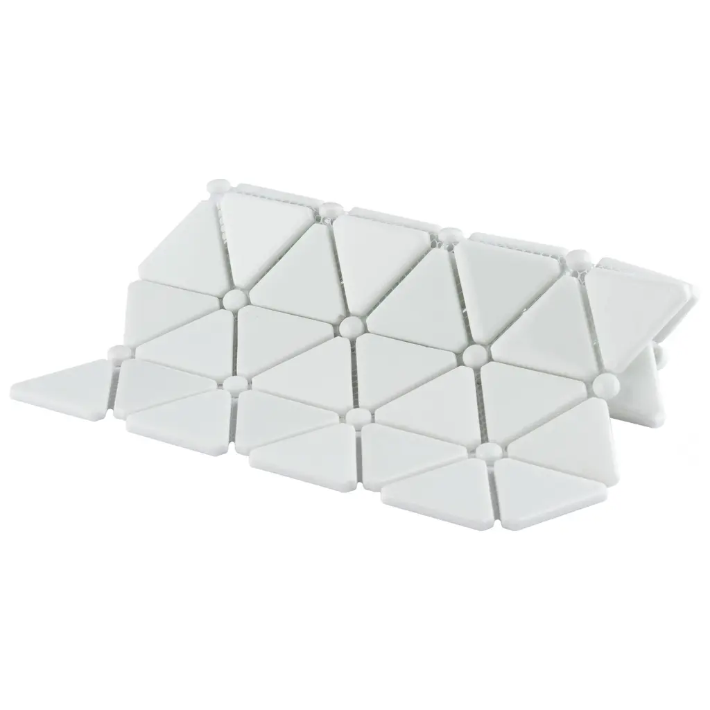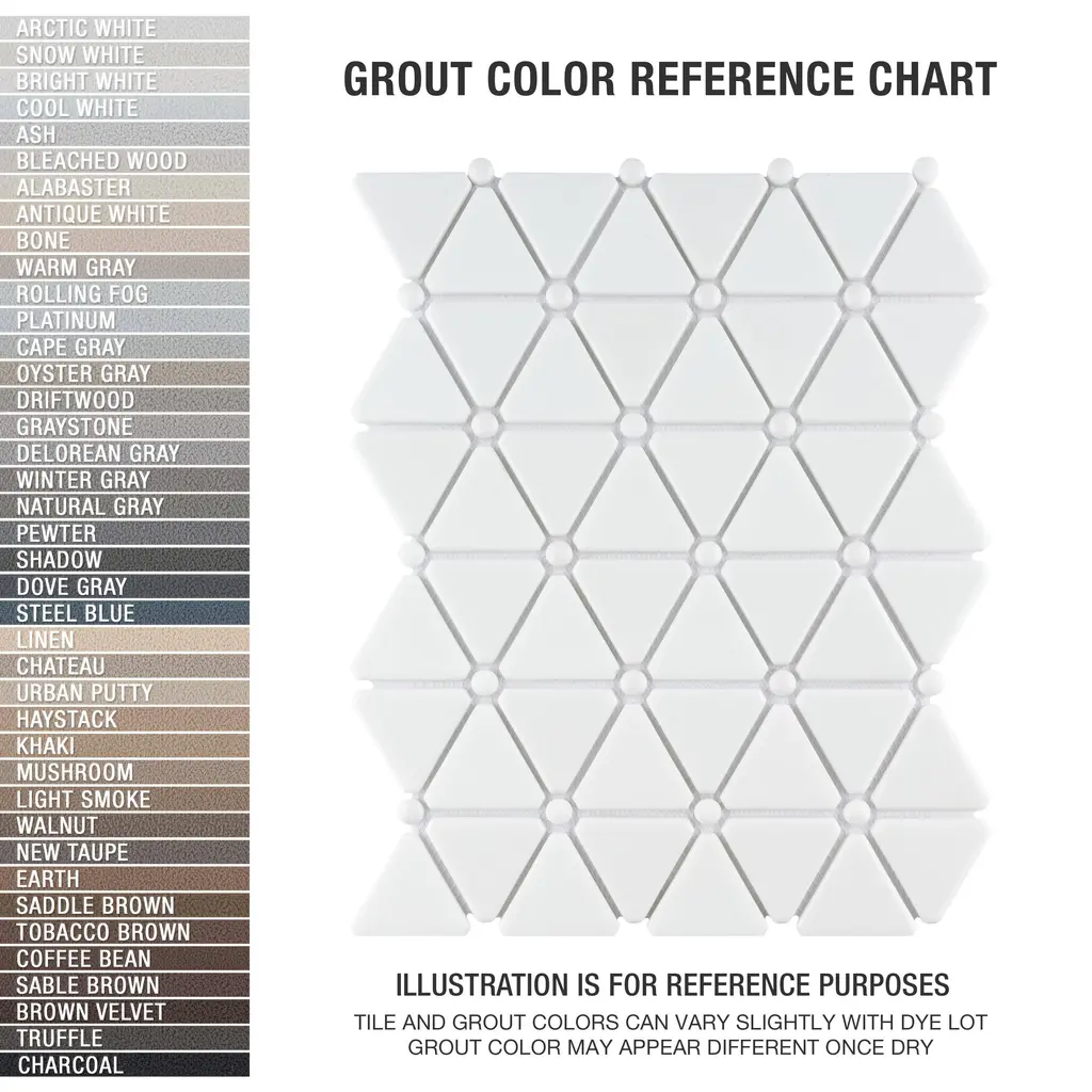Our Expressions Treux White Glass Mosaic Tile is made of recycled pressed glass. Alternating triangles are accented with small buttons and feature a stunning mixed finish for added dimension. With characteristics of unglazed porcelain tile, this mosaic is impervious and frost resistant. These mesh-mounted tiles offer a high durability rating that is great for any interior or exterior space. Tile is the better choice for your space. This tile is made from natural ingredients, making it a healthy choice as it is free from allergens, VOCs, formaldehyde and PVC. 0.93 square foot per piece, each piece sold individually. Piece weight equals 2.65 lbs. Grade 1, first-quality glass tile for floor and wall use 10.13 in. width x 12.88 in. length x 0.27 in. thick mesh-mounted mosaic Unglazed, smooth finish with a mixed finish and uniform appearance in tone PEI Rating IV has high resistance to abrasion and is suitable for heavy-duty residential and commercial kitchens, hotels, exhibition and sales rooms with some dirt conditions Impervious tiles have a water absorption of less than 0.5% for indoor and outdoor use and are frost resistant This tile has a COF wet rating less than or equal to 0.50 and is considered to have a marginally low skid resistance. This tile is not ADA approved for slip resistance. Completely frost resistant for indoor or outdoor applications; use a latex-modified thinset for acceptable bond strength ImportedPlease note: A sample of this product may be a partial piece cut from the full size tile in order to provide an affordable and convenient way for customers to judge the quality and finish of this item. Samples are not returnable.