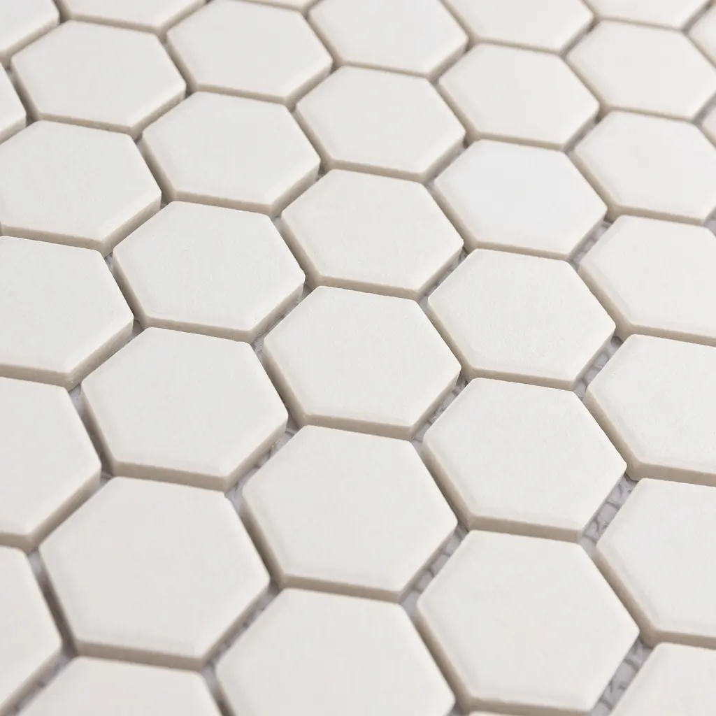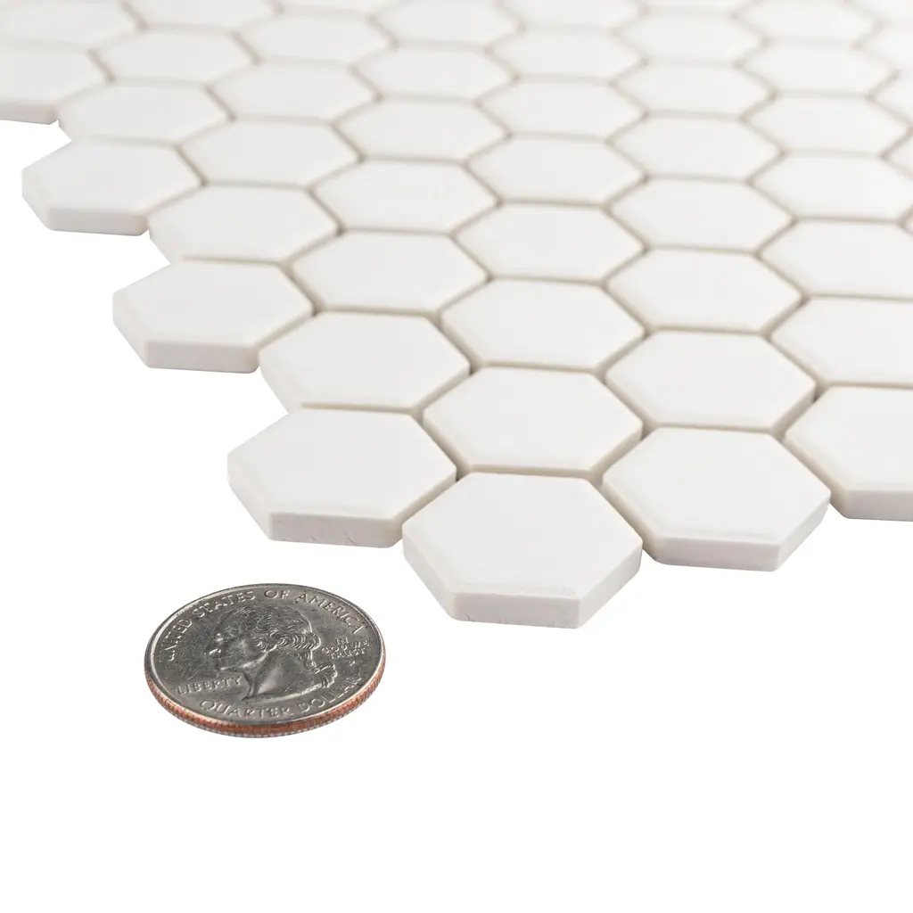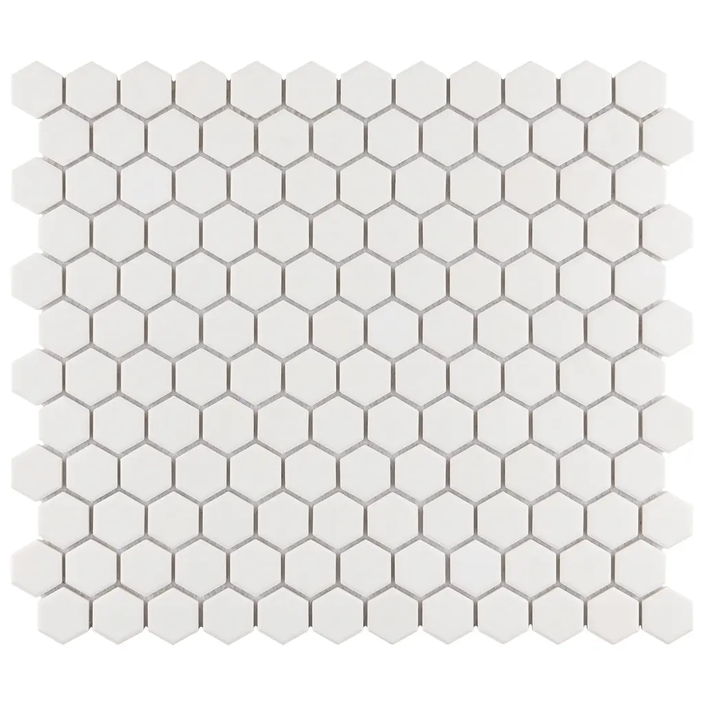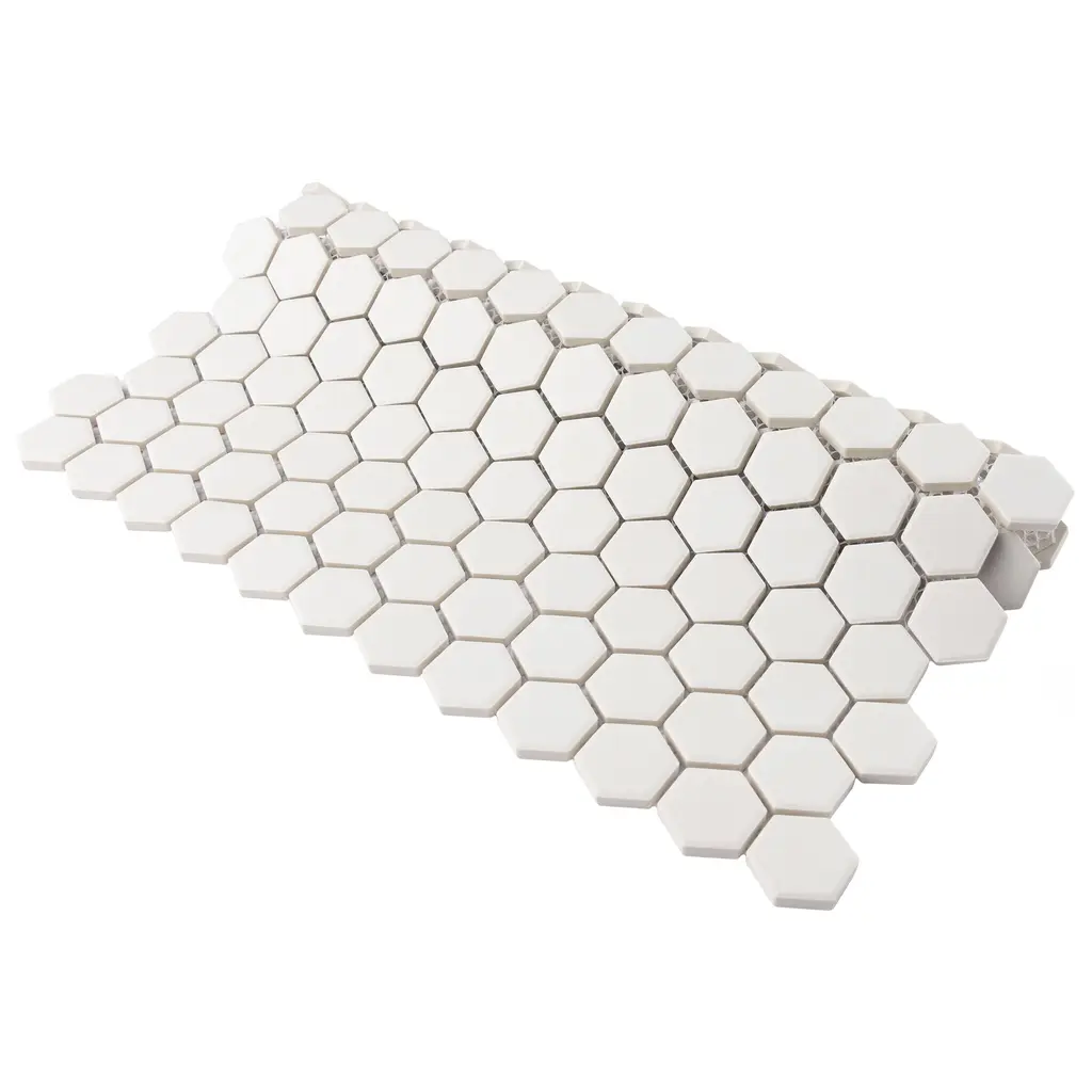 Transform your space into a tribute to retro design with our Gotham 1" Hex White Unglazed Porcelain Mosaic Tile. As a modern deviation from the classic mosaic, this fresh option is a throwback to traditional retro design with a contemporary feel. Unglazed white hexagons are arranged on an interlocking mesh to create a seamless installation. This minimalistic geometric porcelain mosaic is unique yet simplistic enough to integrate into any design, ranging from traditional style renovations to modern home projects. Its impervious, frost-proof and ADA compliant features make this an ideal tile for both commercial and residential indoor and outdoor use, including backsplashes, bathrooms, showers, kitchens and entryways. Tile is the better choice for your space. This tile is made from natural ingredients, making it a healthy choice as it is free from allergens, VOCs, formaldehyde and PVC. Note: Due to the unglazed nature, we recommend sealing this tile. 8.6 square feet, 10 pieces per case. Case weight is 18.73 lbs. Grade 1, first-quality porcelain tile for floor and wall use 10.25 in. width x 11.88 in. length x 0.25 in. thick mesh-mounted mosaic Unglazed, slightly textured finish with a low sheen and uniform appearance in tone PEI Rating IV has high resistance to abrasion and is suitable for heavy-duty residential and commercial kitchens, hotels, exhibition and sales rooms with some dirt conditions Impervious tiles have a water absorption of less than 0.5% for indoor and outdoor use and are frost resistant This tile is ADA approved for slip resistance with a DCOF value of 0.42 or higher. Completely frost resistant for indoor or outdoor applications; use a latex-modified thinset for acceptable bond strength Please note: A sample of this product may be a partial piece cut from the full size tile in order to provide an affordable and convenient way for customers to judge the quality and finish of this item. Samples are not returnable.