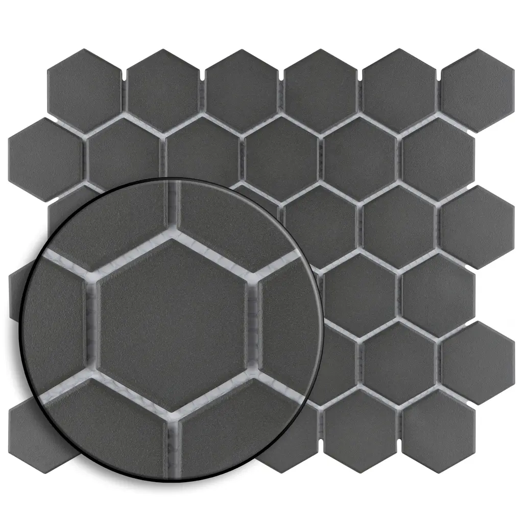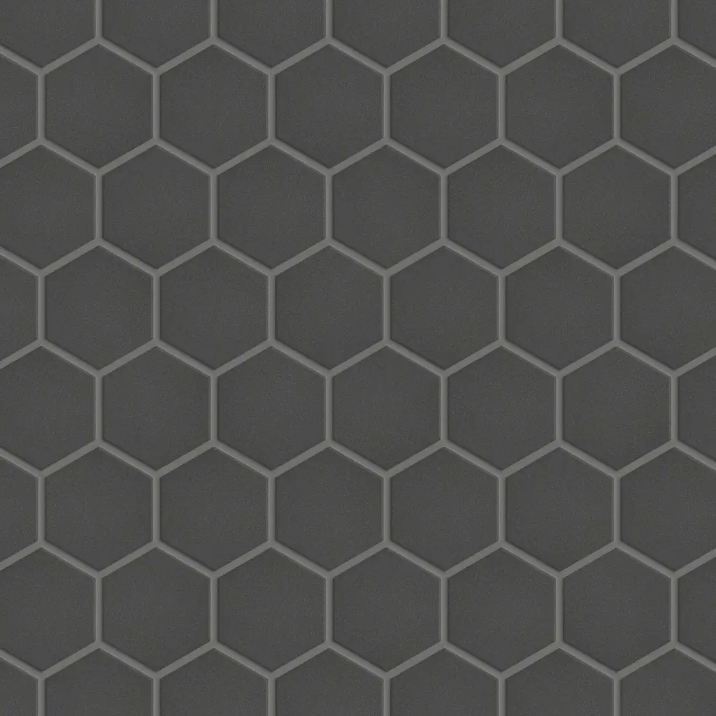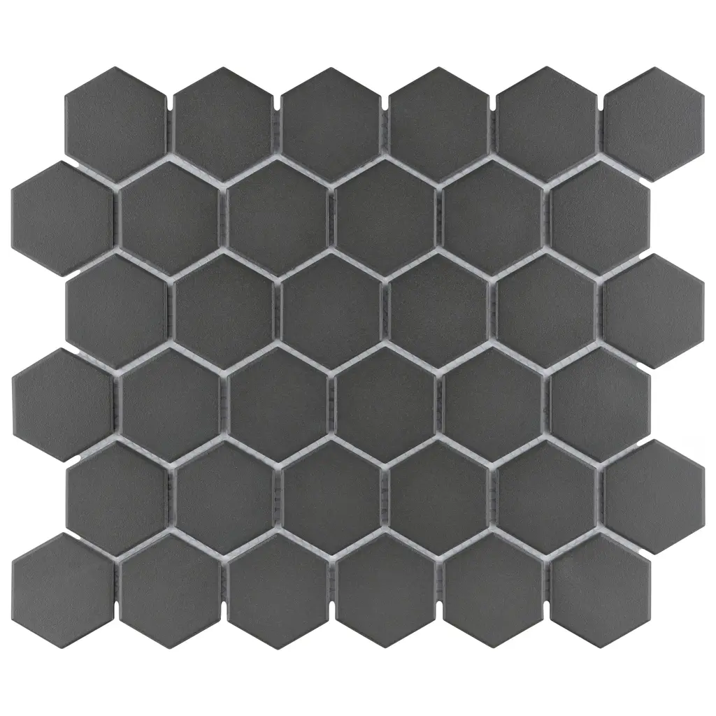 Transform your space into a tribute to retro design with our Gotham 2" Hex Black Unglazed Porcelain Floor and Wall Mosaic Tile. As a modern deviation from the classic mosaic, this enlarged fresh option is a throwback to traditional retro design with a contemporary feel. Unglazed charcoal black hexagons are arranged on an interlocking mesh to create a seamless installation. This minimalistic geometric porcelain mosaic is unique yet simplistic enough to integrate into any design, ranging from traditional style renovations to modern home projects. Its impervious and durable features make this an ideal tile for both commercial and residential indoor and outdoor use, including backsplashes, bathrooms, showers, kitchens, fireplace facades, patios and entryways. Tile is the better choice for your space. This tile is made from natural ingredients, making it a healthy choice as it is free from allergens, VOCs, formaldehyde and PVC. Note: Due to the unglazed nature, we recommend sealing this tile. 10.0 square feet, 10 pieces per case. Case weight is 24.65 lbs. Grade 1, first-quality porcelain tile for floor and wall use 11.13 in. width x 12.63 in. length x 0.25 in. thick mesh-mounted mosaic Unglazed, rough textured finish with a low sheen and uniform appearance in tone PEI Rating IV has high resistance to abrasion and is suitable for heavy-duty residential and commercial kitchens, hotels, exhibition and sales rooms with some dirt conditions Impervious tiles have a water absorption of less than 0.5% for indoor and outdoor use and are frost resistant This tile is ADA approved for slip resistance with a DCOF value of 0.42 or higher. Completely frost resistant for indoor or outdoor applications; use a latex-modified thinset for acceptable bond strength Please note: A sample of this product may be a partial piece cut from the full size tile in order to provide an affordable and convenient way for customers to judge the quality and finish of this item. Samples are not returnable.