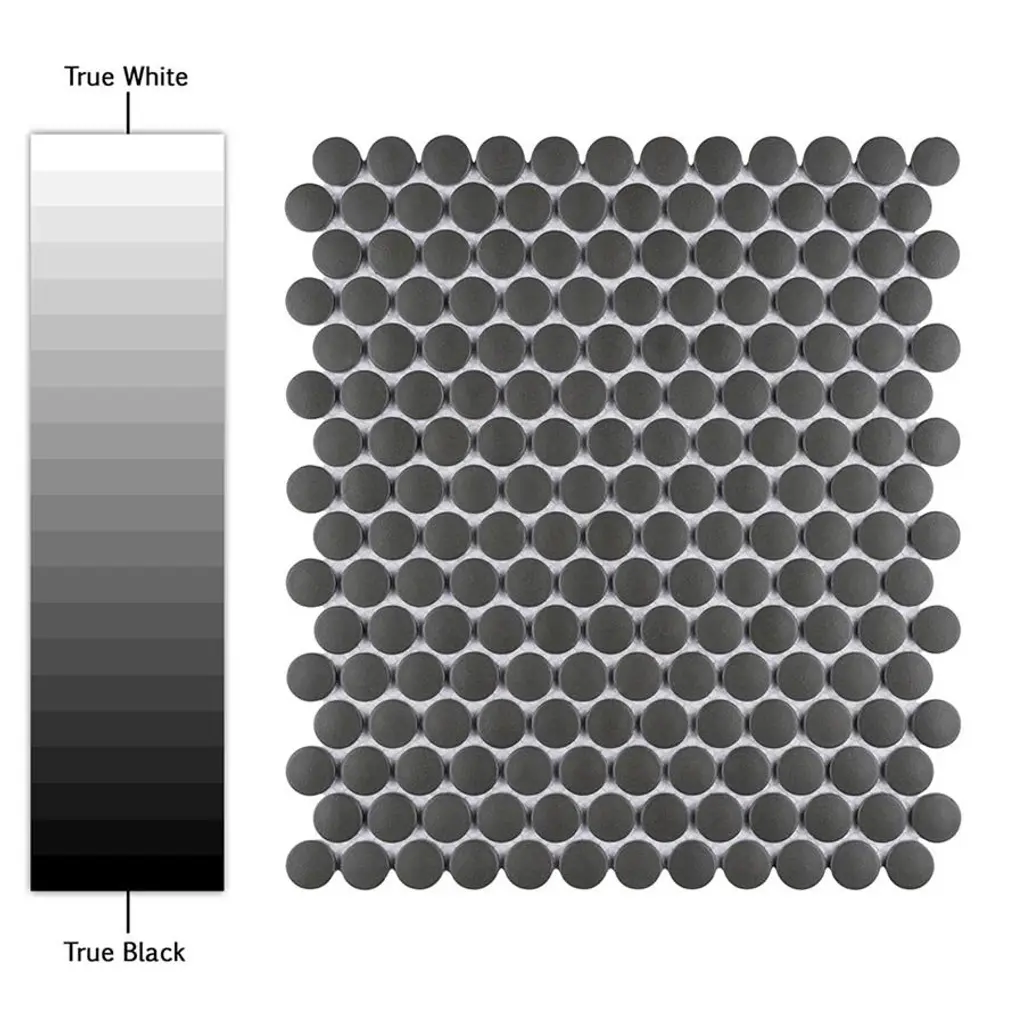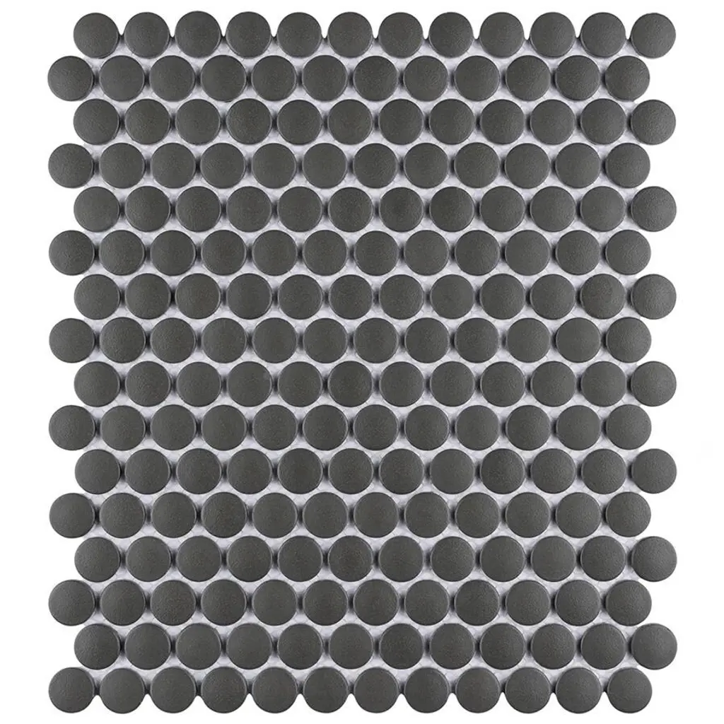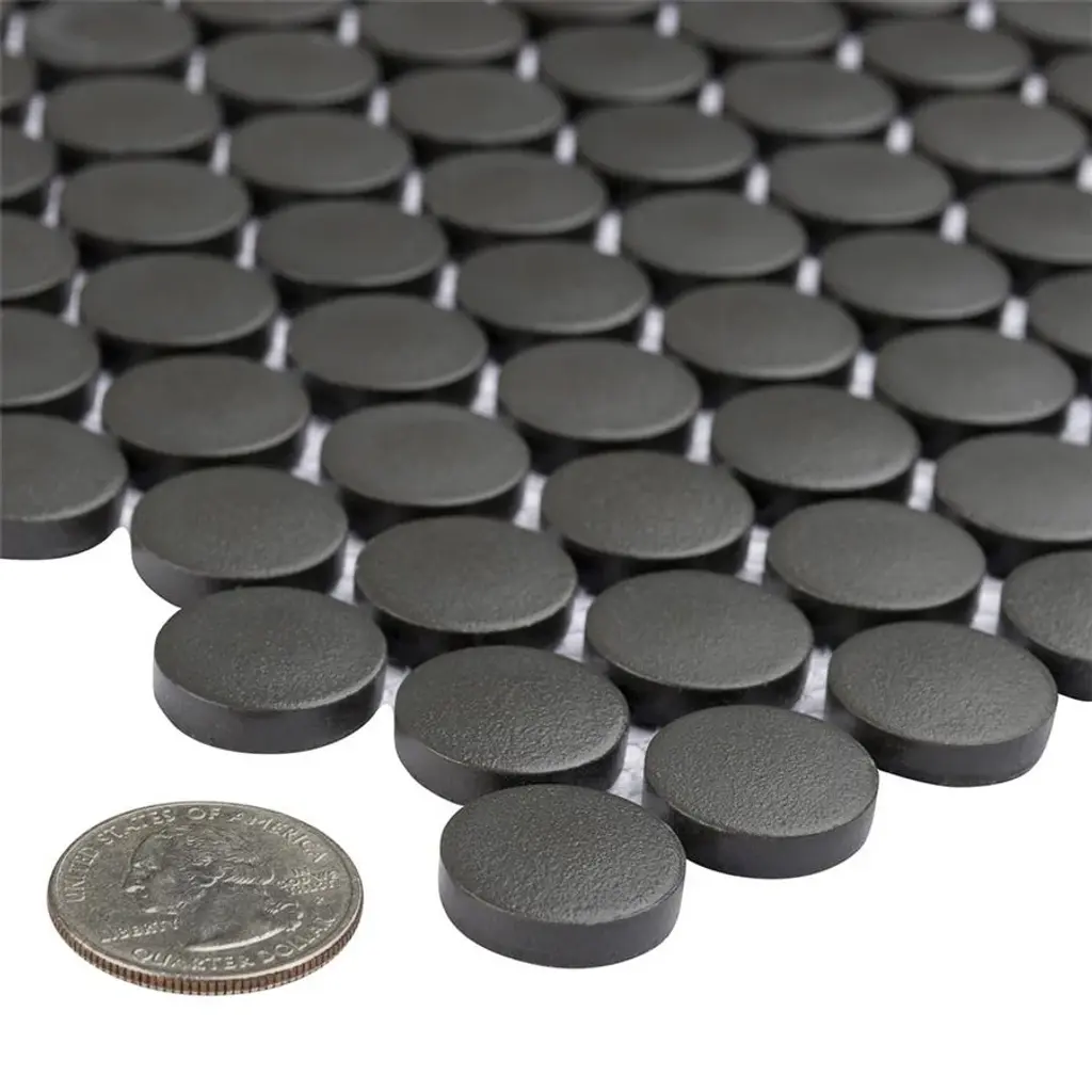 Transform your space into a tribute to retro design with our Gotham Penny Round Black 9-3/4" x 11-1/2" Unglazed Porcelain Mosaic Tile. As a modern deviation from the classic mosaic, this fresh option is a throwback to traditional retro design with a contemporary feel. Unglazed charcoal black penny rounds are arranged on an interlocking mesh to create a seamless installation. This minimalistic porcelain mosaic is unique yet simplistic enough to integrate into any design, ranging from traditional style renovations to modern home projects. Its impervious and frost-proof features make this an ideal tile for both commercial and residential indoor and outdoor use, including backsplashes, bathrooms, showers, kitchens and entryways. Tile is the better choice for your space. This tile is made from natural ingredients, making it a healthy choice as it is free from allergens, VOCs, formaldehyde and PVC. Note: Due to the unglazed nature, we recommend sealing this tile. 7.97 square feet, 10 pieces per case. Case weight is 18.73 lbs. Grade 1, first-quality porcelain tile for floor and wall use. 9.75 in. width x 11.5 in. length x 0.25 in. mm thick mesh-mounted mosaic. 0.88 in. W x 0.88 in. L pieces Sample Dimension: A sample of this product may be a partial piece cut from the full size tile in order to provide an affordable and convenient way for customers to judge the quality and finish of this item. Unglazed, slightly textured finish with a low sheen and uniform appearance in tone P.E.I. Rating IV has high resistance to abrasion and is suitable for heavy-duty residential and commercial kitchens, hotels, exhibition and sales rooms with some dirt conditions Impervious tiles have a water absorption of less than 0.5% for indoor and outdoor use and is frost resistant Completely frost resistant for indoor or outdoor applications; use a latex-modified thinset for acceptable bond strength Commercial and Residential usePlease note: A sample of this product may be a partial piece cut from the full size tile in order to provide an affordable and convenient way for customers to judge the quality and finish of this item. Samples are not returnable.