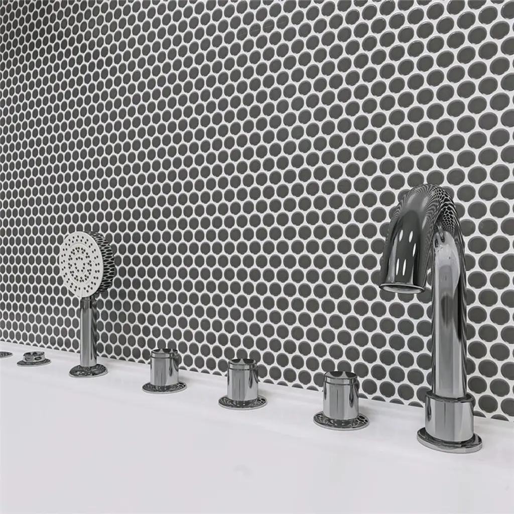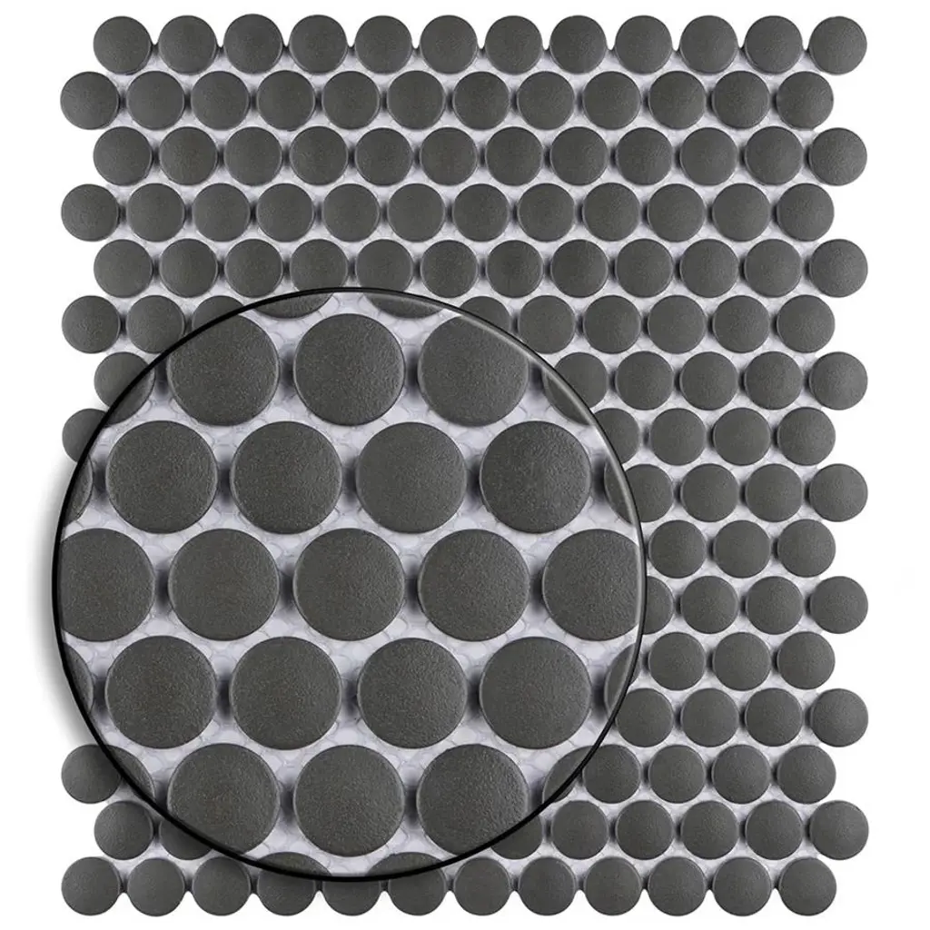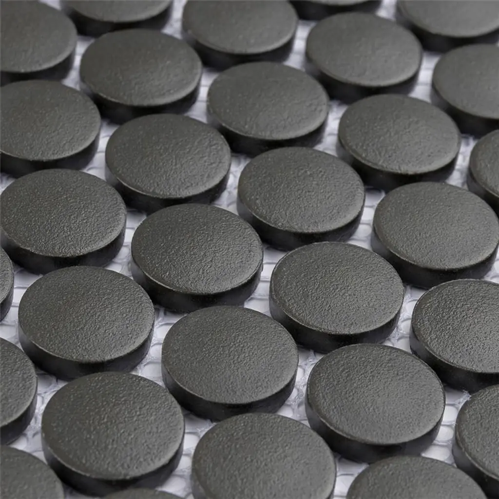 Transform your space into a tribute to retro design with our Gotham Penny Round Black 9-3/4" x 11-1/2" Unglazed Porcelain Mosaic Tile. As a modern deviation from the classic mosaic, this fresh option is a throwback to traditional retro design with a contemporary feel. Unglazed charcoal black penny rounds are arranged on an interlocking mesh to create a seamless installation. This minimalistic porcelain mosaic is unique yet simplistic enough to integrate into any design, ranging from traditional style renovations to modern home projects. Its impervious and frost-proof features make this an ideal tile for both commercial and residential indoor and outdoor use, including backsplashes, bathrooms, showers, kitchens and entryways. Tile is the better choice for your space. This tile is made from natural ingredients, making it a healthy choice as it is free from allergens, VOCs, formaldehyde and PVC. Note: Due to the unglazed nature, we recommend sealing this tile. 7.97 square feet, 10 pieces per case. Case weight is 18.73 lbs. Grade 1, first-quality porcelain tile for floor and wall use. 9.75 in. width x 11.5 in. length x 0.25 in. mm thick mesh-mounted mosaic. 0.88 in. W x 0.88 in. L pieces Sample Dimension: A sample of this product may be a partial piece cut from the full size tile in order to provide an affordable and convenient way for customers to judge the quality and finish of this item. Unglazed, slightly textured finish with a low sheen and uniform appearance in tone P.E.I. Rating IV has high resistance to abrasion and is suitable for heavy-duty residential and commercial kitchens, hotels, exhibition and sales rooms with some dirt conditions Impervious tiles have a water absorption of less than 0.5% for indoor and outdoor use and is frost resistant Completely frost resistant for indoor or outdoor applications; use a latex-modified thinset for acceptable bond strength Commercial and Residential usePlease note: A sample of this product may be a partial piece cut from the full size tile in order to provide an affordable and convenient way for customers to judge the quality and finish of this item. Samples are not returnable.
