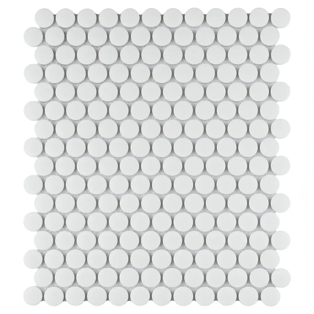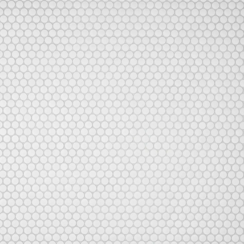 Transform your space into a tribute to retro design with our Gotham Penny Round White Unglazed Porcelain Mosaic Tile. As a modern deviation from the classic mosaic, this fresh option is a throwback to traditional retro design with a contemporary feel. Unglazed white penny rounds are arranged on an interlocking mesh to create a seamless installation. This minimalistic porcelain mosaic is unique yet simplistic enough to integrate into any design, ranging from traditional style renovations to modern home projects. Its impervious, frost-proof and ADA compliant features make this an ideal tile for both commercial and residential indoor and outdoor use, including backsplashes, bathrooms, showers, kitchens and entryways. Tile is the better choice for your space. This tile is made from natural ingredients, making it a healthy choice as it is free from allergens, VOCs, formaldehyde and PVC. Note: Due to the unglazed nature, we recommend sealing this tile. 8.0 square feet, 10 pieces per case. Case weight is 18.73 lbs. Grade 1, first-quality porcelain tile for floor and wall use 9.75 in. width x 11.5 in. length x 0.25 in. thick mesh-mounted mosaic Unglazed, slightly textured finish with a low sheen and uniform appearance in tone PEI Rating IV has high resistance to abrasion and is suitable for heavy-duty residential and commercial kitchens, hotels, exhibition and sales rooms with some dirt conditions Impervious tiles have a water absorption of less than 0.5% for indoor and outdoor use and are frost resistant This tile is ADA approved for slip resistance with a DCOF value of 0.42 or higher. Completely frost resistant for indoor or outdoor applications; use a latex-modified thinset for acceptable bond strength Please note: A sample of this product may be a partial piece cut from the full size tile in order to provide an affordable and convenient way for customers to judge the quality and finish of this item. Samples are not returnable.
