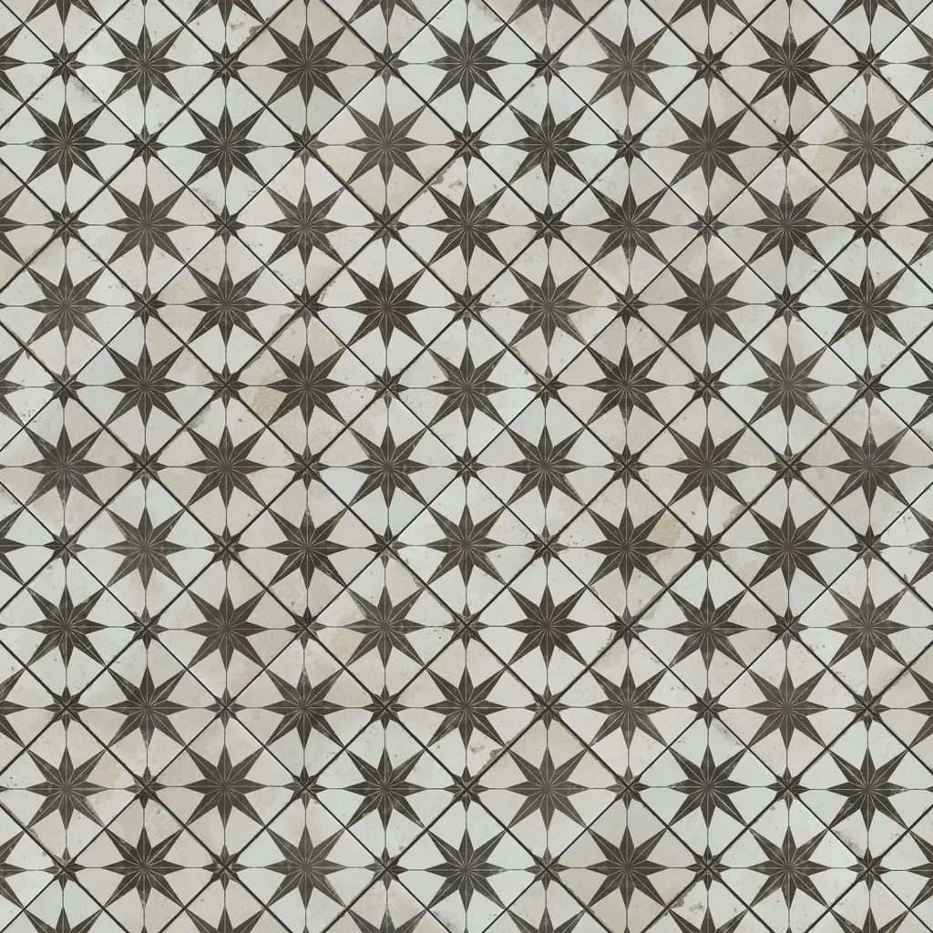 Our Harmonia Kings Star Nero Ceramic Floor and Wall Tile creates the look of a stunning leading-edge mosaic-like design with the harmonious, easy installation of a square tile. Inspired by our best-selling Kings Star Nero, this ceramic encaustic-inspired tile similarly features a unique, low-sheen glaze in faded antique white tones with centered charcoal black star patterns in each square. With realistic imitations and scuffs and spots that are the marks of well-loved, worn, century-old tile, this floor and wall tile is a true reflection of vintage industrial design. These scuffs and spots convince that this tile is truly aged, bringing rustic charm to any interior setting. Save time and labor spent arranging mosaic sheets and instead install these durable ceramic slabs, which have squares separated by scored grout lines. The scored grout lines can be grouted with the color of your choice to further customize your installation. Its glazed and durable features make it an ideal choice for both commercial and residential indoor installations including kitchens, bathrooms, backsplashes, showers, and entryways. Tile is the better choice for your space. This tile is made from natural ingredients, making it a healthy choice as it is free from allergens, VOCs, formaldehyde and PVC.