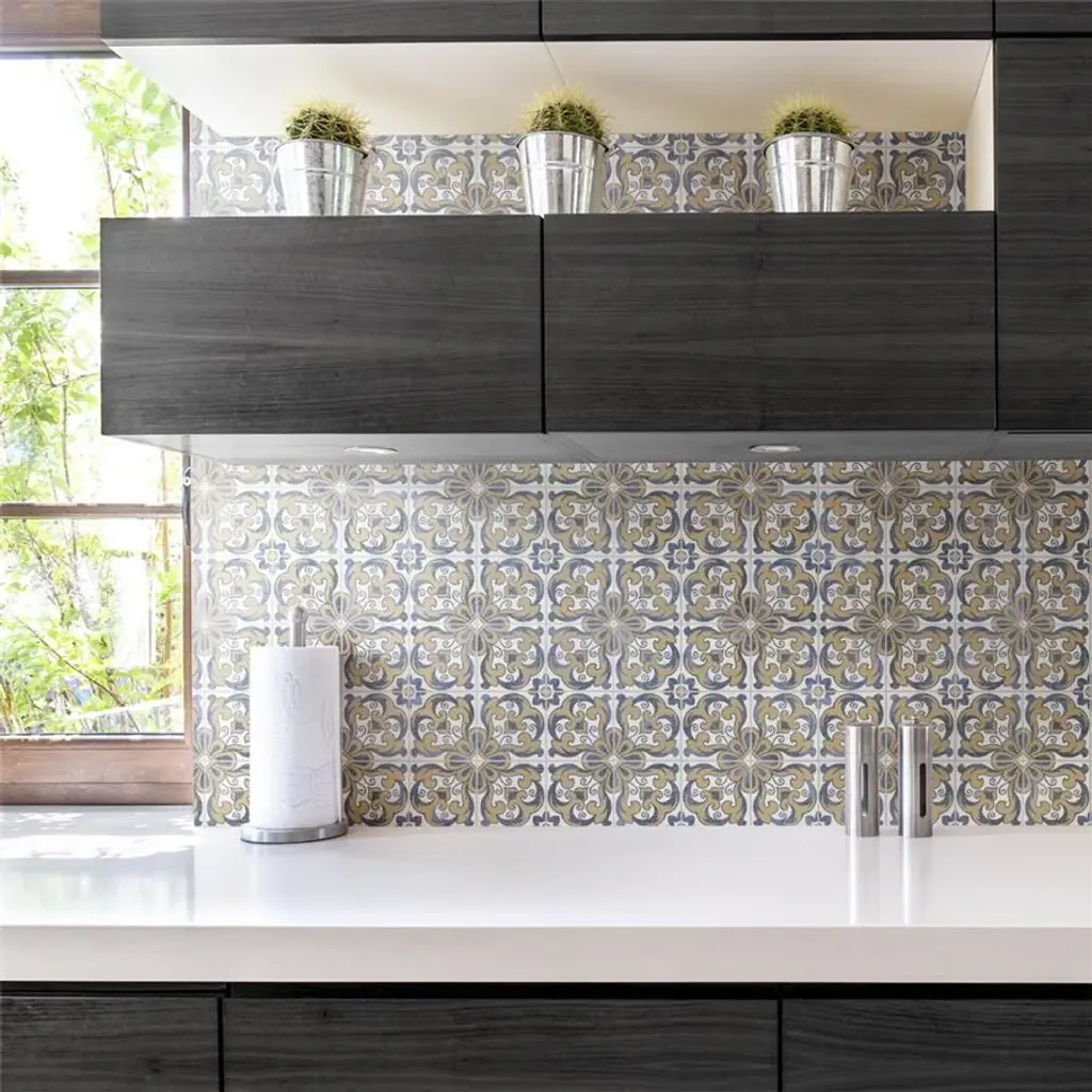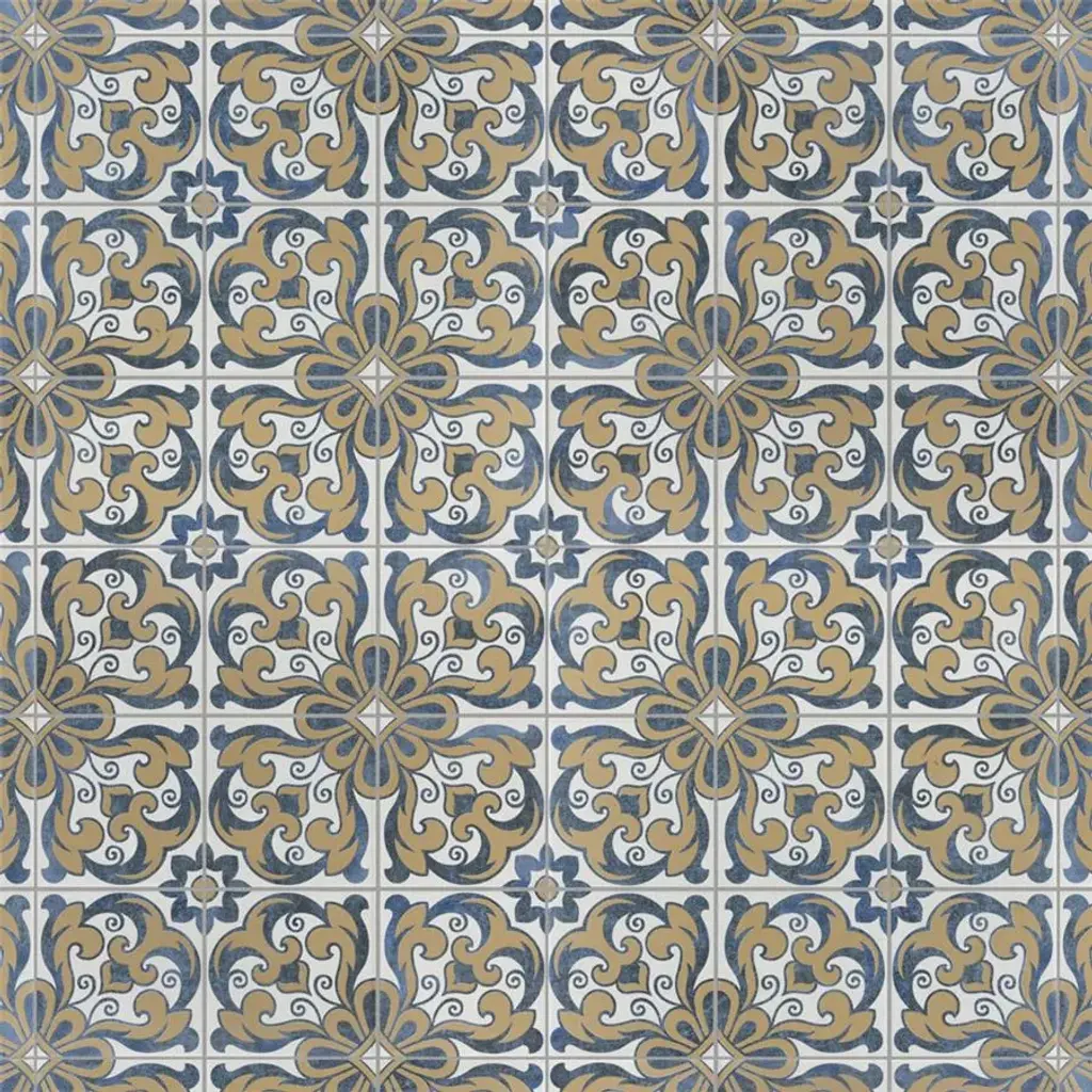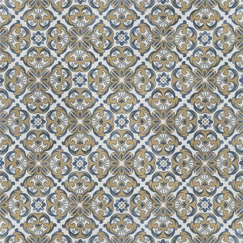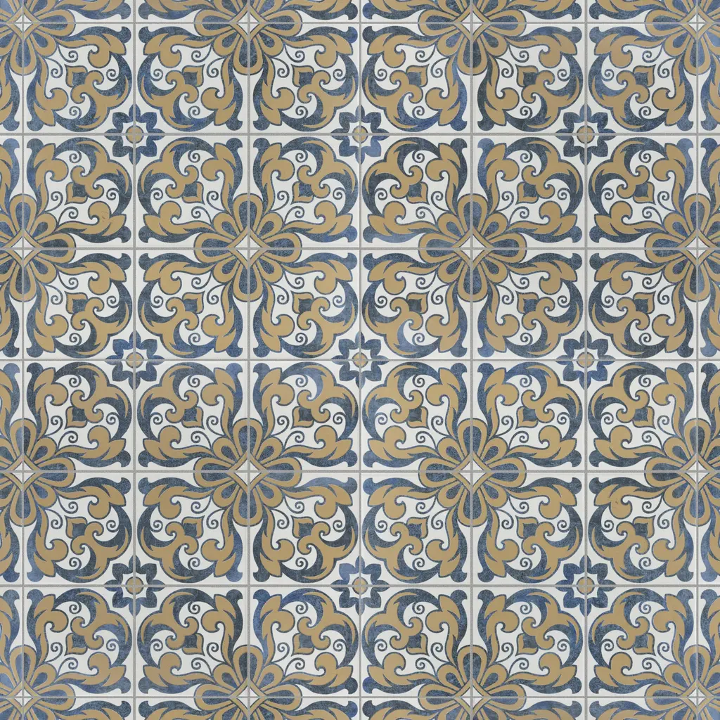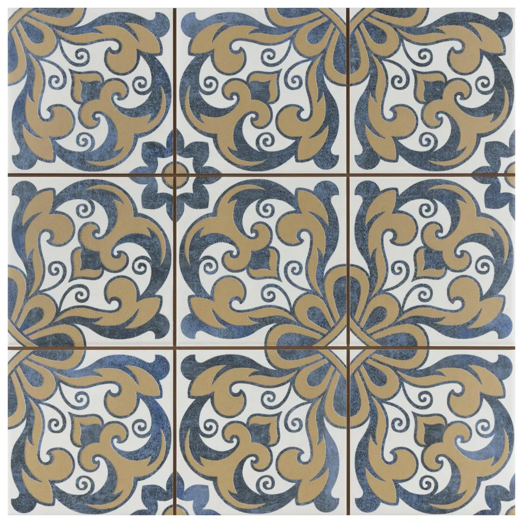 Our Harmonia Royal Bloom Ceramic Floor and Wall Tile creates the look of a stunning leading-edge mosaic-like design with the harmonious, easy installation of a square tile. This ceramic encaustic-inspired tile features floral old-world patterns in faded shades of tawny and denim blue. Set on the highest-quality snow white base glaze, the contrasting design features a weathered, speckled look, replicating the beauty of its cement muse. The floral pattern blends into virtually any design theme, making this an exceptional product for modern installations and historic renovations. Save time and labor spent arranging mosaic sheets and instead install these durable ceramic slabs, which have squares separated by scored grout lines. The scored grout lines can be grouted with the color of your choice to further customize your installation. Its glazed and durable features make it an ideal choice for both commercial and residential indoor installations including kitchens, bathrooms, backsplashes, showers, and entryways. Tile is the better choice for your space. This tile is made from natural ingredients, making it a healthy choice as it is free from allergens, VOCs, formaldehyde and PVC. 12.0 square feet, 10 pieces per case. Case weight is 51.1 lbs. Grade 1, first-quality ceramic tile for floor and wall use 13 in. width x 13 in. length x 0.37 in. thick Glazed, slightly textured finish with a low sheen and uniform appearance in tone PEI Rating IV has high resistance to abrasion and is suitable for heavy-duty residential and commercial kitchens, hotels, exhibition and sales rooms with some dirt conditions Semi-Vitreous tiles have water absorption of more than 3% but less than 7% for indoor use This tile is ADA approved for slip resistance with a DCOF value of 0.42 or higher. Not frost resistant Please note: A sample of this product may be a partial piece cut from the full size tile in order to provide an affordable and convenient way for customers to judge the quality and finish of this item. Samples are not returnable.