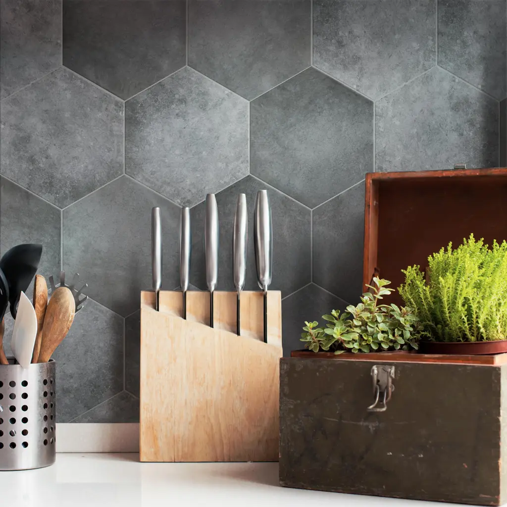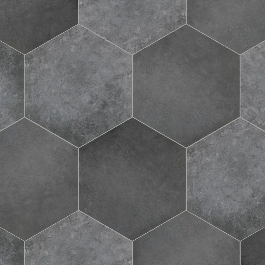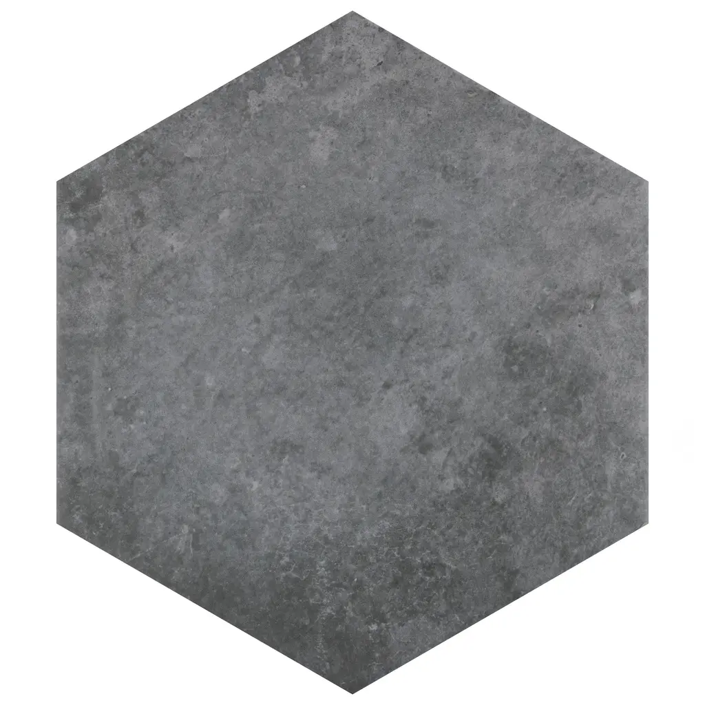 Capturing the rustic appearance of natural stone in a durable porcelain material, our Heritage Hex Carbon Porcelain Floor and Wall Tile brings the irreplaceable beauty of nature into any living space. This matte hexagon tile features natural mineral-like pattern variations in faded light and dark charcoal grey hues, replicating the appearance of aged stone. Composed of rich detail and a slightly textured surface, this unique porcelain tile offers decorative, rustic beauty through realistic scuffs and spots that are the marks of well-loved, worn, century-old tile. This trendsetting display of stone-look design is visually appealing and versatile, and blends beautifully with a range of styles from vintage industrial to modern day. Its impervious, frost-resistant and durable features make this an ideal choice for both commercial and residential indoor and outdoor installations including, kitchens, bathrooms, backsplashes, showers, hallways, entryways, patios and fireplace facades. Tile is the better choice for your space. This tile is made from natural ingredients, making it a healthy choice as it is free from allergens, VOCs, formaldehyde and PVC. 7.5 square feet, 25 pieces per case. Case weight is 28.99 lbs. Grade 1, first-quality porcelain tile for floor and wall use 7 in. width x 8 in. length x 0.35 in. thick Glazed, mixed texture with a mixed finish and moderate variation in tone PEI Rating IV has high resistance to abrasion and is suitable for heavy-duty residential and commercial kitchens, hotels, exhibition and sales rooms with some dirt conditions Impervious tiles have a water absorption of less than 0.5% for indoor and outdoor use and are frost resistant This tile is ADA approved for slip resistance with a DCOF value of 0.42 or higher. Completely frost resistant for indoor or outdoor applications; use a latex-modified thinset for acceptable bond strength Please note: A sample of this product may be a partial piece cut from the full size tile in order to provide an affordable and convenient way for customers to judge the quality and finish of this item. Samples are not returnable.