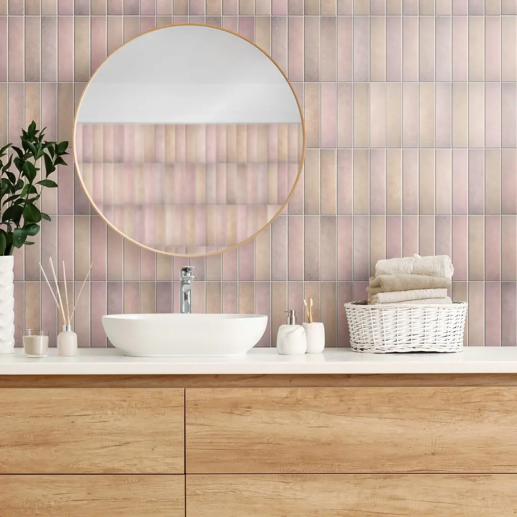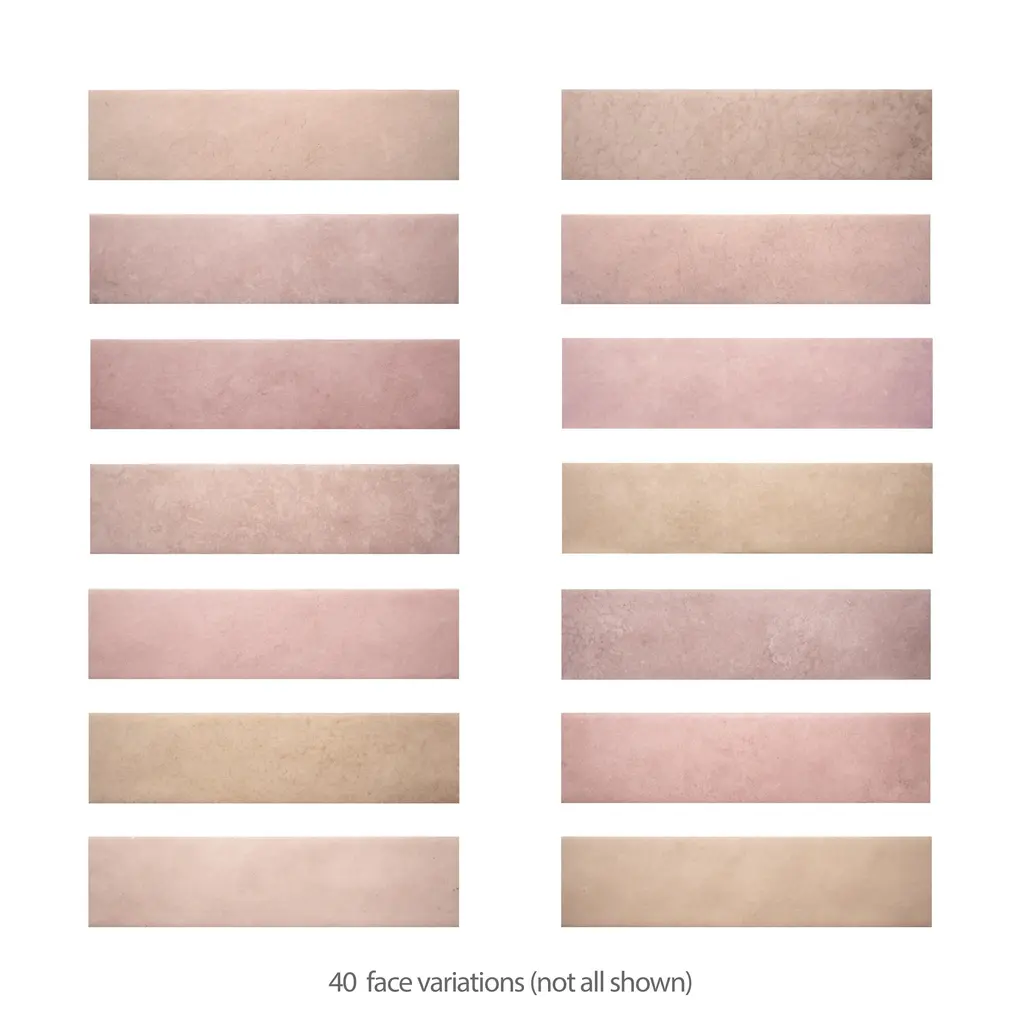 Modeling a stone look, our Heritage Rose Porcelain Floor and Wall Tile features a mixed textured finish, providing decorative appeal that adapts to a variety of stylistic contexts. Inspired by Earth’s clays, the Heritage Collection captures natural mineral warmth with 10% mixed glazing accents, creating light refraction and movement within a unique faux handmade stone-look for a modern rustic feel in any space. Containing 40 different print variations that are randomly distributed throughout each case, this pink rectangle tile offers a one-of-a-kind look. With its impervious, frost-resistant features, this tile is an ideal selection for both indoor and outdoor commercial and residential installations, including kitchens, bathrooms, backsplashes, showers, hallways, entryways, patios and fireplace facades. This tile is a perfect choice on its own or paired with other products in the Heritage Collection. Tile is the better choice for your space! 5.78 square feet, 34 pieces per case. Case weight is 20.4 lbs. Grade 1, first-quality porcelain tile for floor and wall use 2.38 in. width x 9.63 in. length x 0.35 in. thick Glazed, mixed texture with a mixed finish and moderate variation in tone PEI Rating IV has high resistance to abrasion and is suitable for heavy-duty residential and commercial kitchens, hotels, exhibition and sales rooms with some dirt conditions Impervious tiles have a water absorption of less than 0.5% for indoor and outdoor use and are frost resistant This tile is ADA approved for slip resistance with a DCOF value of 0.42 or higher. Completely frost resistant for indoor or outdoor applications; use a latex-modified thinset for acceptable bond strength Please note: A sample of this product may be a partial piece cut from the full size tile in order to provide an affordable and convenient way for customers to judge the quality and finish of this item. Samples are not returnable.